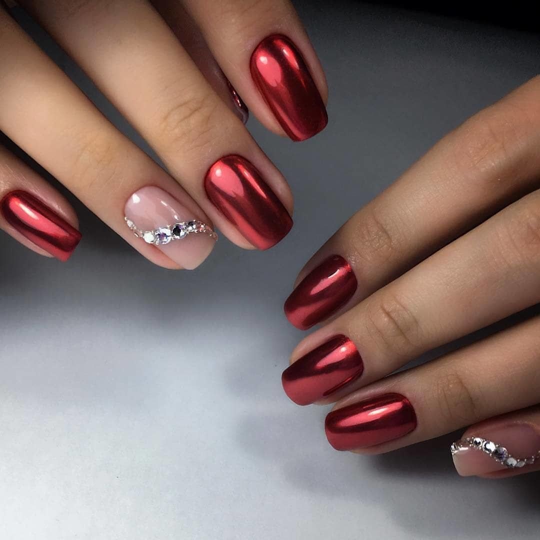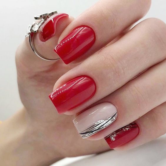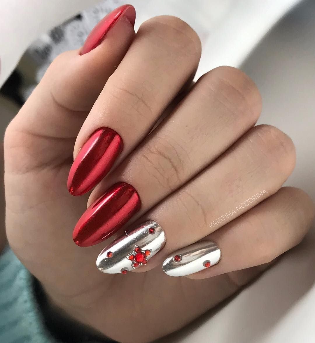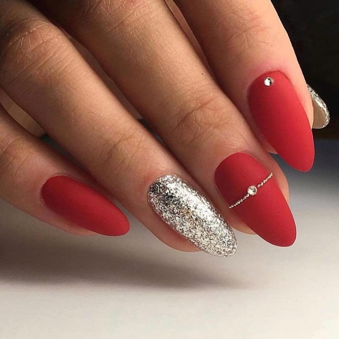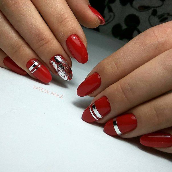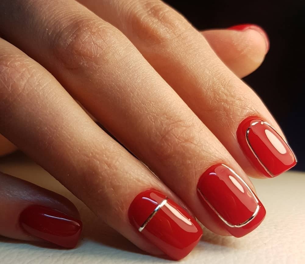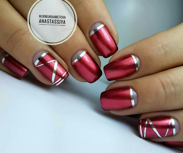 - серебро. Более холодный оттенок металла хорошо сочетается с холодными тонами красной палитры. Это не обязательно вечерний маникюр. Красный серебром, достойный выбор для дневного дизайна;