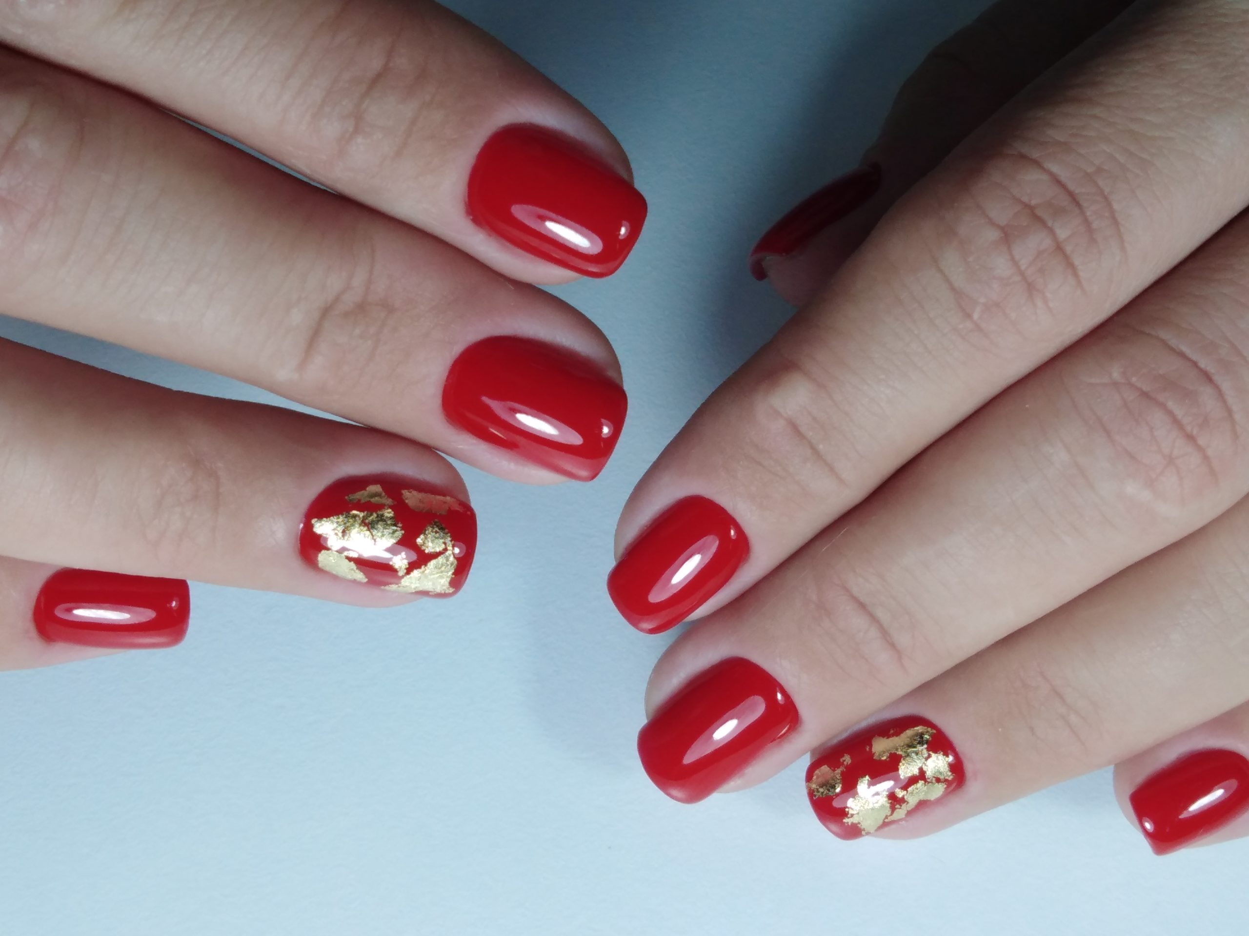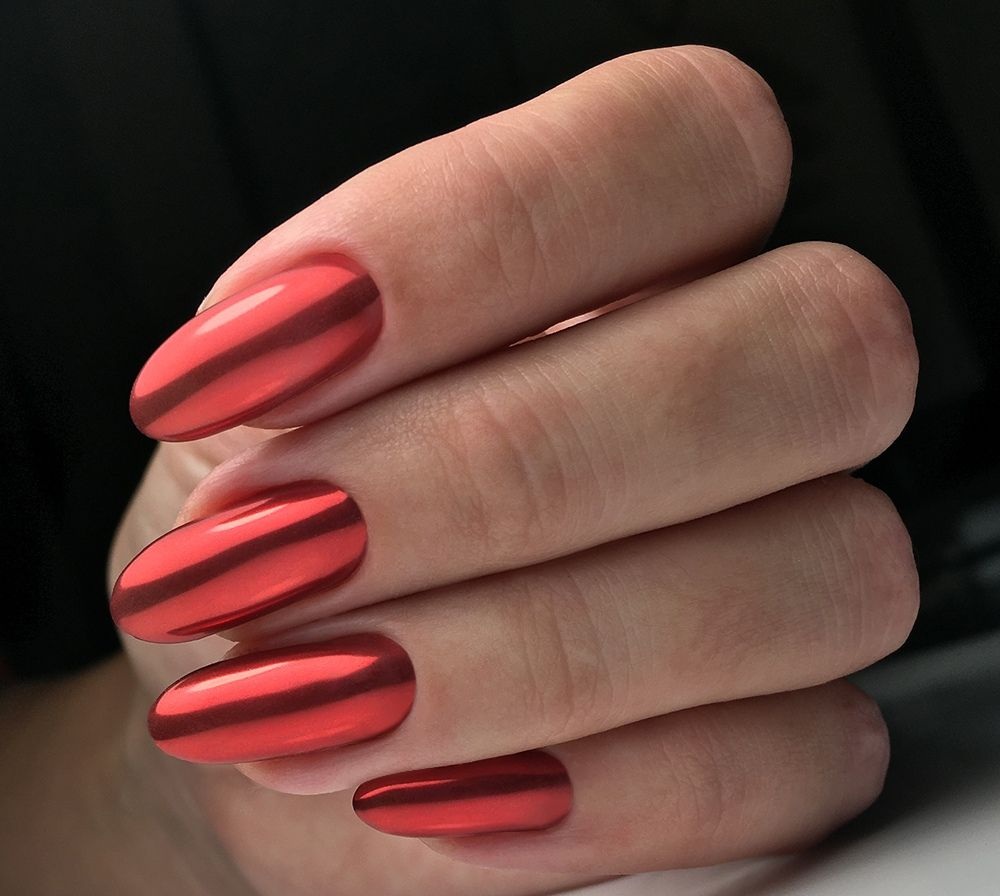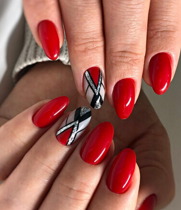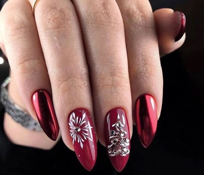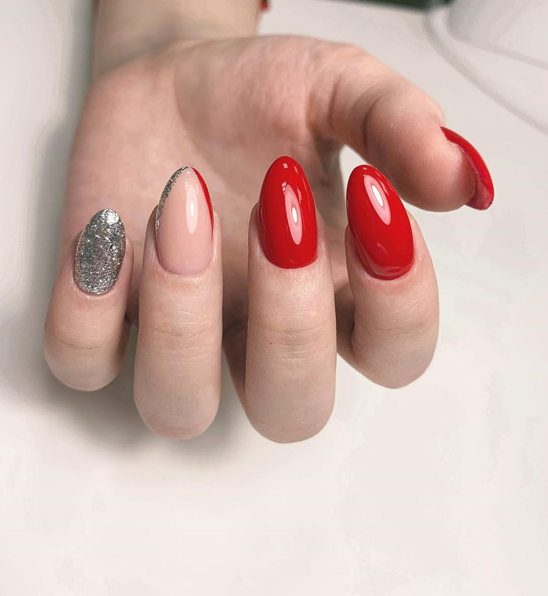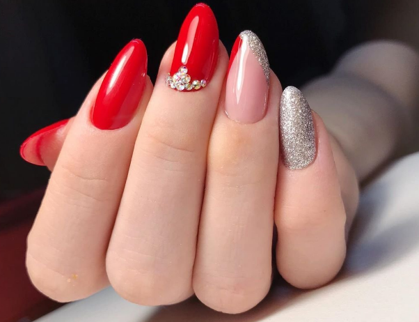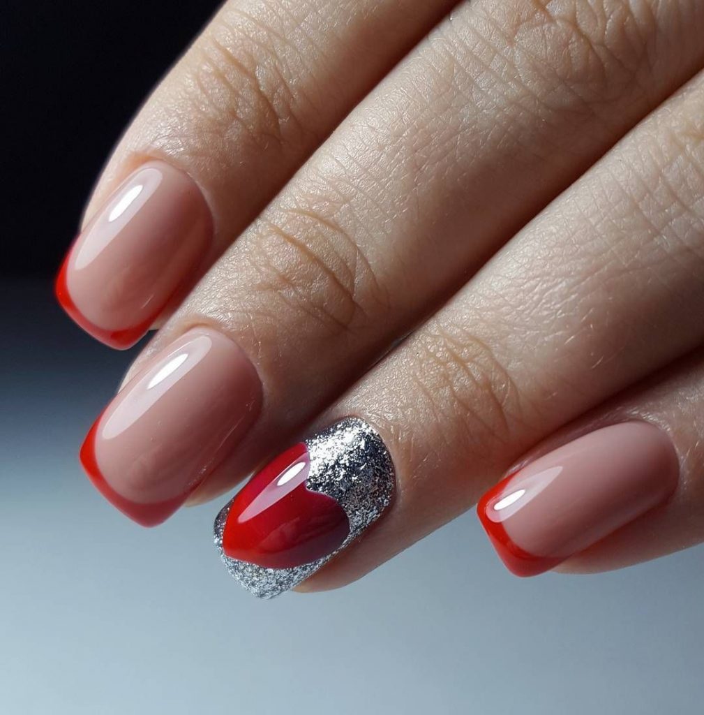 - серебро. Более холодный оттенок металла хорошо сочетается с холодными тонами красной палитры. Это не обязательно вечерний маникюр. Красный серебром, достойный выбор для дневного дизайна;