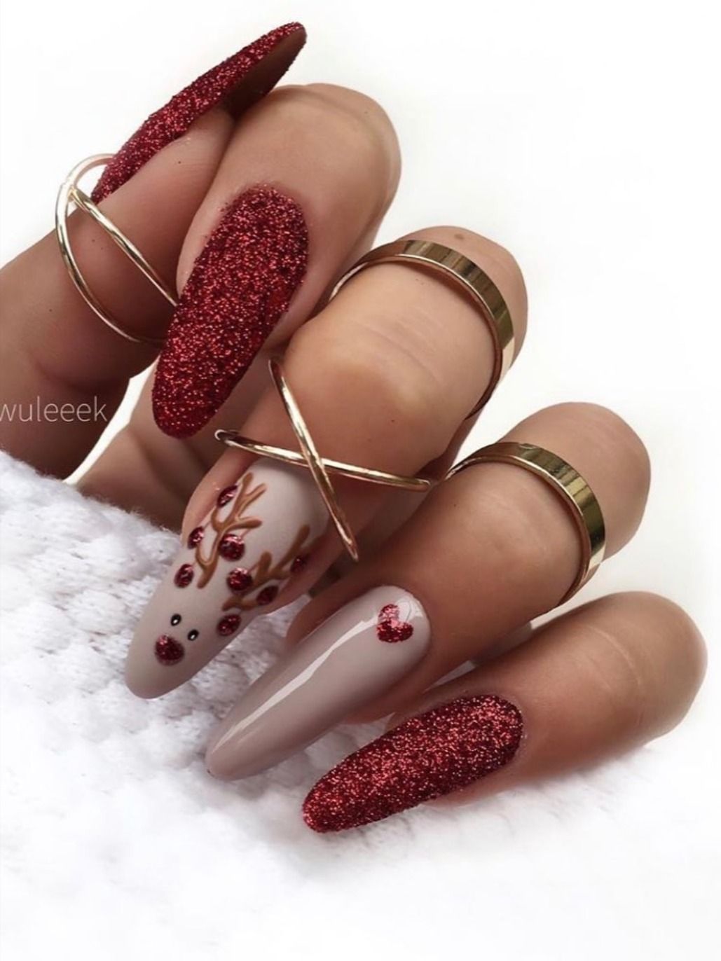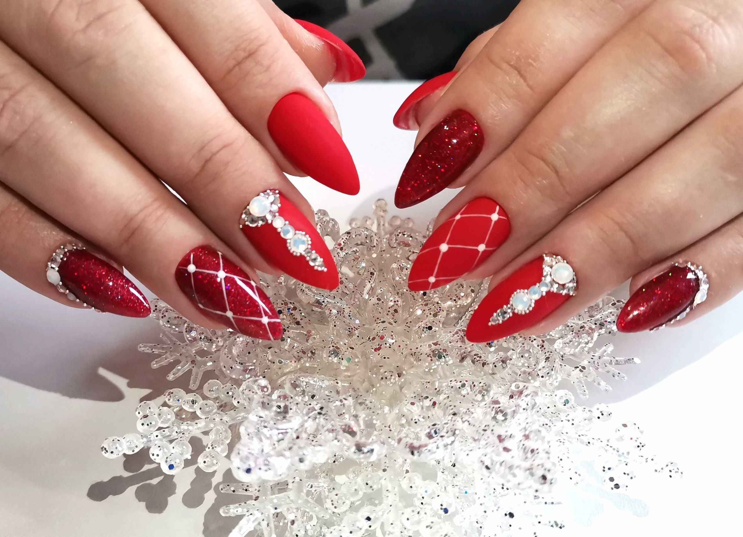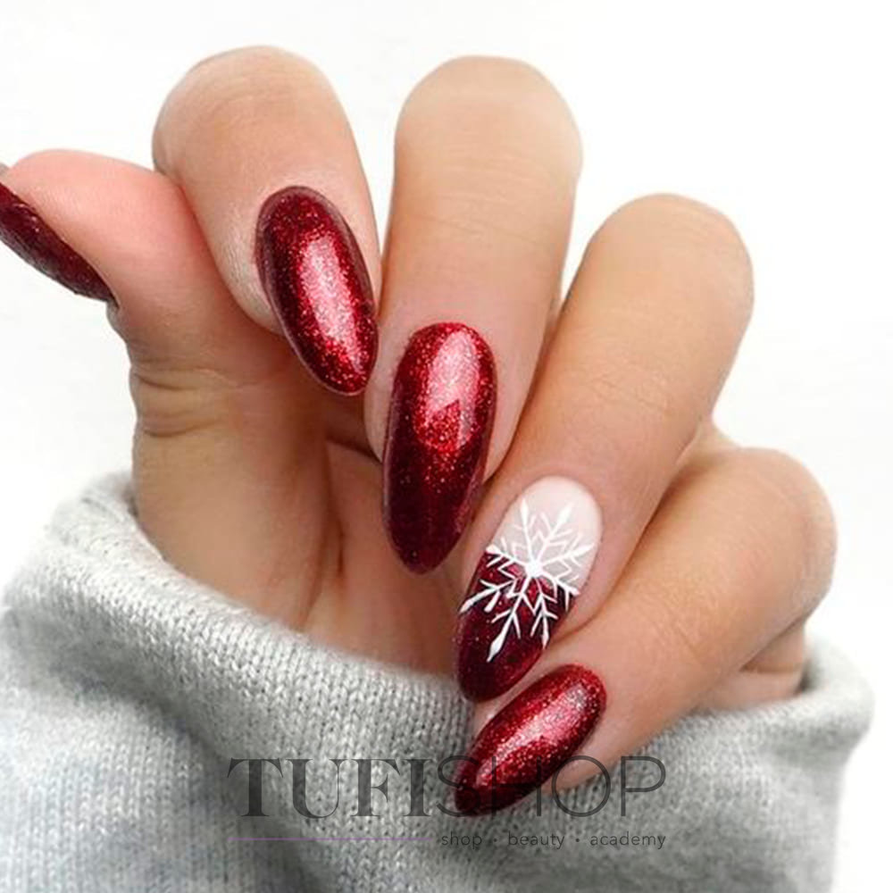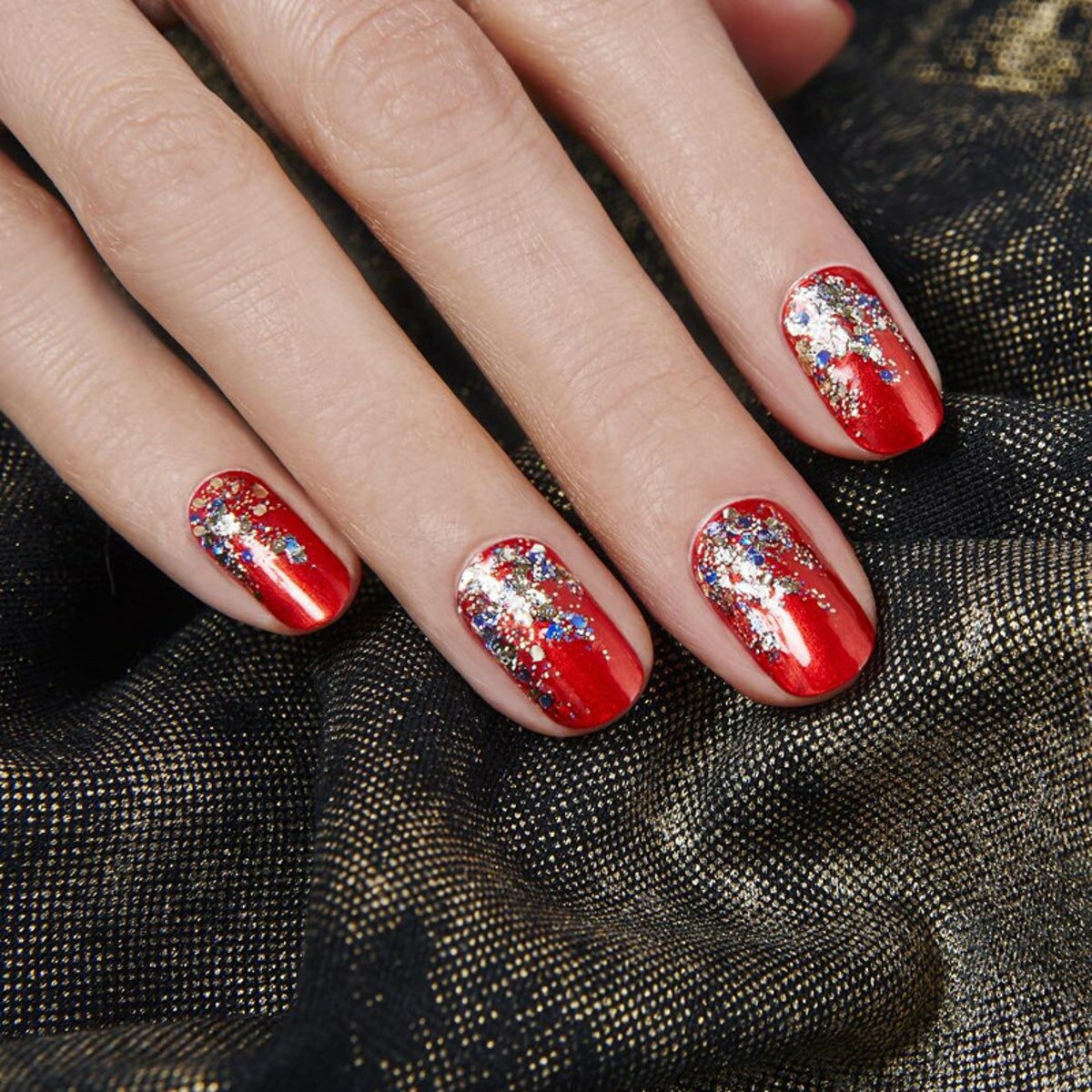 - серебро. Более холодный оттенок металла хорошо сочетается с холодными тонами красной палитры. Это не обязательно вечерний маникюр. Красный серебром, достойный выбор для дневного дизайна;