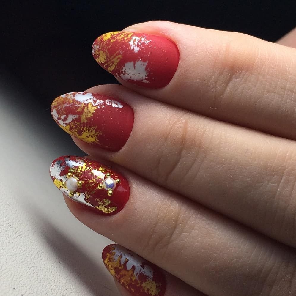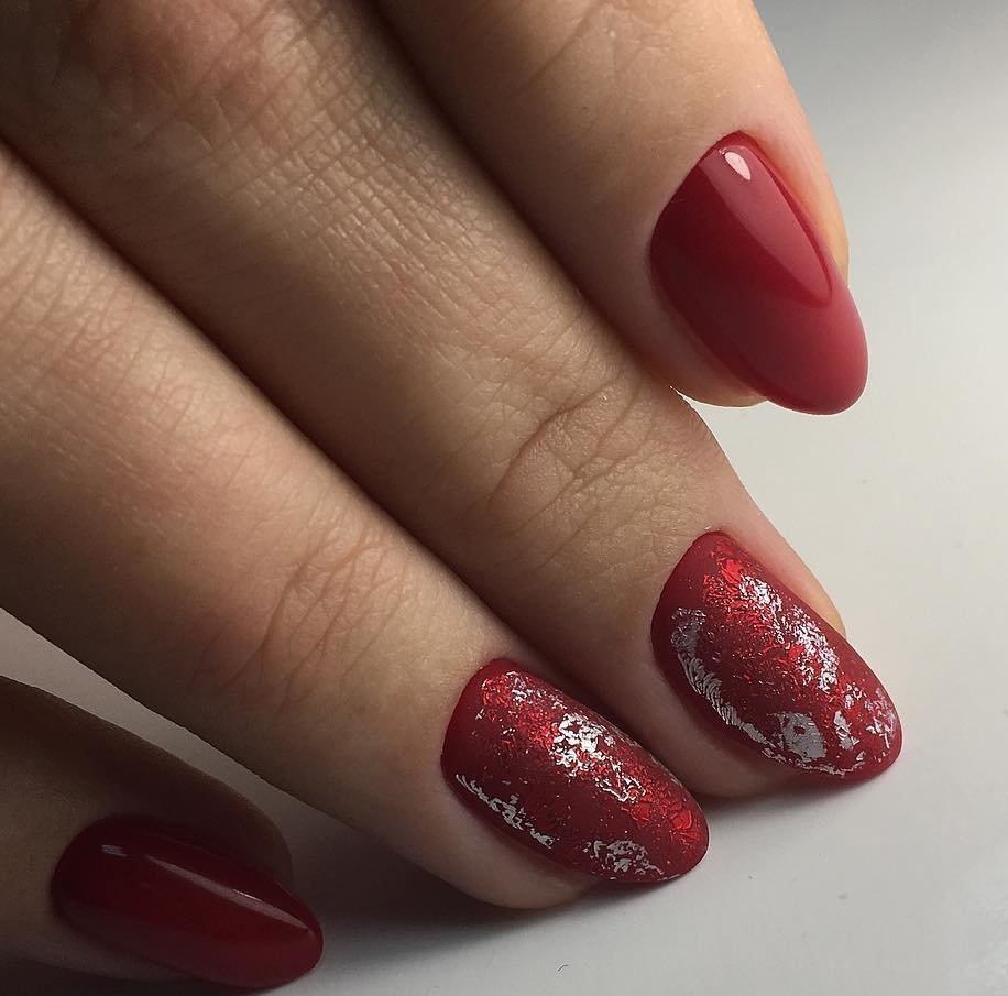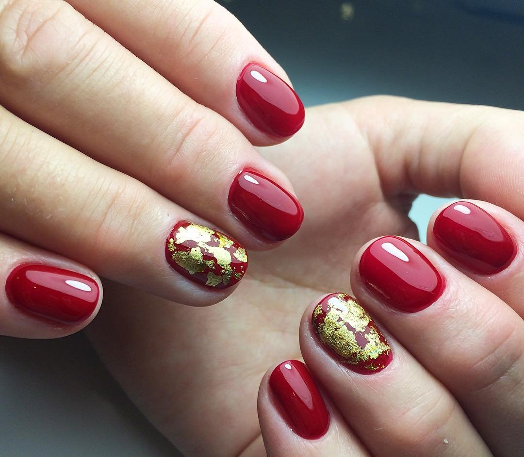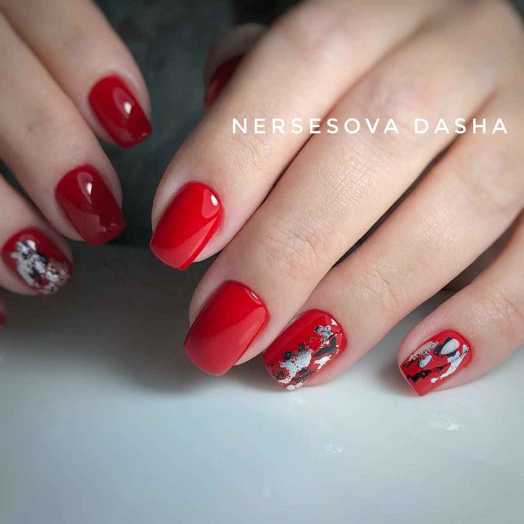 Кроме того, фольга может стать отличной подложкой для небольшого рисунка. Хаотичные фольгированные мазки придадут маникюру загадочности и стильности. И снова отметим, что фольга отлично смотрится именно с красной матовой текстурой, хотя и глянец отлично адаптируются для благородного и неброского блеска.