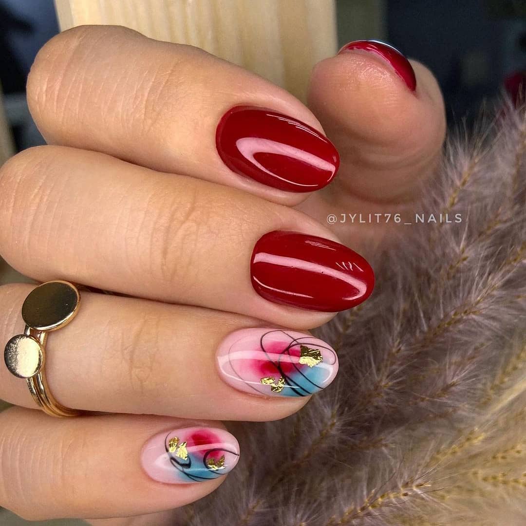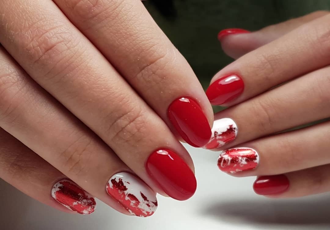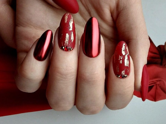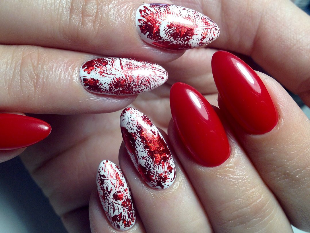Кроме того, фольга может стать отличной подложкой для небольшого рисунка. Хаотичные фольгированные мазки придадут маникюру загадочности и стильности. И снова отметим, что фольга отлично смотрится именно с красной матовой текстурой, хотя и глянец отлично адаптируются для благородного и неброского блеска.