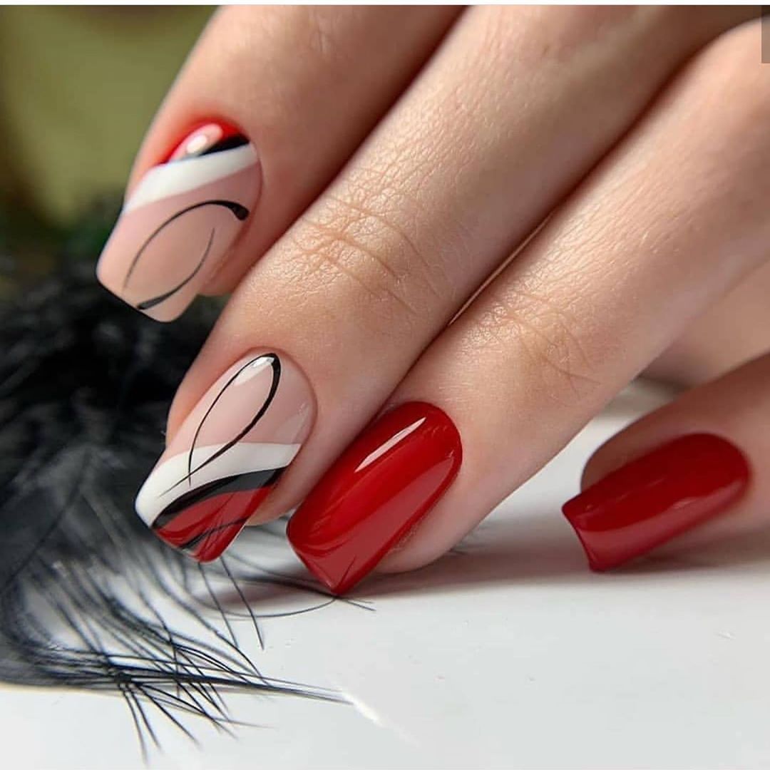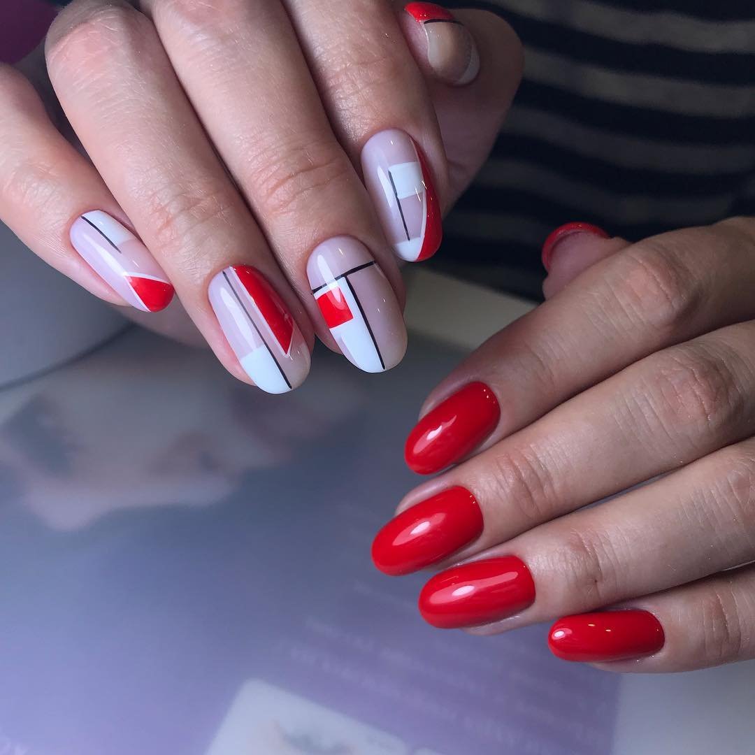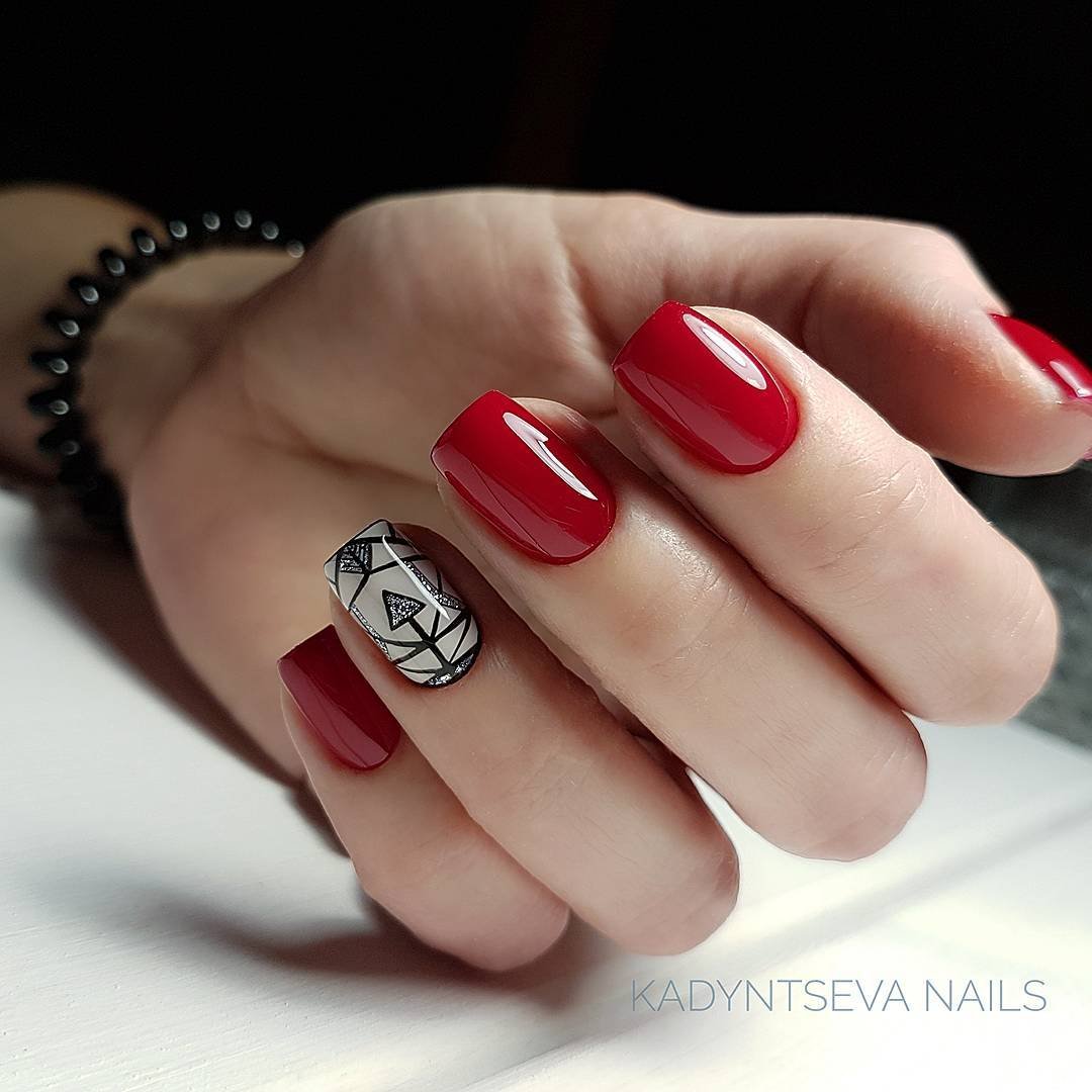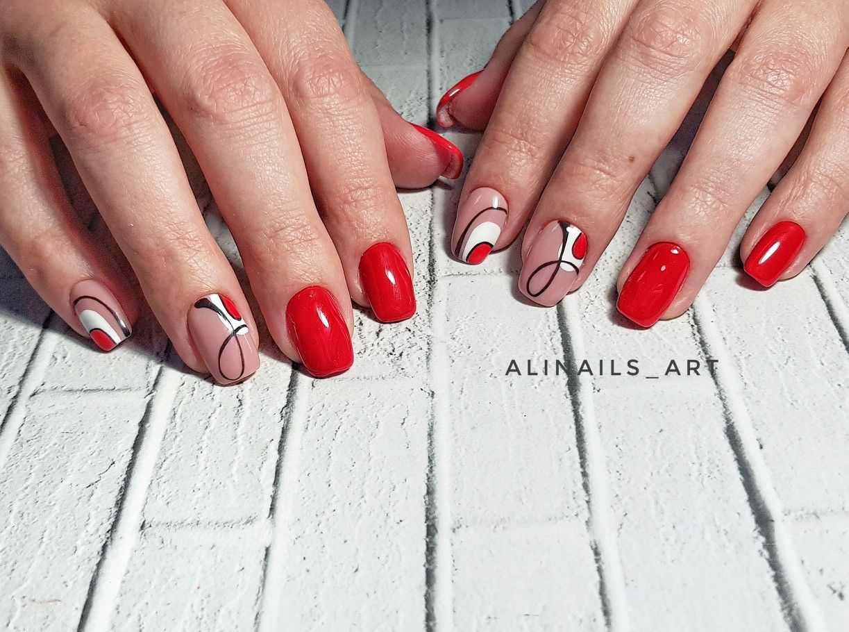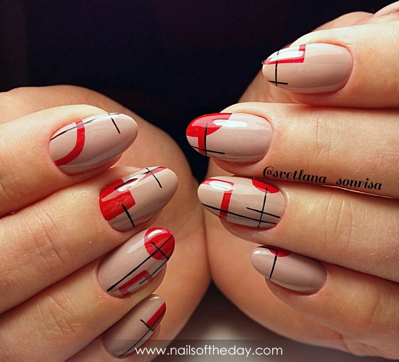 Ну, конечно, не стоит отказываться от абстрактных рисунков в виде линий, замысловатых фигур, которые вы можете нанести в соответствии со своей фантазией. Для создания красного абстрактного маникюра, мы рекомендуем использовать сразу несколько оттенков этой палитры. Кроме того, вы можете выбрать близкие цвета, например, розовый.