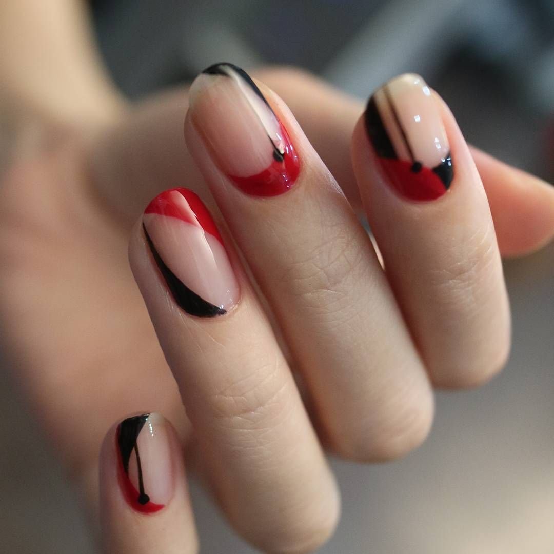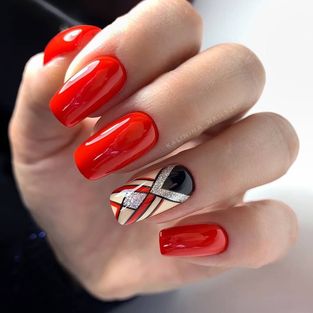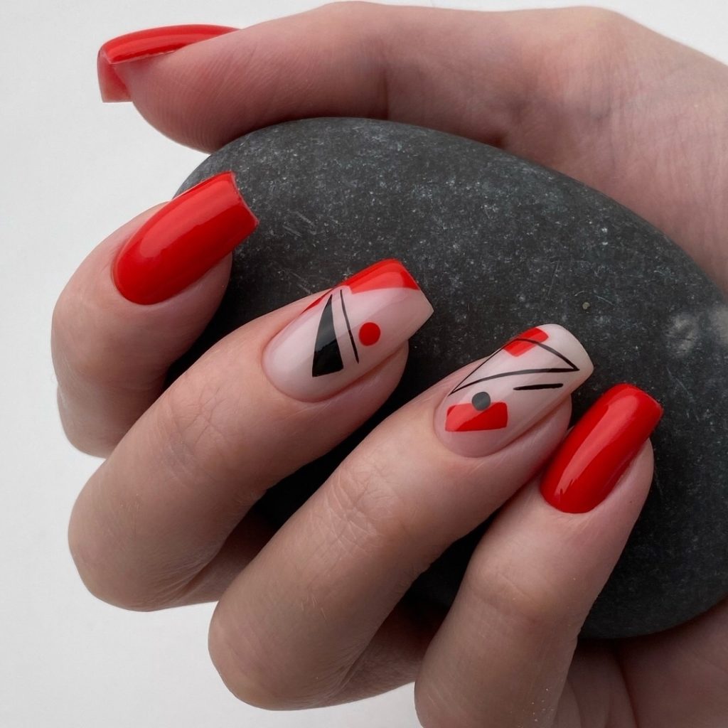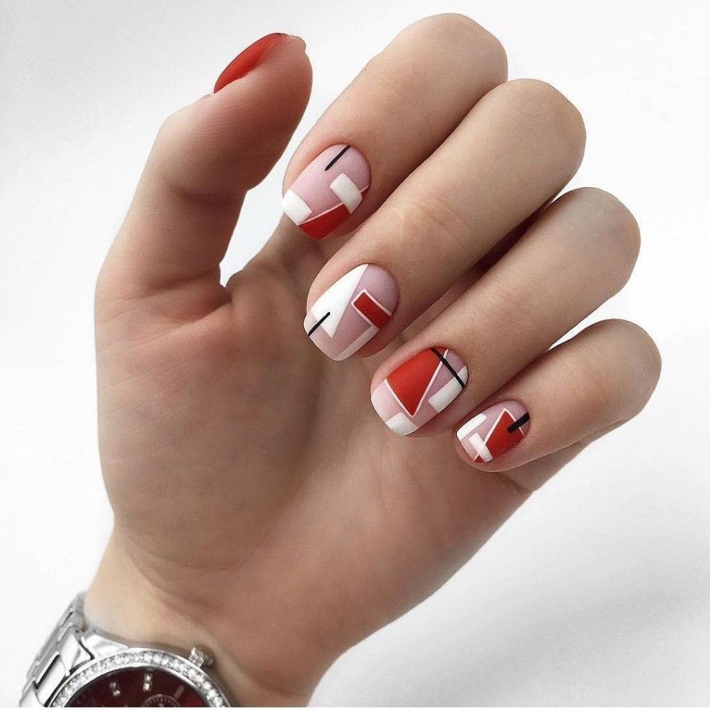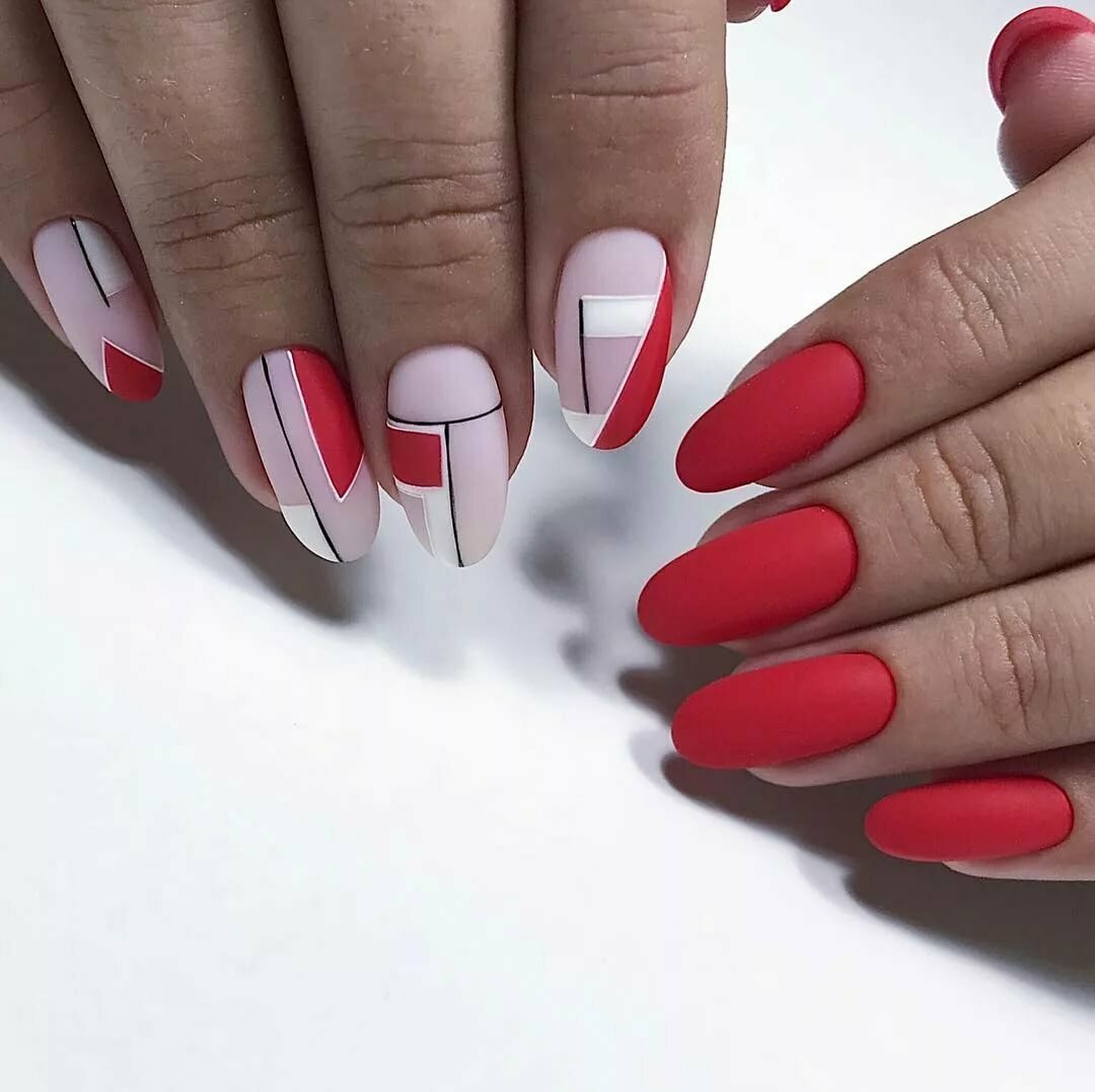 Ну, конечно, не стоит отказываться от абстрактных рисунков в виде линий, замысловатых фигур, которые вы можете нанести в соответствии со своей фантазией. Для создания красного абстрактного маникюра, мы рекомендуем использовать сразу несколько оттенков этой палитры. Кроме того, вы можете выбрать близкие цвета, например, розовый.