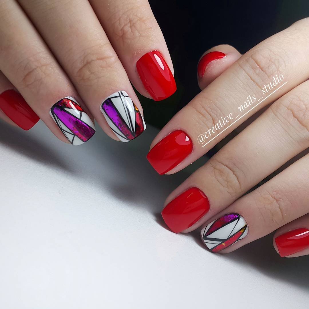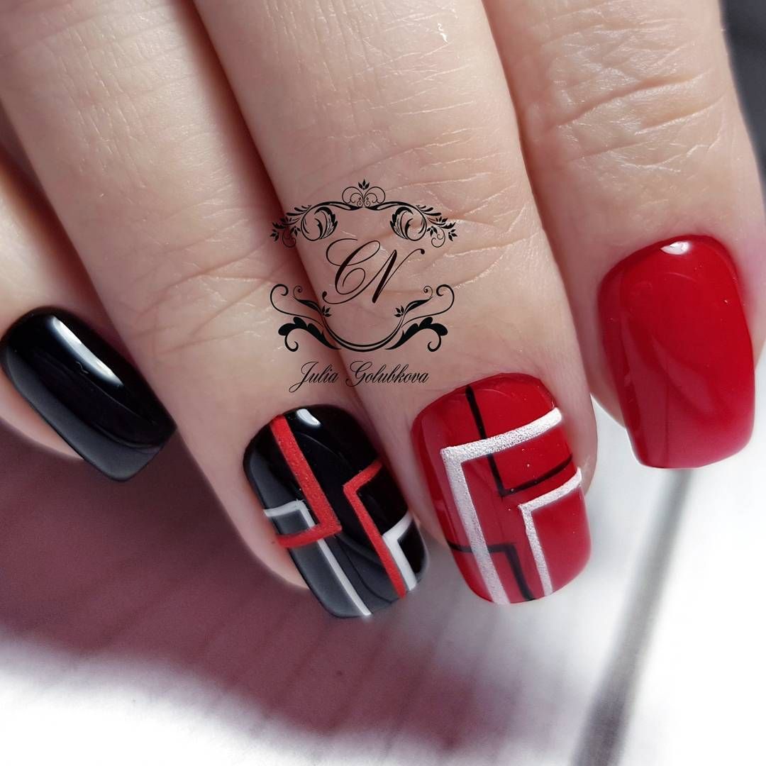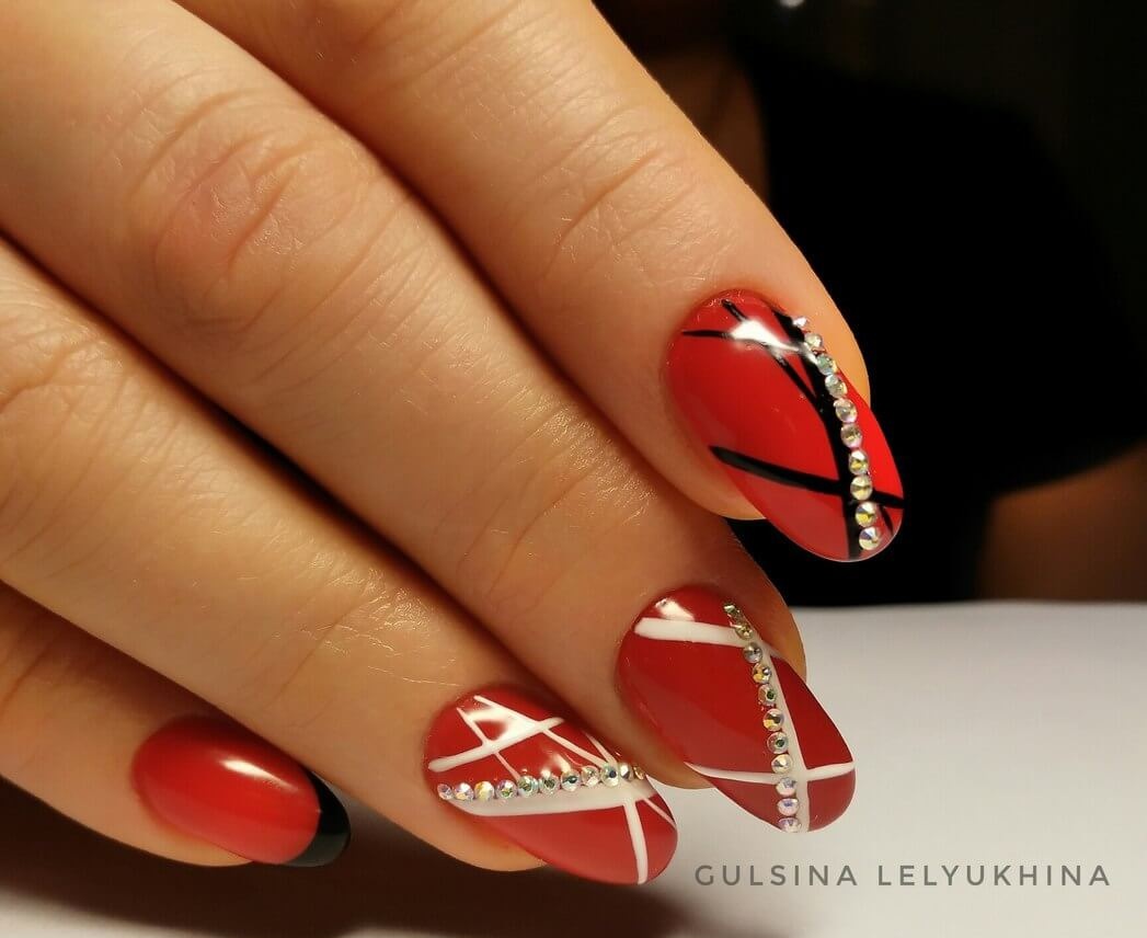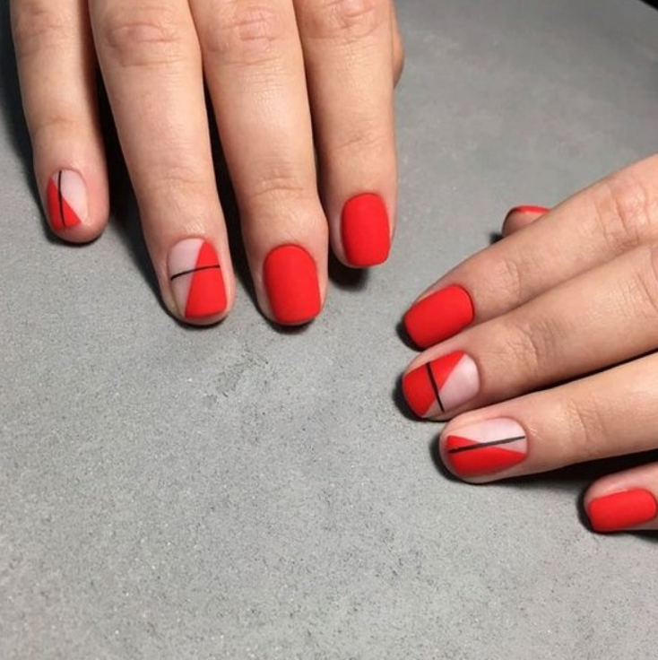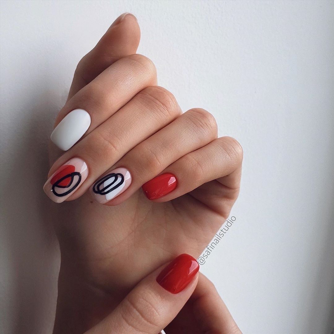 Ну, конечно, не стоит отказываться от абстрактных рисунков в виде линий, замысловатых фигур, которые вы можете нанести в соответствии со своей фантазией. Для создания красного абстрактного маникюра, мы рекомендуем использовать сразу несколько оттенков этой палитры. Кроме того, вы можете выбрать близкие цвета, например, розовый.