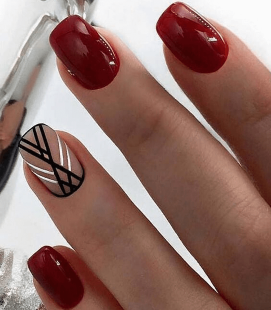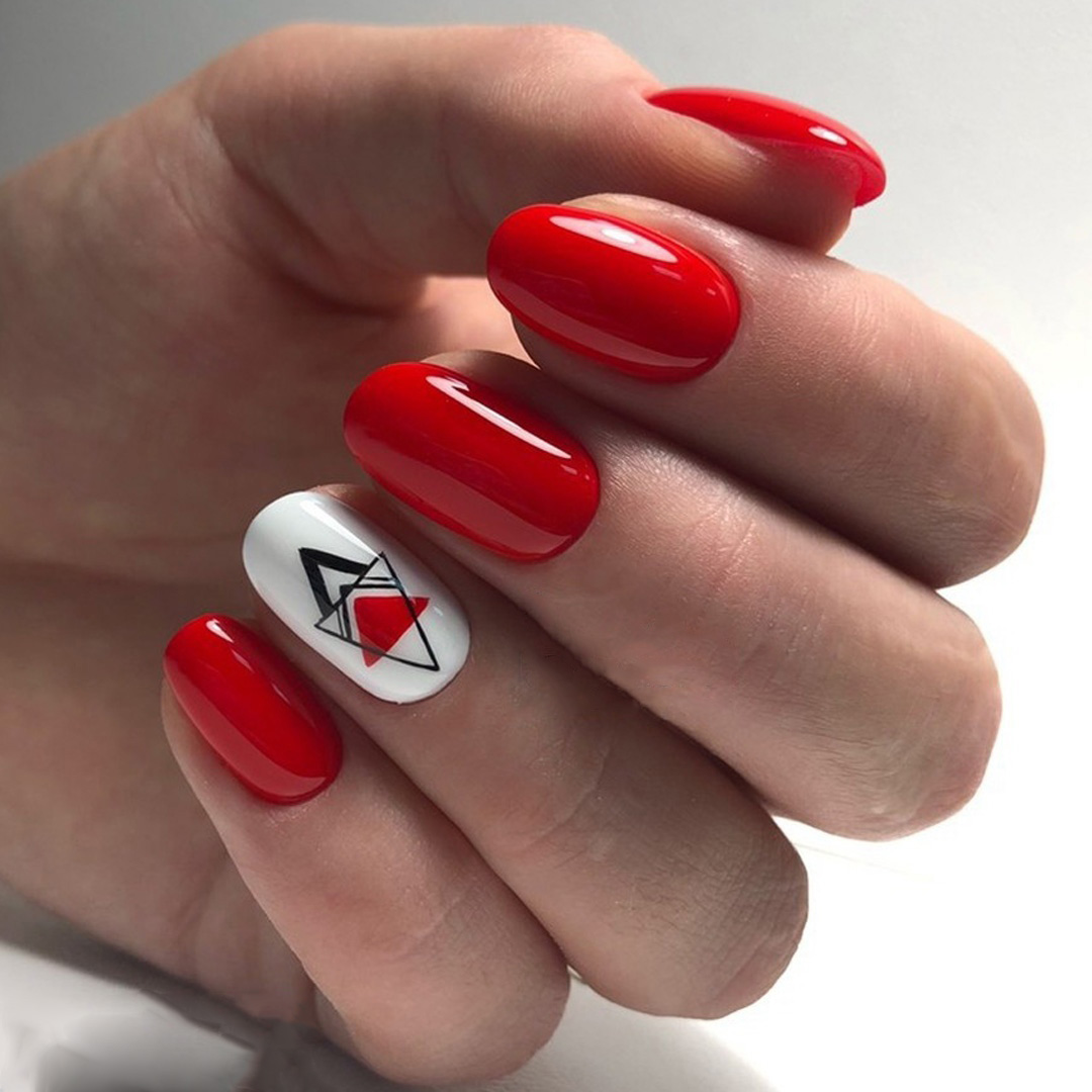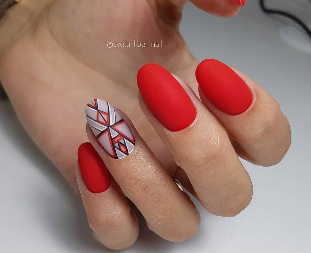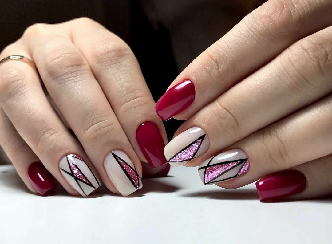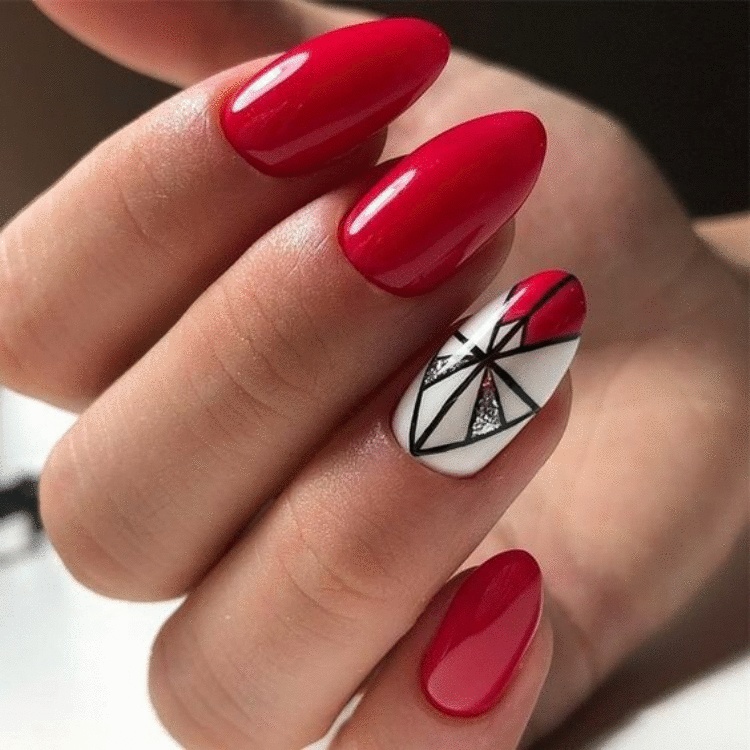 Ну, конечно, не стоит отказываться от абстрактных рисунков в виде линий, замысловатых фигур, которые вы можете нанести в соответствии со своей фантазией. Для создания красного абстрактного маникюра, мы рекомендуем использовать сразу несколько оттенков этой палитры. Кроме того, вы можете выбрать близкие цвета, например, розовый.