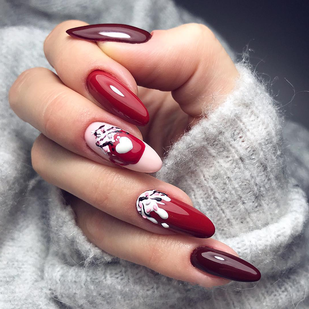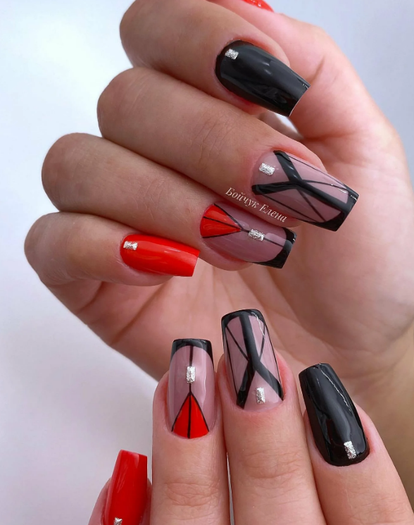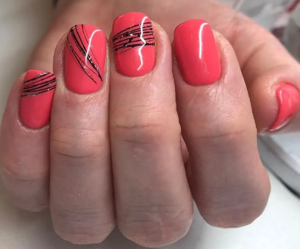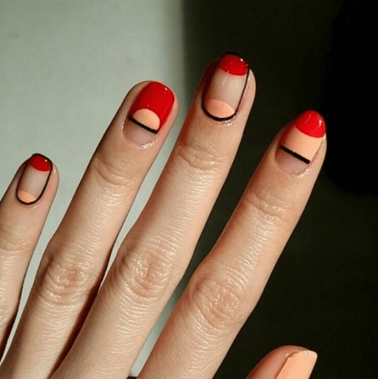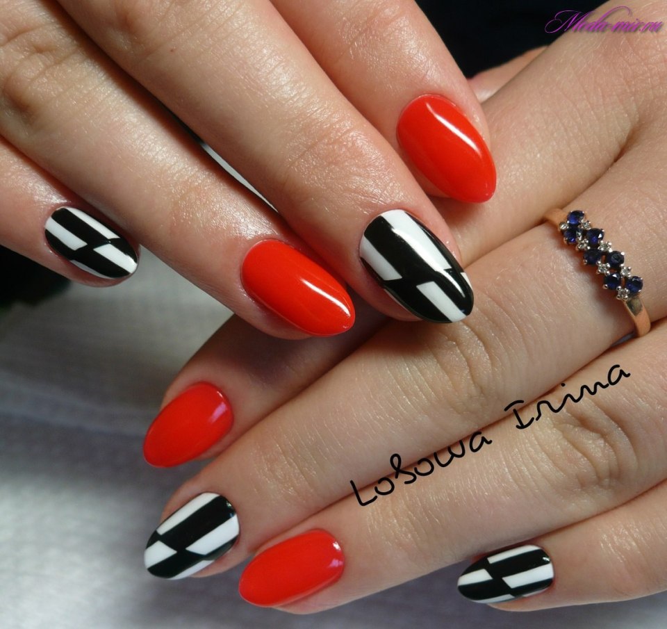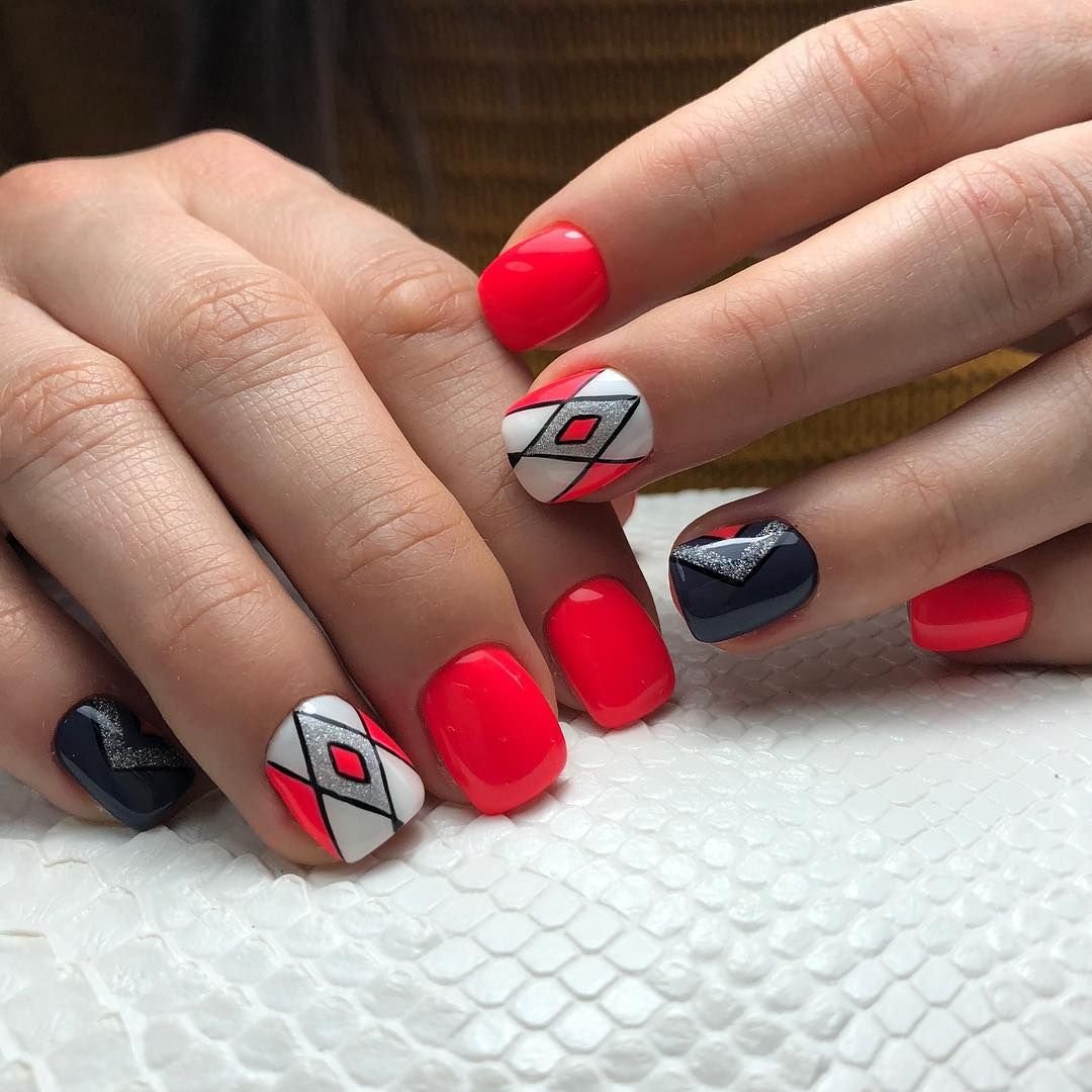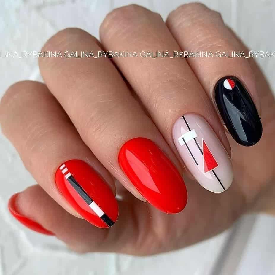 Ну, конечно, не стоит отказываться от абстрактных рисунков в виде линий, замысловатых фигур, которые вы можете нанести в соответствии со своей фантазией. Для создания красного абстрактного маникюра, мы рекомендуем использовать сразу несколько оттенков этой палитры. Кроме того, вы можете выбрать близкие цвета, например, розовый.
