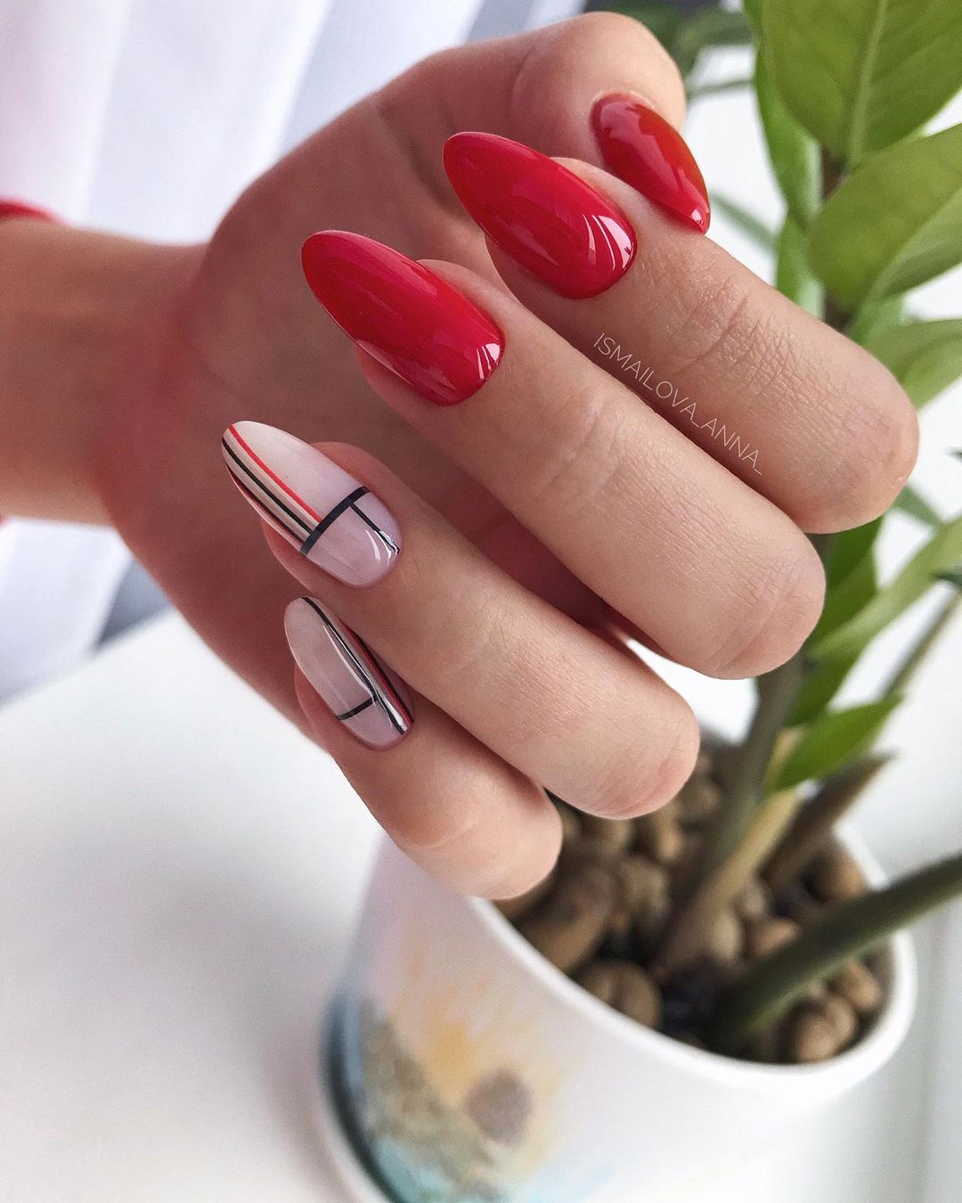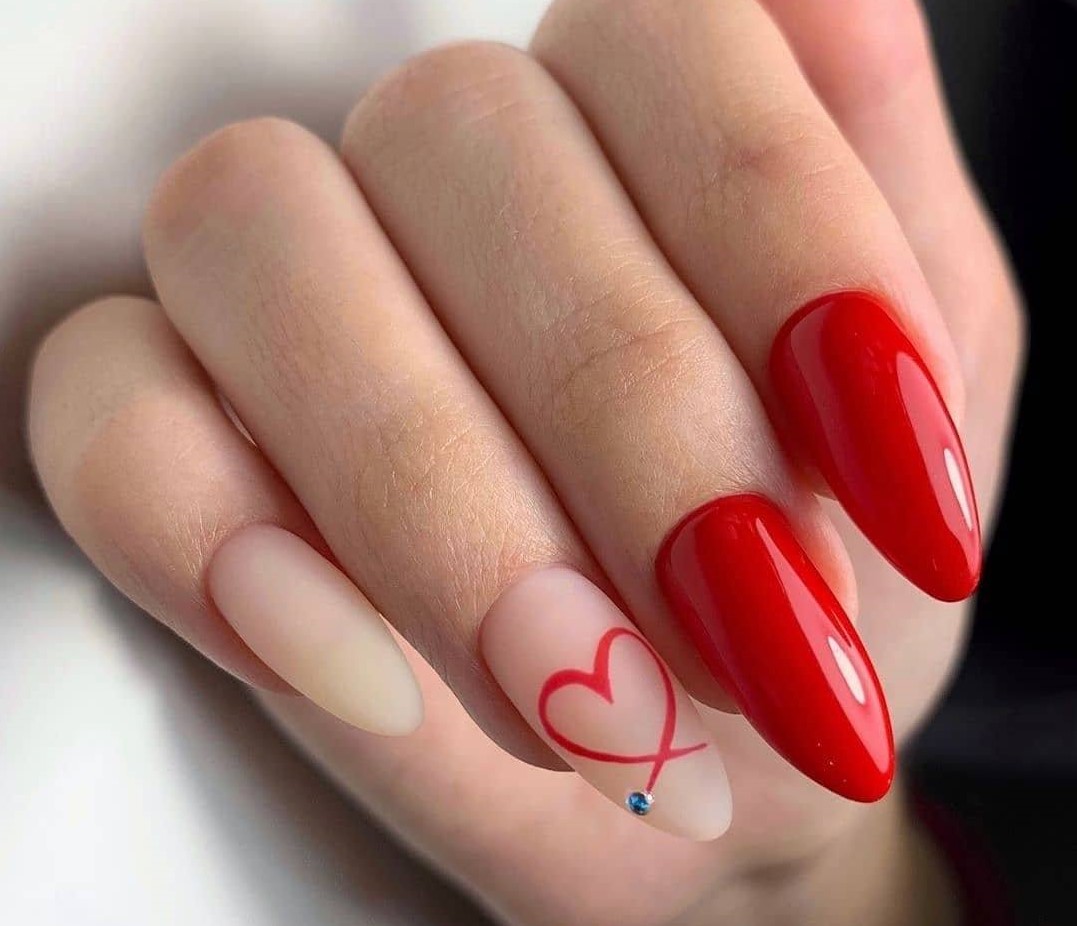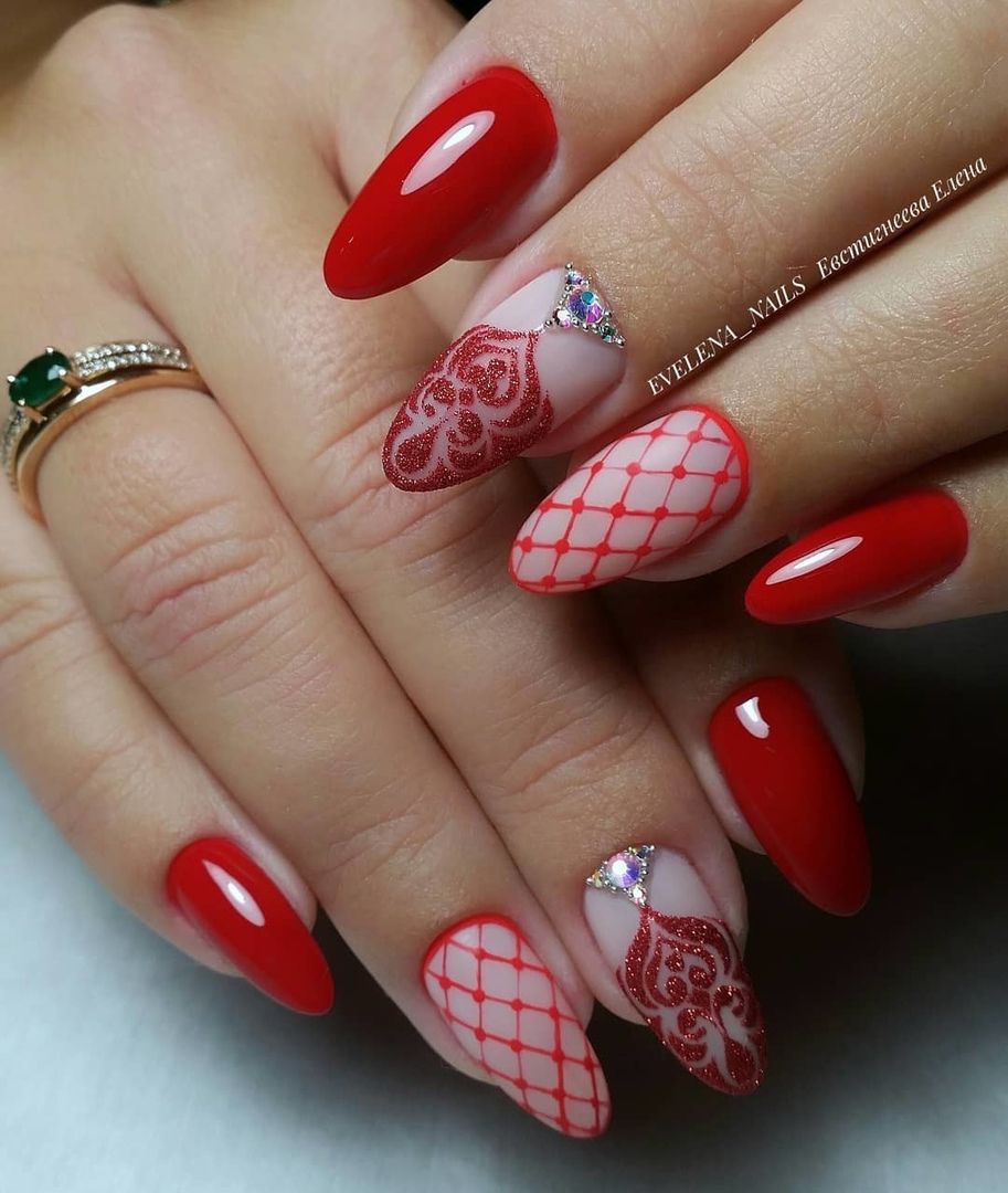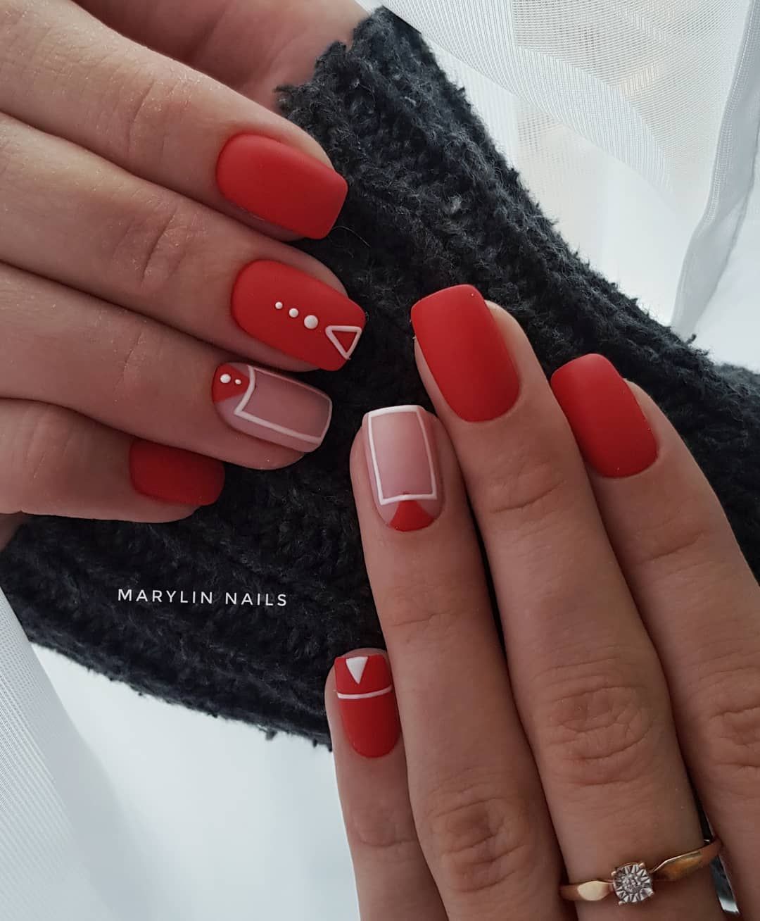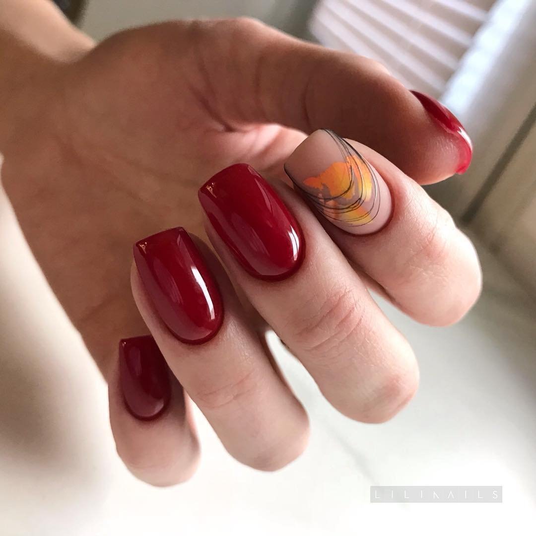 Правая рука оформляется матовым топом, а левая — глянцевым. Другой вариант — чередование текстур на каждом пальчике. В общем, в дизайне разные руки нет никаких ограничений. Просто проявите фантазию, и ваш красный маникюр будет стильным и очень необычным.