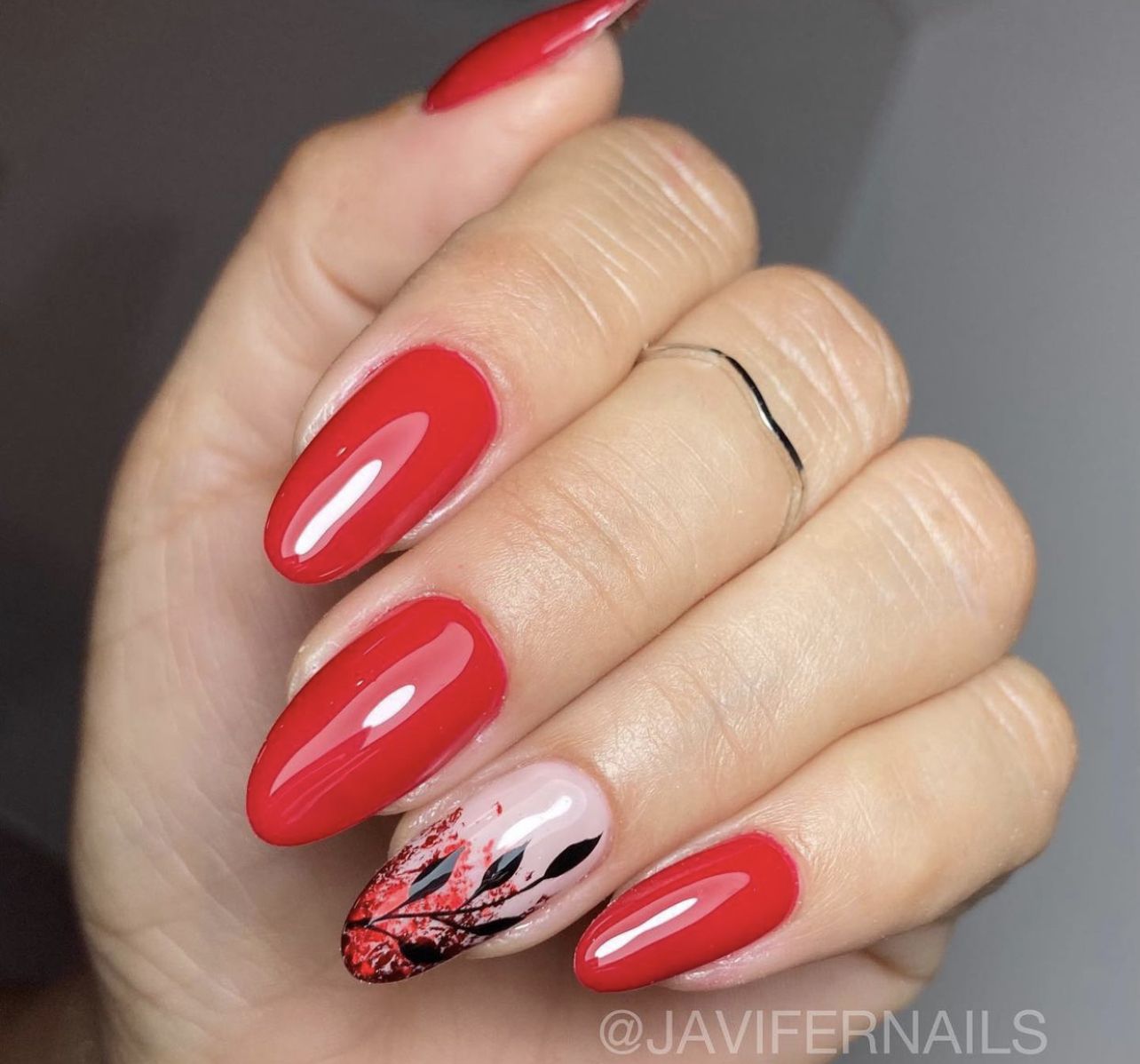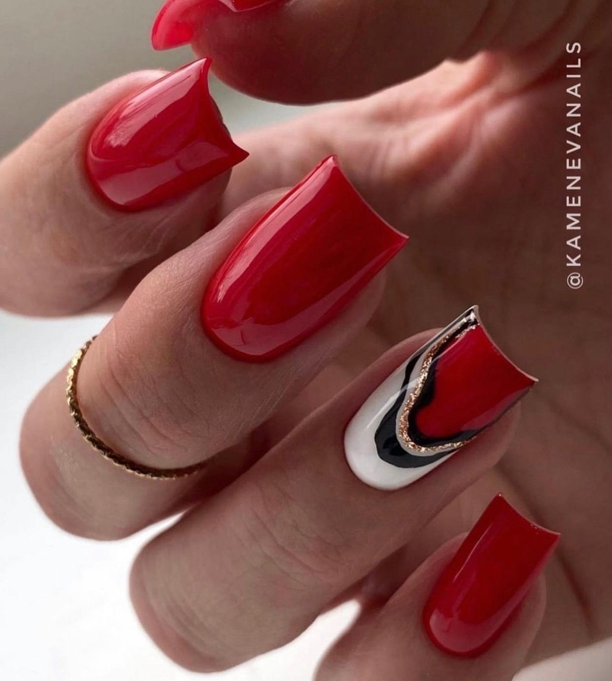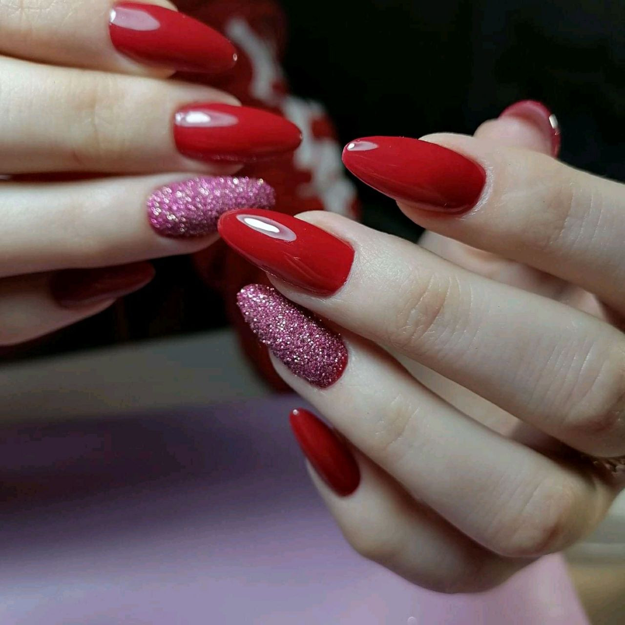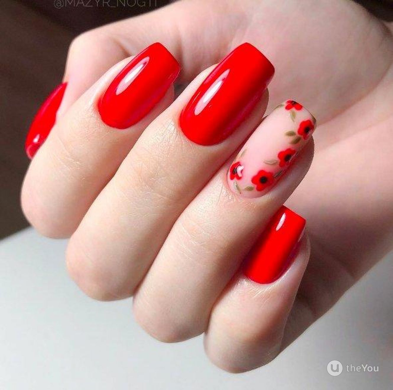 Правая рука оформляется матовым топом, а левая — глянцевым. Другой вариант — чередование текстур на каждом пальчике. В общем, в дизайне разные руки нет никаких ограничений. Просто проявите фантазию, и ваш красный маникюр будет стильным и очень необычным.
