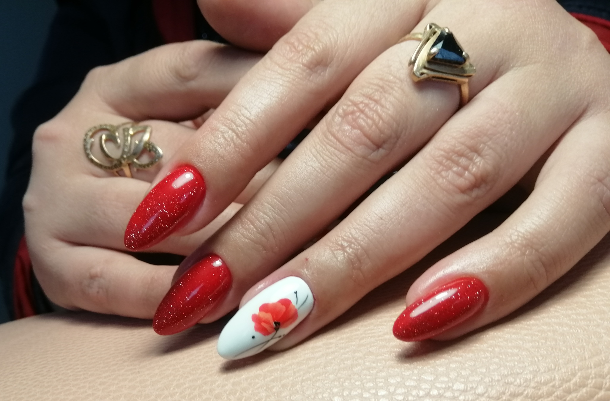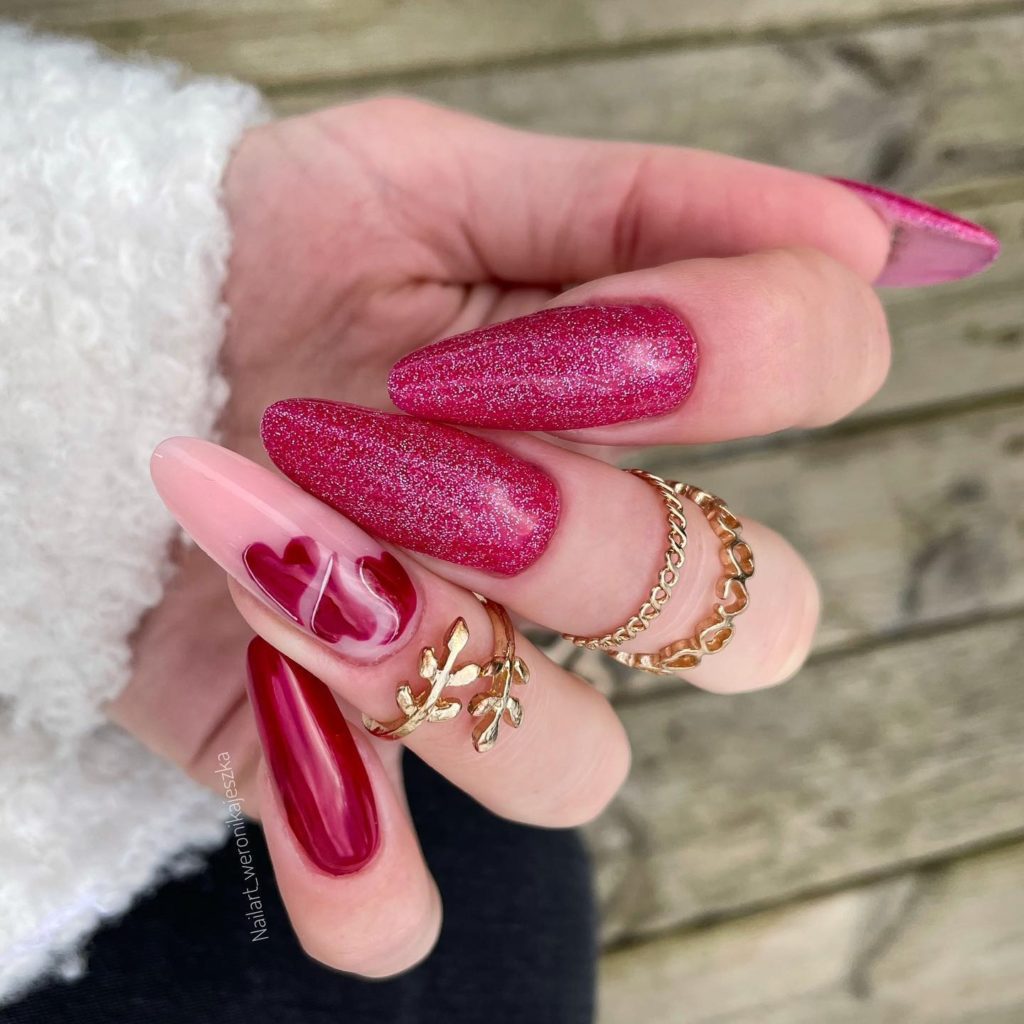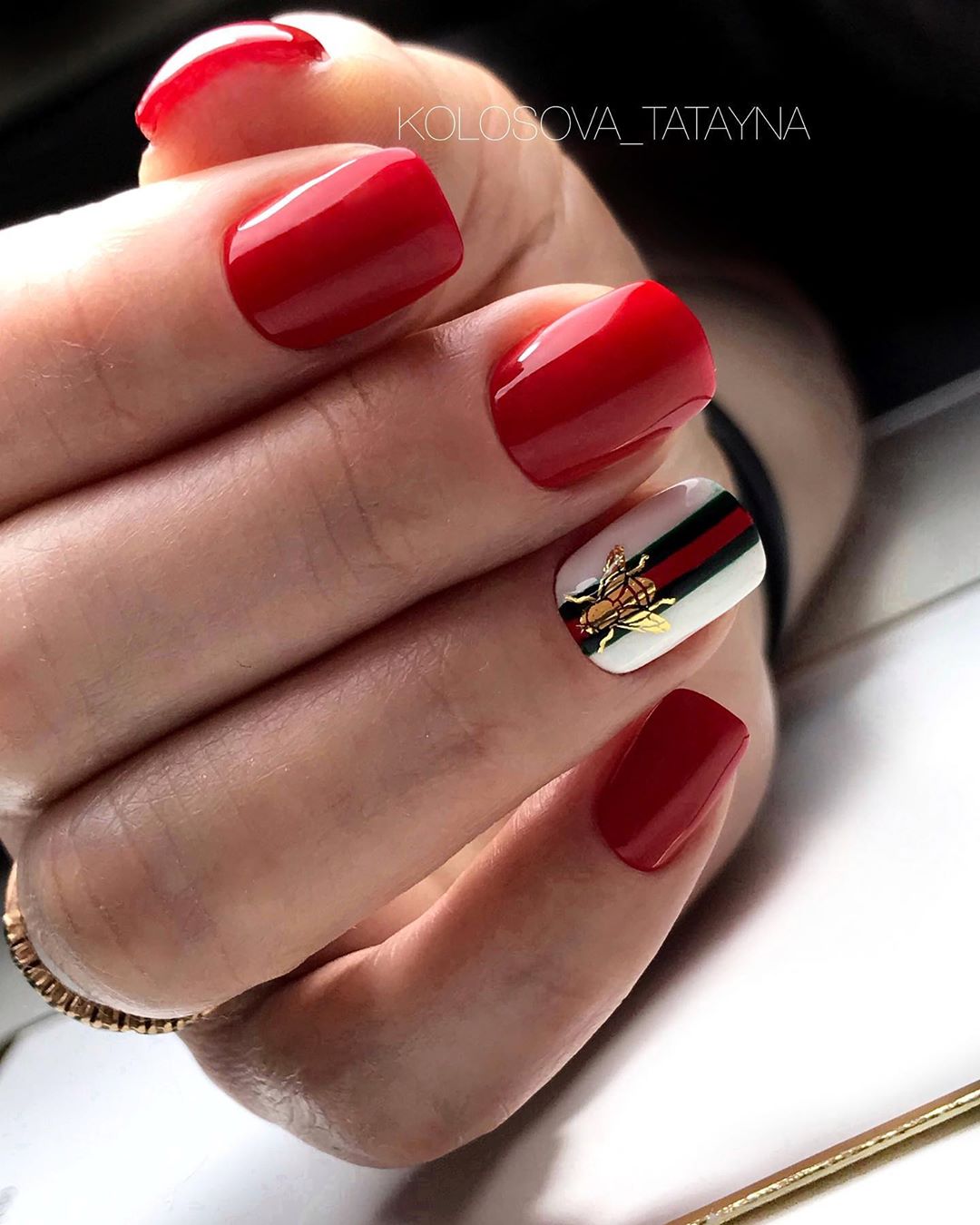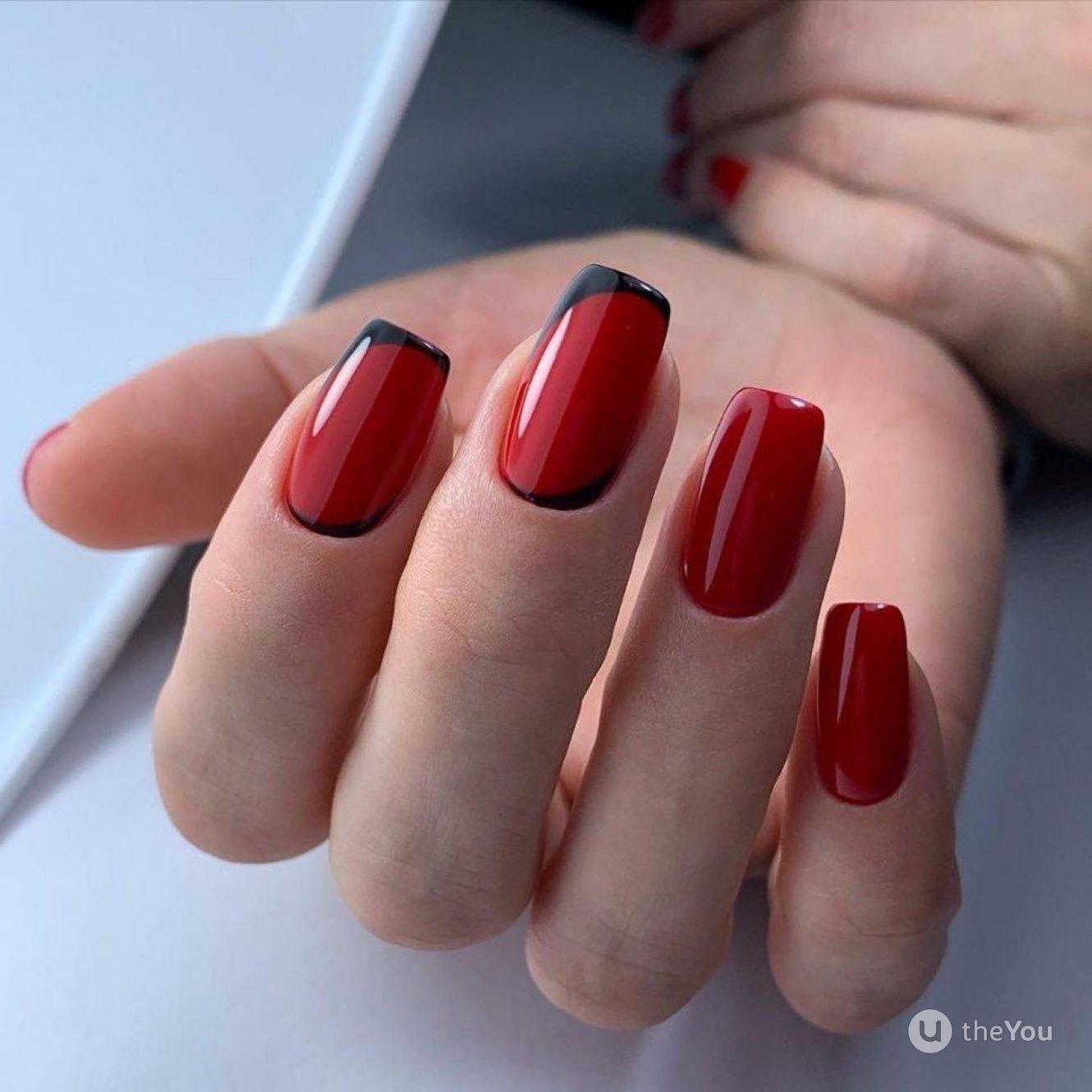 Правая рука оформляется матовым топом, а левая — глянцевым. Другой вариант — чередование текстур на каждом пальчике. В общем, в дизайне разные руки нет никаких ограничений. Просто проявите фантазию, и ваш красный маникюр будет стильным и очень необычным.