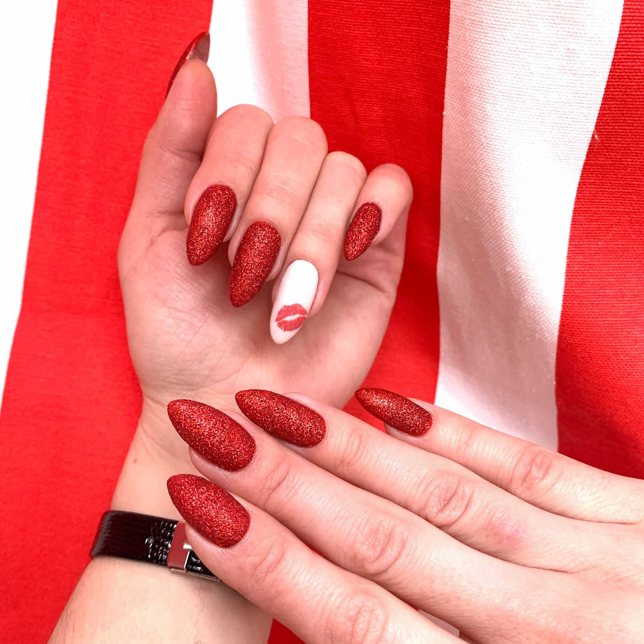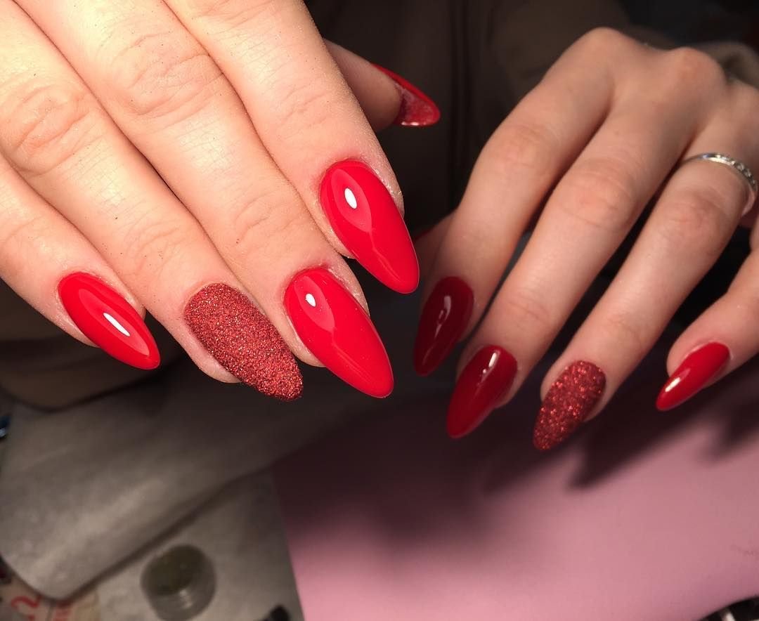 Один из самых востребованных дизайнов в этом сезоне — растяжка блестками. Таким образом получается создать стильный красный маникюр. Отметим, что техника растяжки довольно простая, и с ее помощью можно создать маникюр в стиле омбре. Для того, чтобы растянуть блестки по пластине, используется тонкая кисть, которой мастер аккуратно как бы перетягивает блестки с одного конца ногтя на другой.