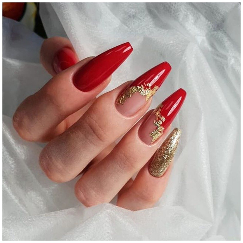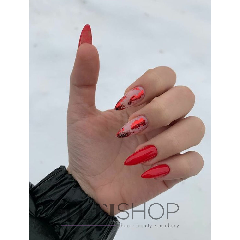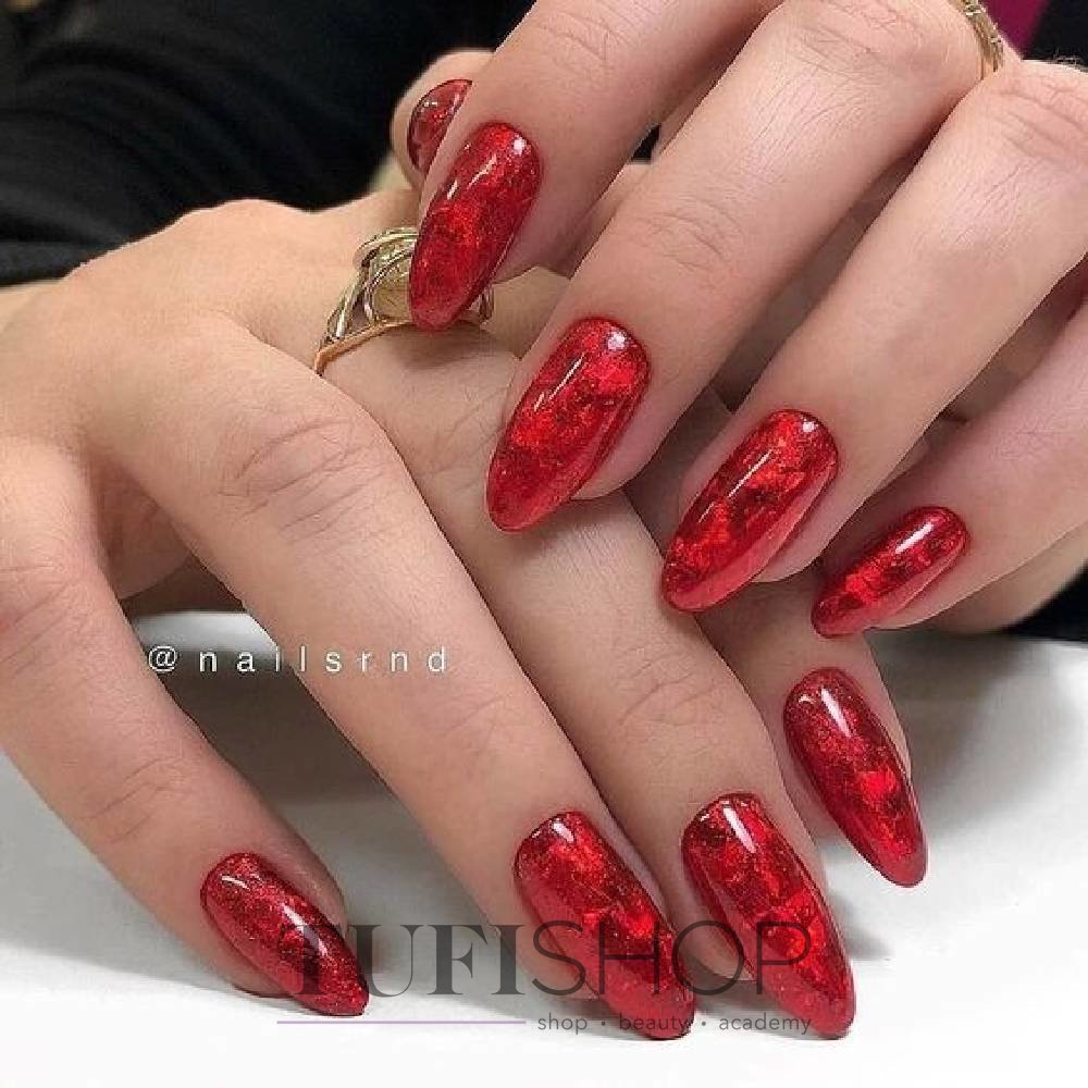 Фольга — это простой способ добавить в красный маникюр немножко блеска. При этом фольга не столь активный материал, как стразы и блестки. С ее помощью можно создать максимально уникальный дизайн. Не стоит слишком стараться. Фольгу нужно располагать на пластине достаточно хаотично, чтобы получился эффект небрежности. Таким образом, вы можете выделить, например, край пластины или лунку.