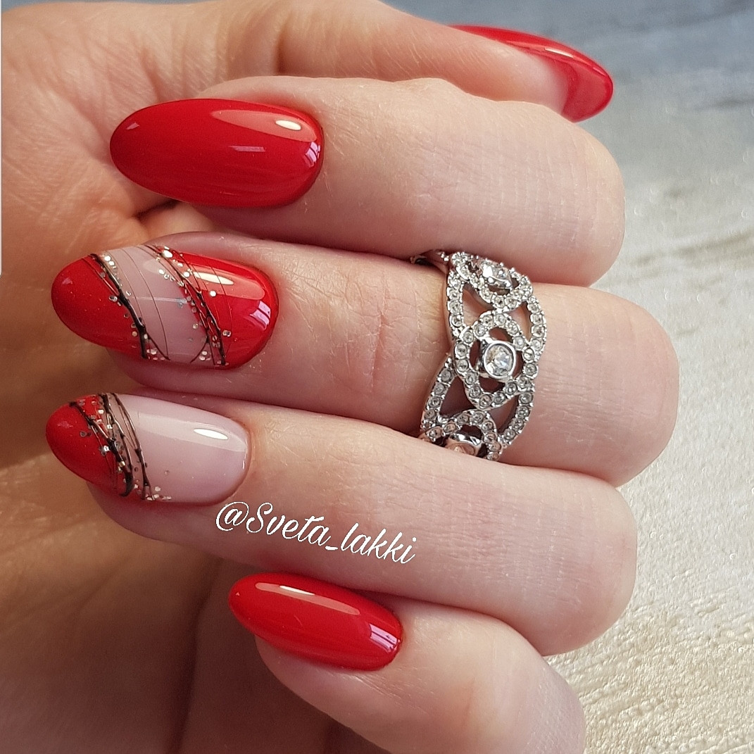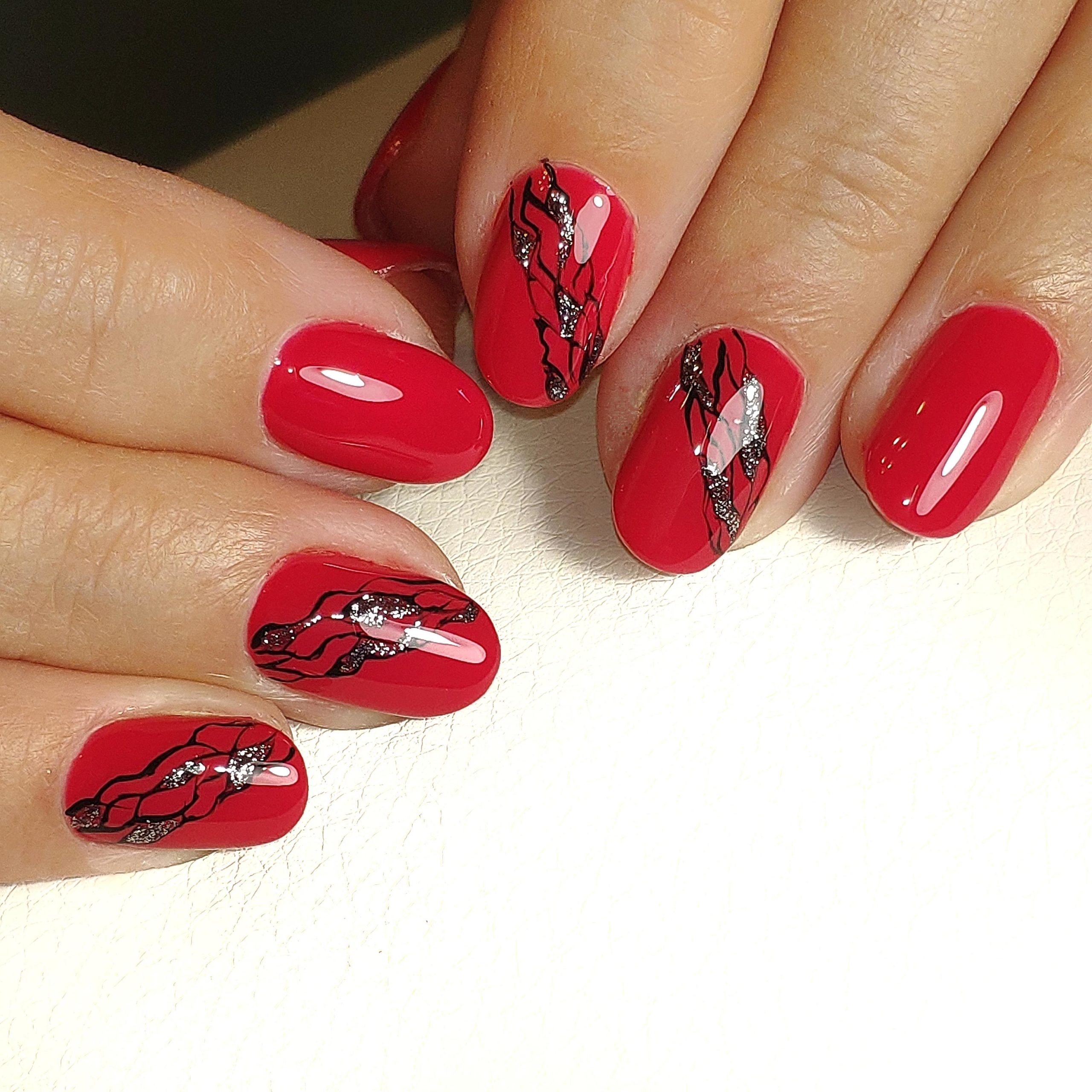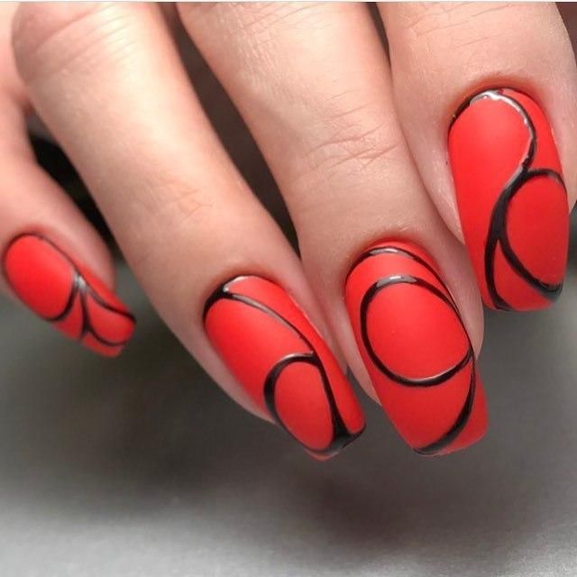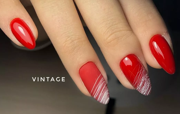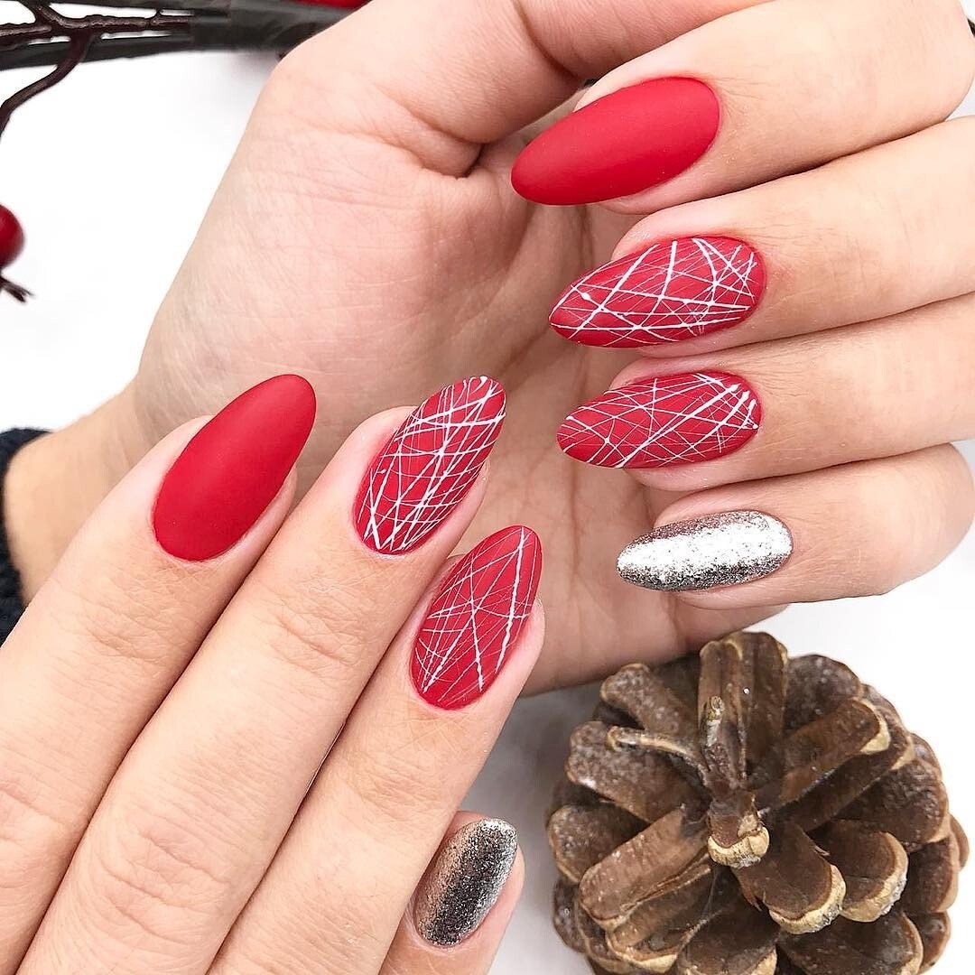С красным маникюром отлично сочетается такой вариант дизайна, как паутинка. Что он из себя представляет. Это тонкие линии, которой мастер наносит хаотично на ноготок. Основное отличие, например, от дизайна геометрия состоит в том, что в этом случае используют специальный материал — гелевый лак с тягучей консистенцией. Именно он позволяет добиться такого эффекта — тонкие немного выпуклые полоски, которые нарисовать с помощью обычного лака невозможно. От мастера понадобится сноровка. Ведь полоски словно наматываются на ногтевую пластину.