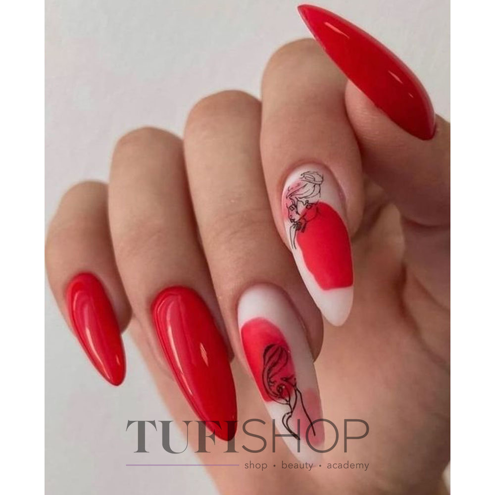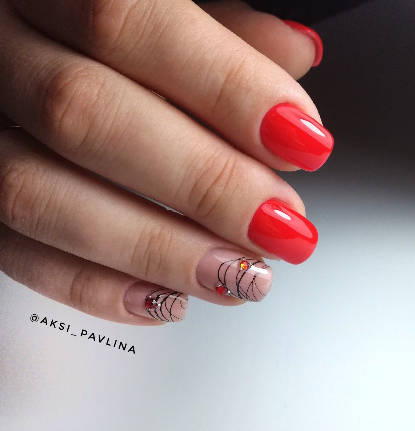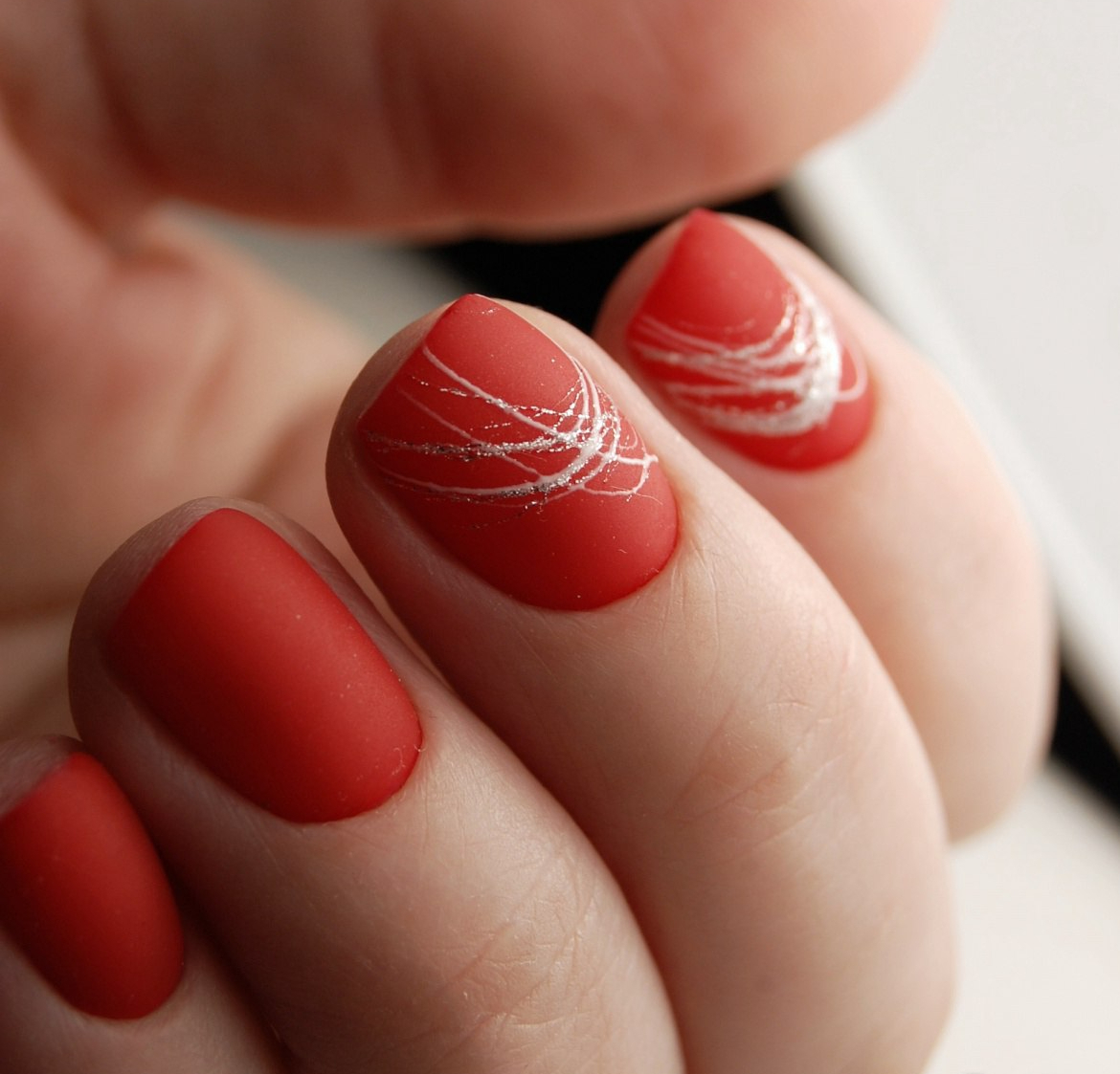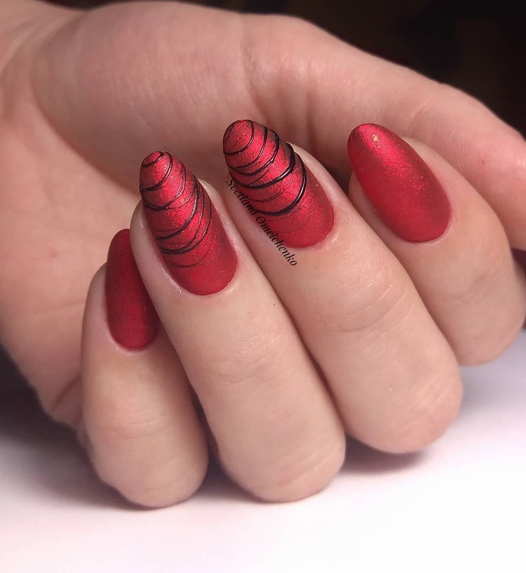 С красным маникюром отлично сочетается такой вариант дизайна, как паутинка. Что он из себя представляет. Это тонкие линии, которой мастер наносит хаотично на ноготок. Основное отличие, например, от дизайна геометрия состоит в том, что в этом случае используют специальный материал — гелевый лак с тягучей консистенцией. Именно он позволяет добиться такого эффекта — тонкие немного выпуклые полоски, которые нарисовать с помощью обычного лака невозможно. От мастера понадобится сноровка. Ведь полоски словно наматываются на ногтевую пластину.