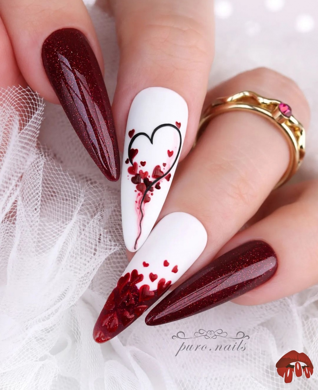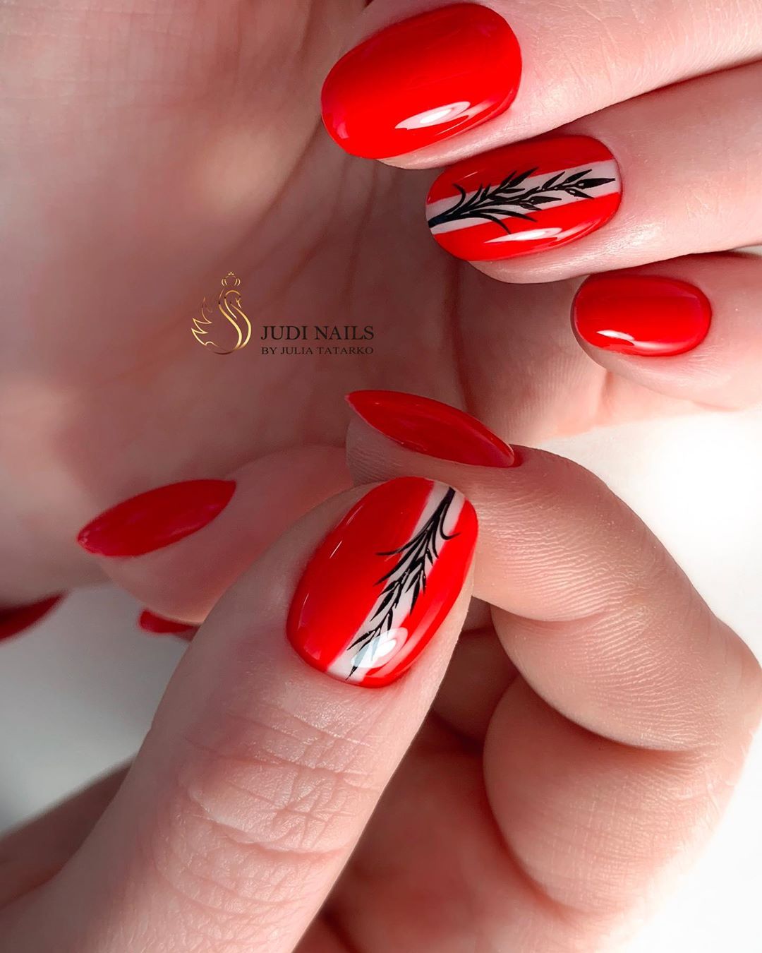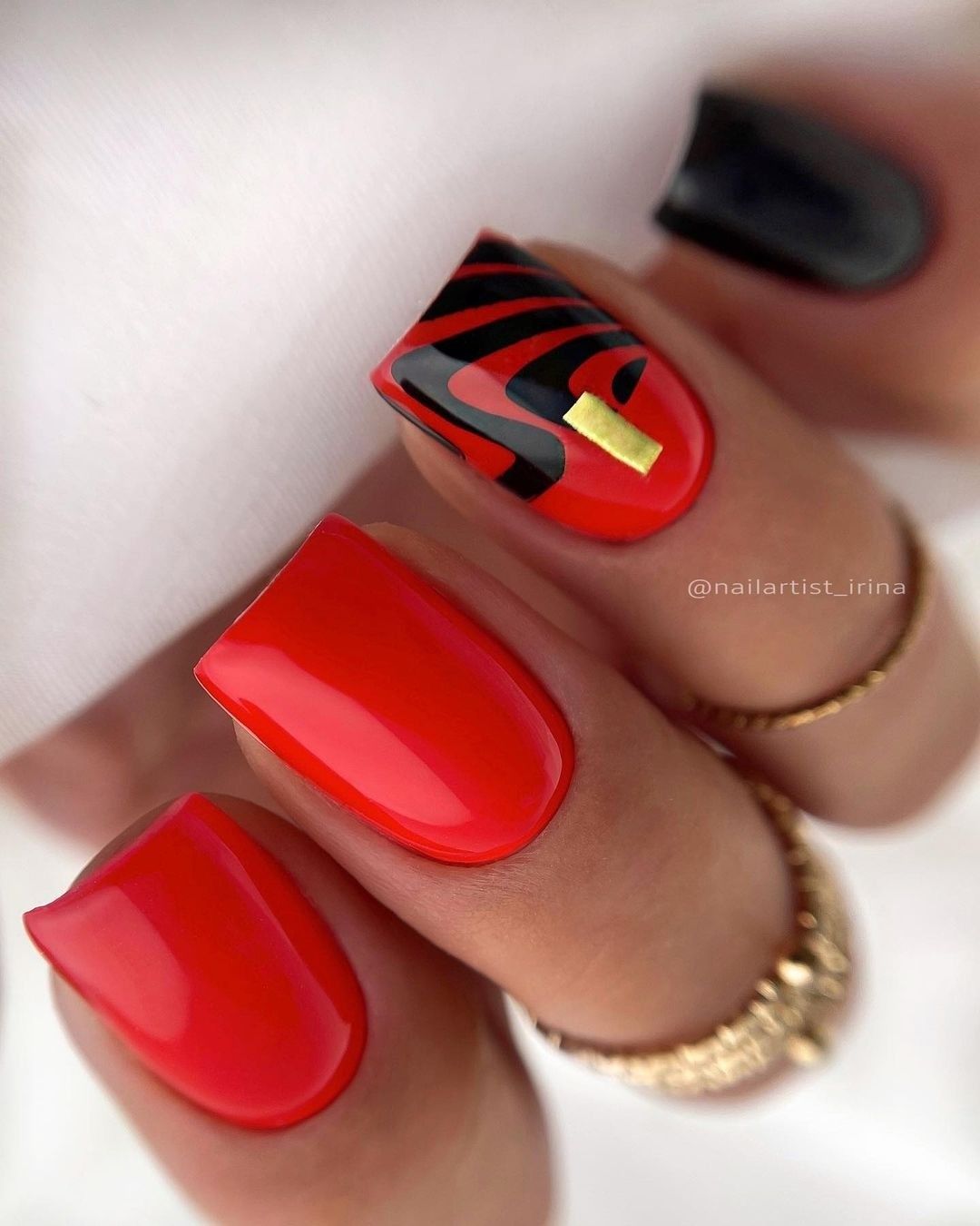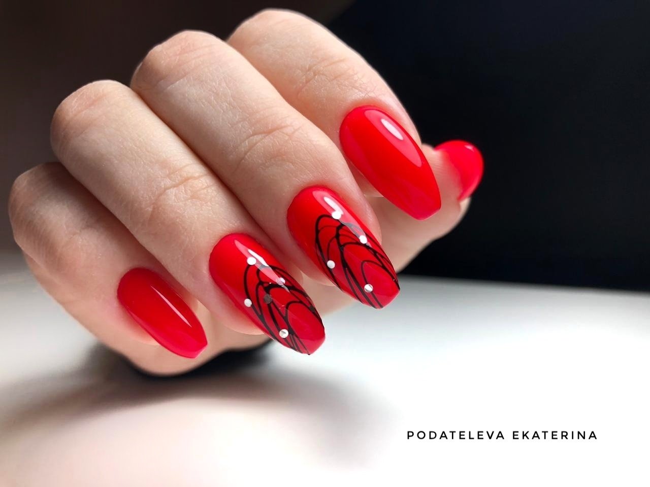 С красным маникюром отлично сочетается такой вариант дизайна, как паутинка. Что он из себя представляет. Это тонкие линии, которой мастер наносит хаотично на ноготок. Основное отличие, например, от дизайна геометрия состоит в том, что в этом случае используют специальный материал — гелевый лак с тягучей консистенцией. Именно он позволяет добиться такого эффекта — тонкие немного выпуклые полоски, которые нарисовать с помощью обычного лака невозможно. От мастера понадобится сноровка. Ведь полоски словно наматываются на ногтевую пластину.