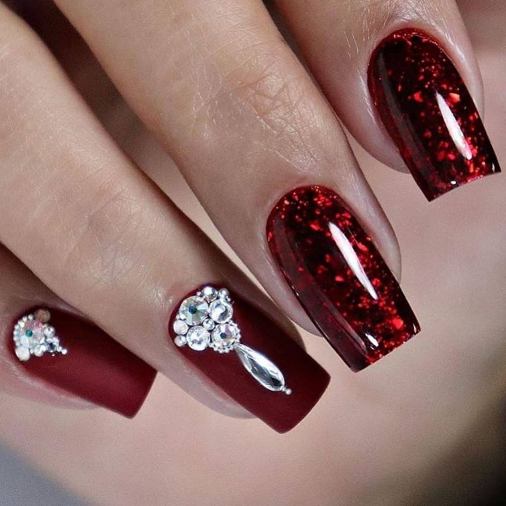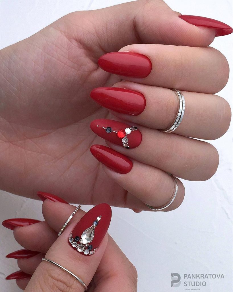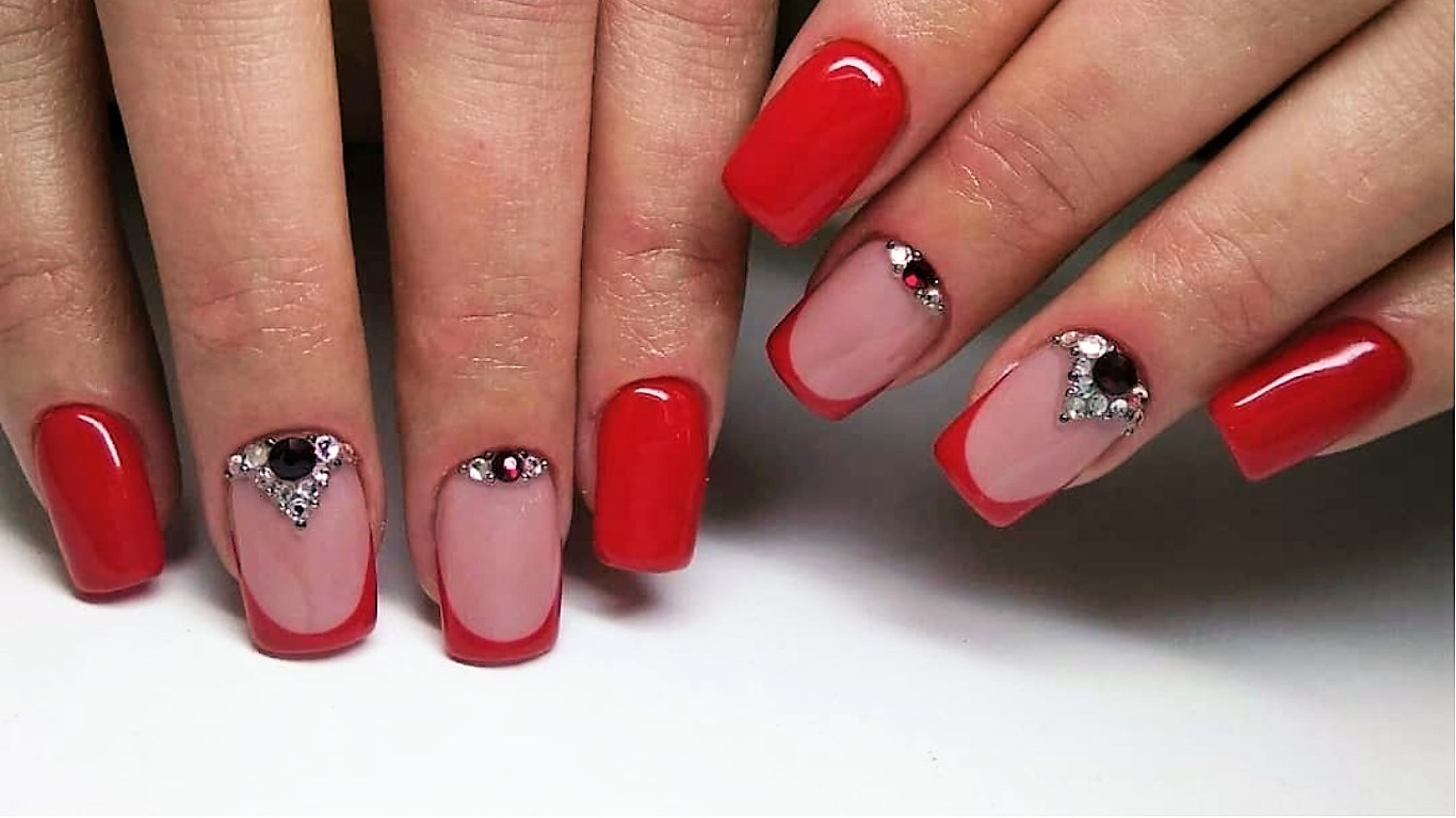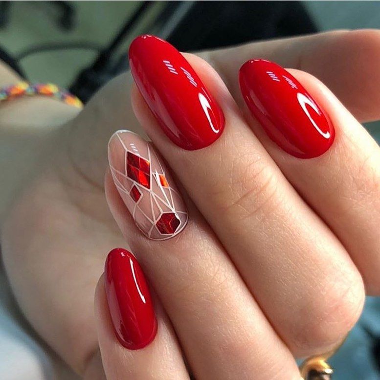 Один из самых популярных дизайнов — это красный маникюр со всевозможными стразами и блестками. Блеск и яркость камней любят, наверное, все девушки без исключения. Поэтому этот вид дизайна всегда входит в топ самых — самых востребованных. Что касается размещения страз, мы рекомендуем для красного маникюра использовать всего один акцентные ноготь. Его можно полностью заполнить стразами или выложить красивый интересный рисунок. Хочется оформить стразами сразу все ноготки, придерживайтесь принципа минимализма, например, на каждую пластину по одному небольшому камню, или выделите лунку 2 — 3 стразами.