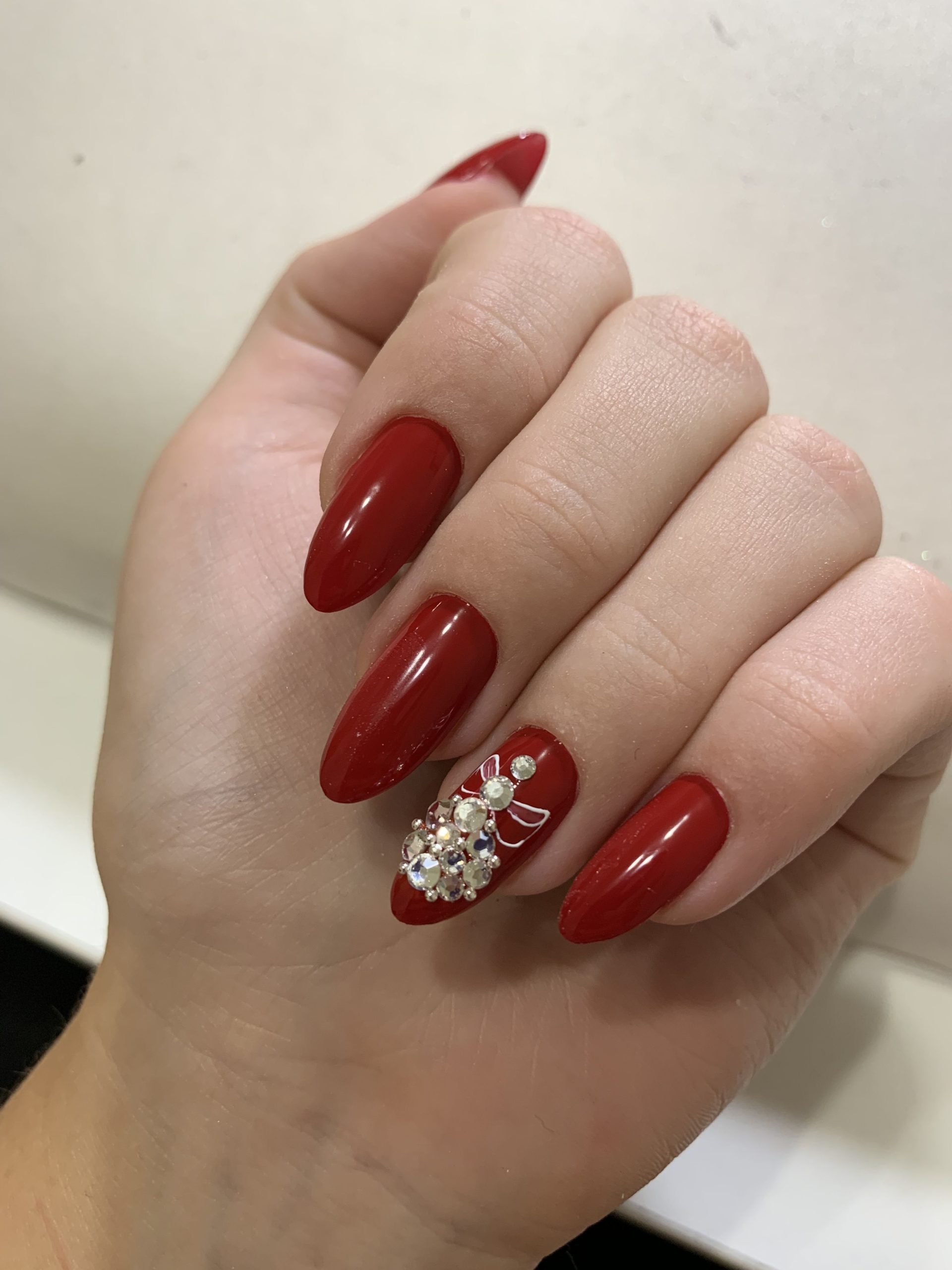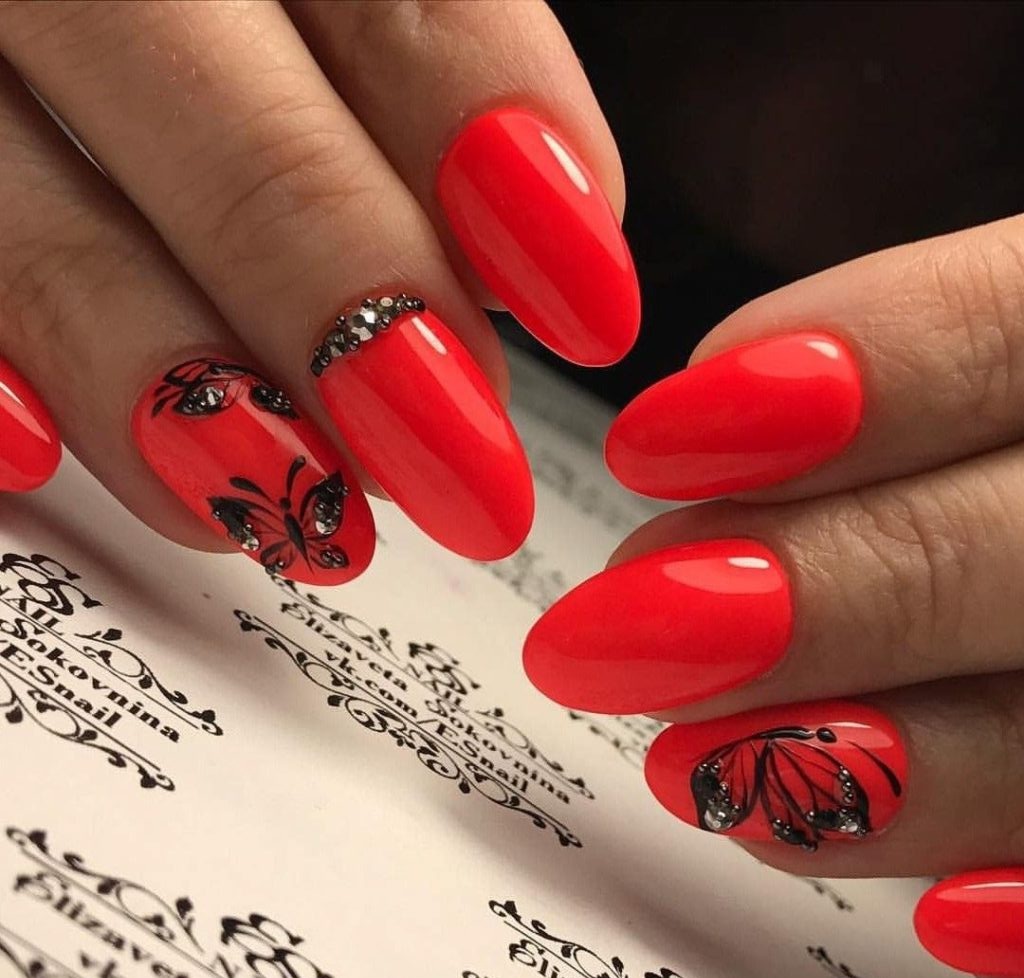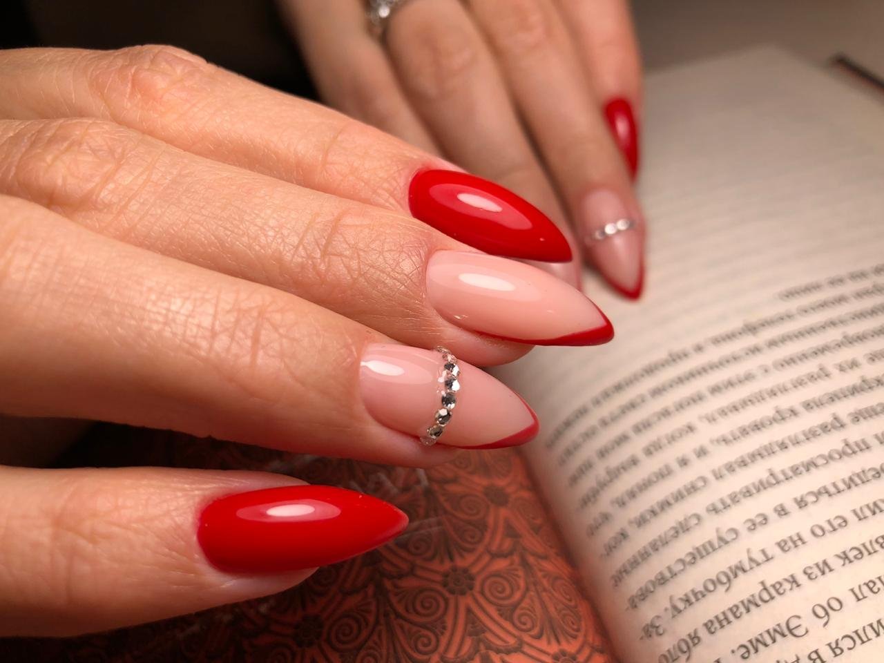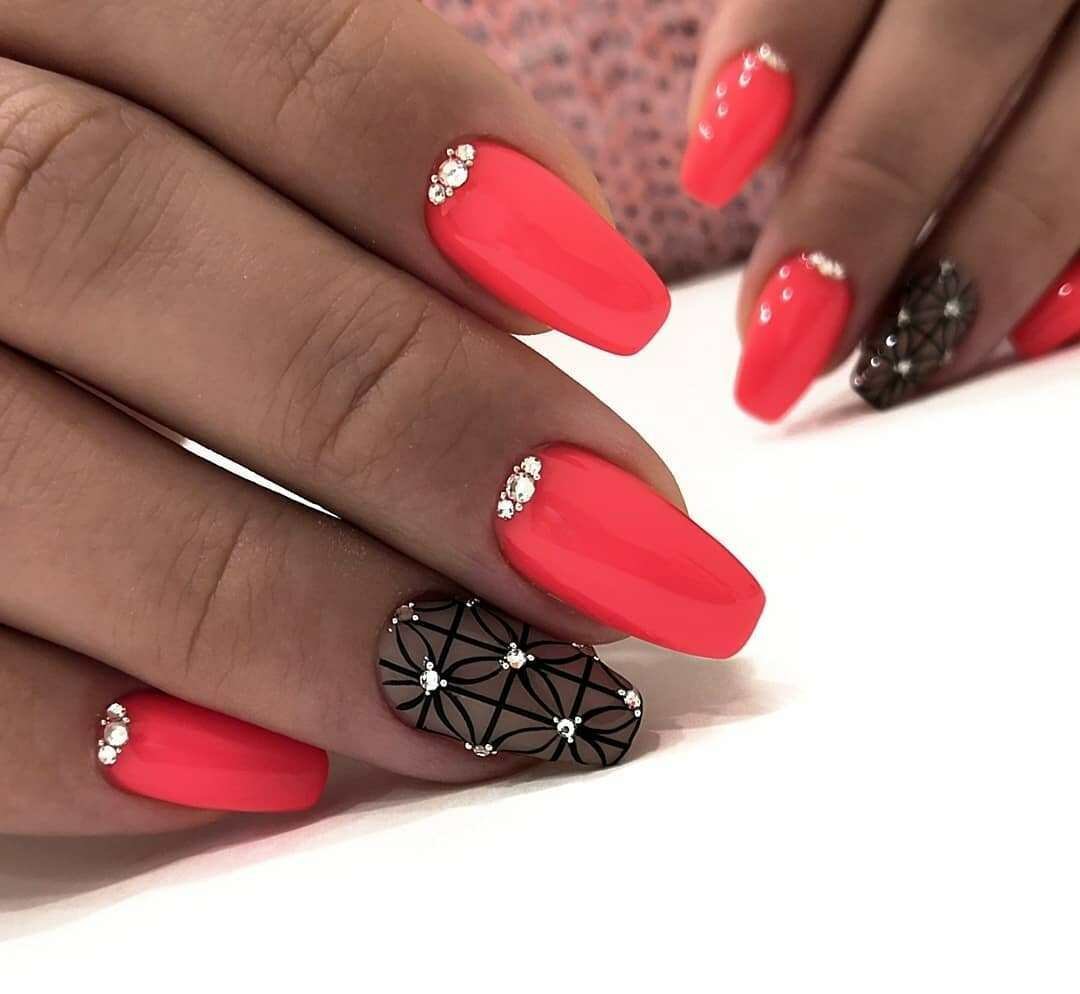 Один из самых популярных дизайнов — это красный маникюр со всевозможными стразами и блестками. Блеск и яркость камней любят, наверное, все девушки без исключения. Поэтому этот вид дизайна всегда входит в топ самых — самых востребованных. Что касается размещения страз, мы рекомендуем для красного маникюра использовать всего один акцентные ноготь. Его можно полностью заполнить стразами или выложить красивый интересный рисунок. Хочется оформить стразами сразу все ноготки, придерживайтесь принципа минимализма, например, на каждую пластину по одному небольшому камню, или выделите лунку 2 — 3 стразами.