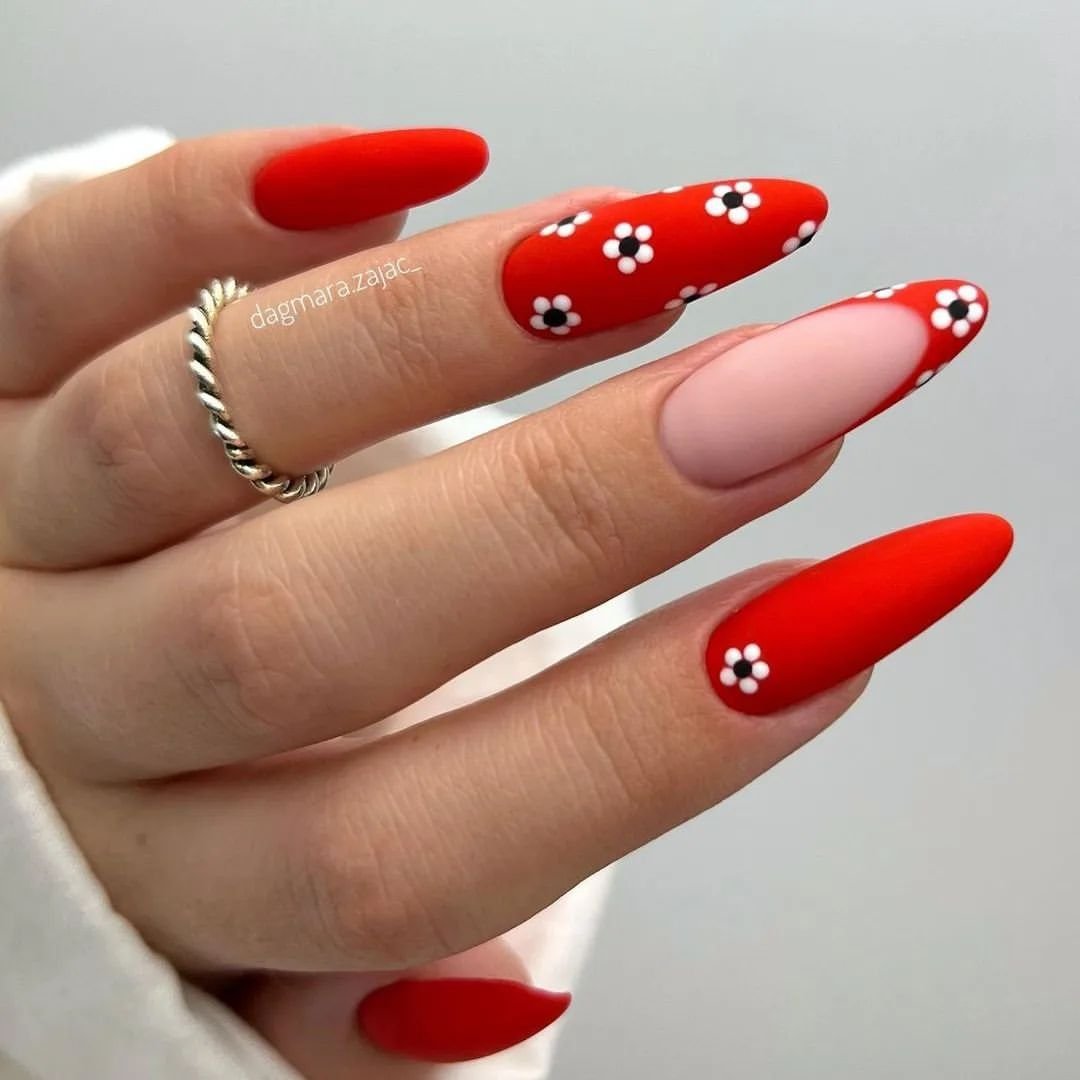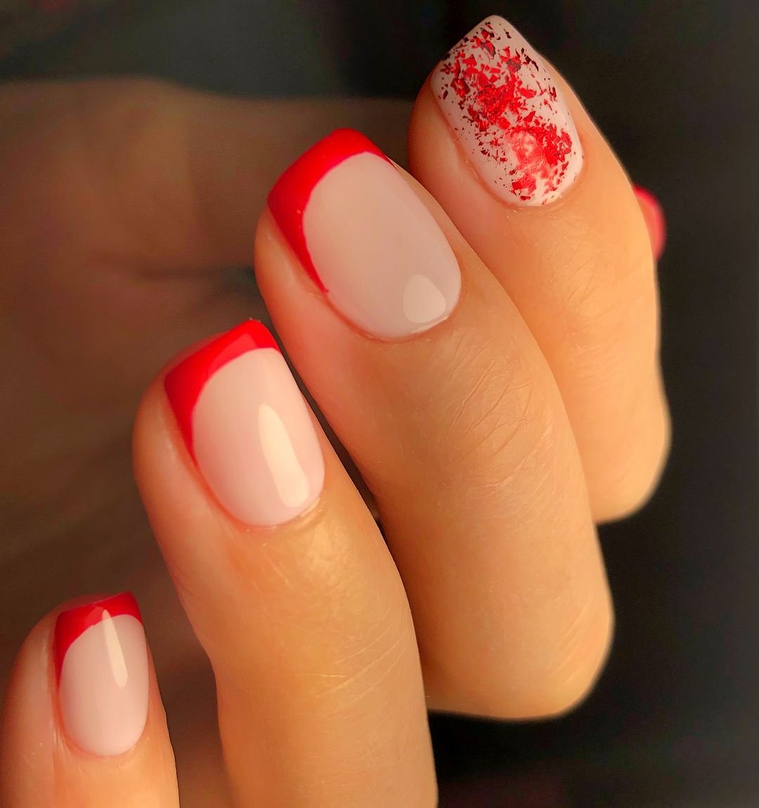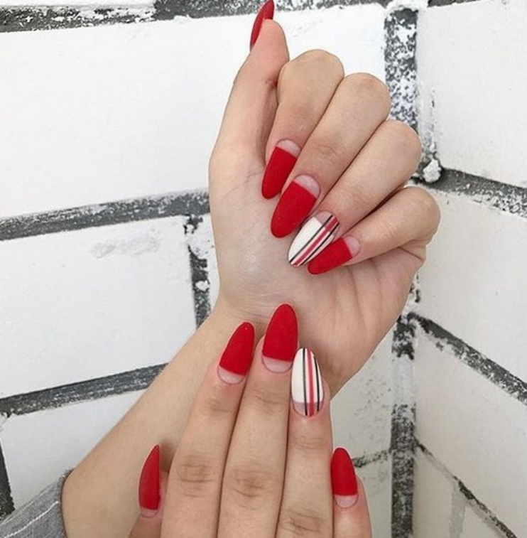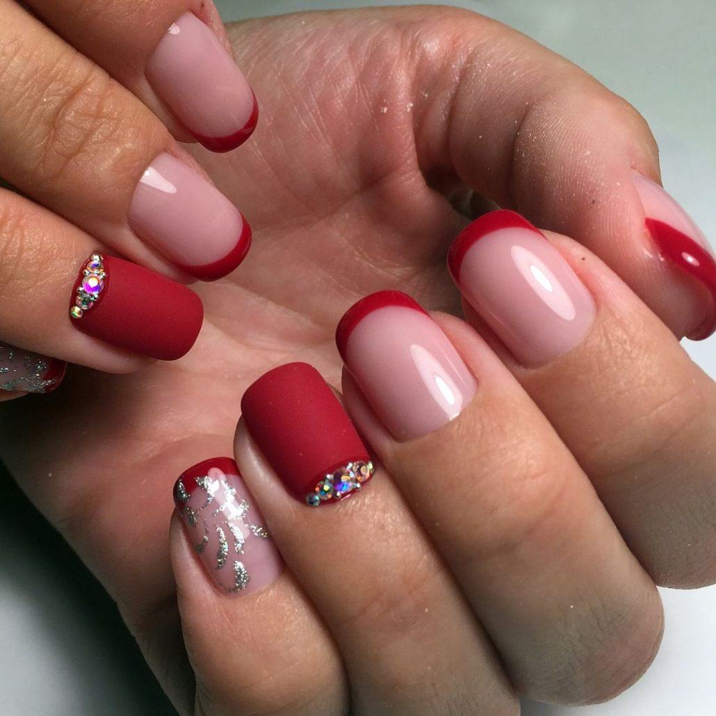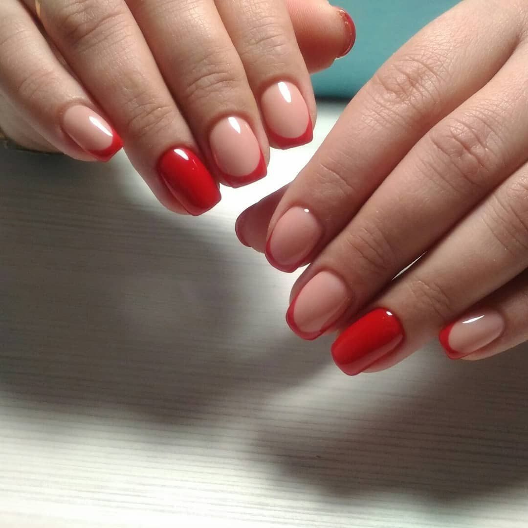 Еще одна модная тенденция — сочетание однотонного маникюра и френча. Например, вы можете сделать классический френч и выделить один ноготок красным цветом. Или наоборот — все ноготки покрыть красным матовым лаком, за исключением 1-2 на каждой руке. Их стоит оформить во французском стиле