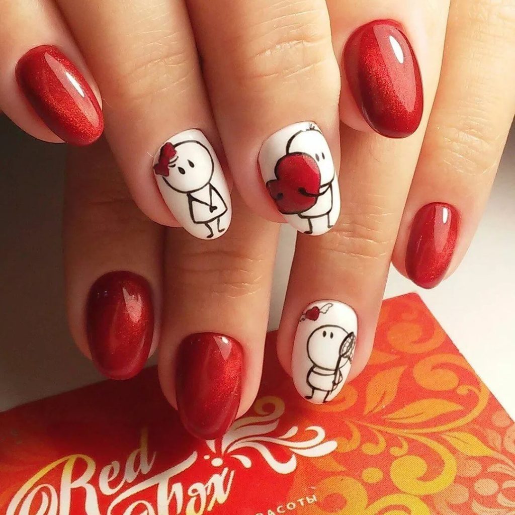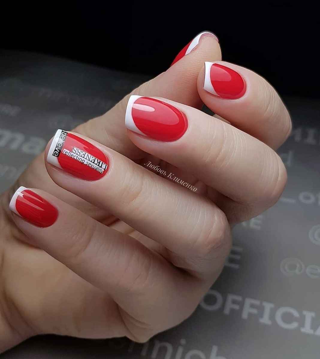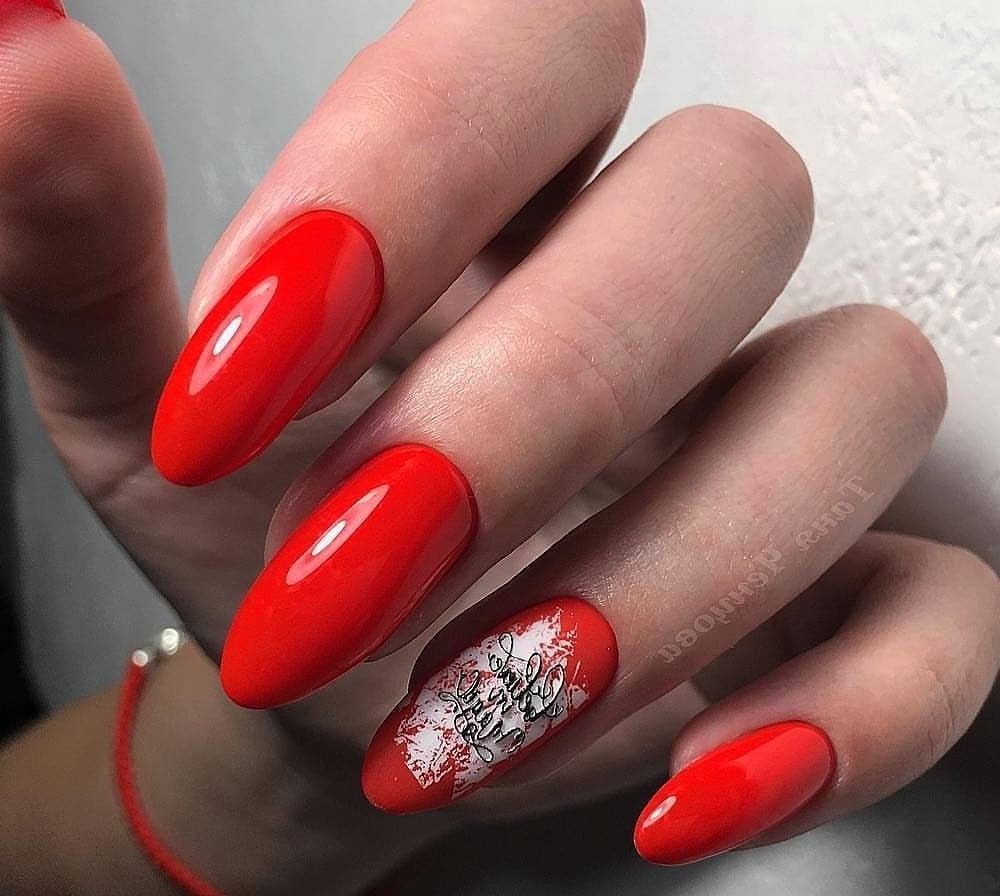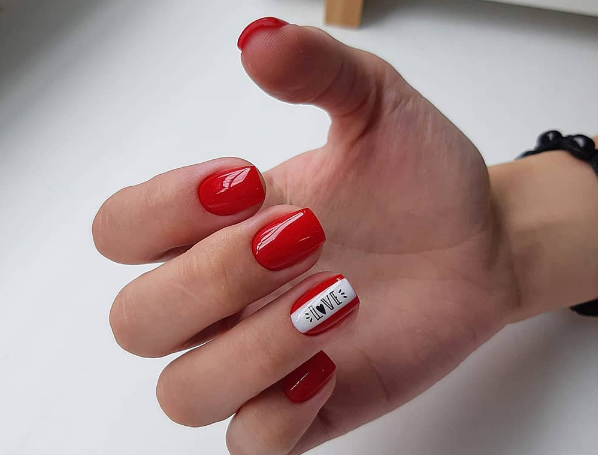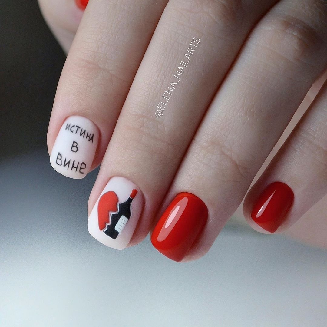 Мы намеренно не включили красный маникюр с надписями в раздел с рисунками, поскольку это отдельный самостоятельный вариант дизайна. Как правило, в этом случае мастер использует сочетание нескольких цветов. Например, красный и белый. На руке оставляют акцентный ноготь белого цвета, где и размещают забавные или серьезные надпись. Кстати, надпись можно создать с помощью наклеек стемпинга или кисточки.