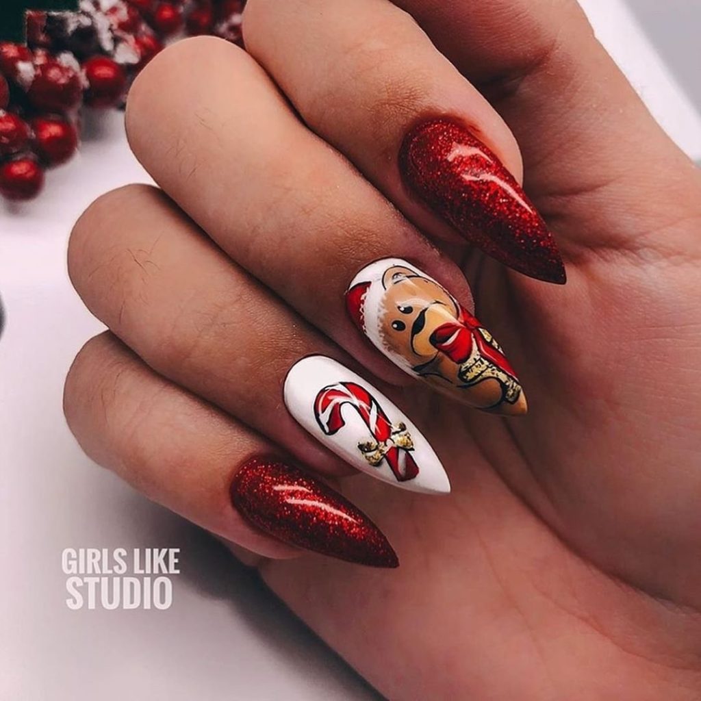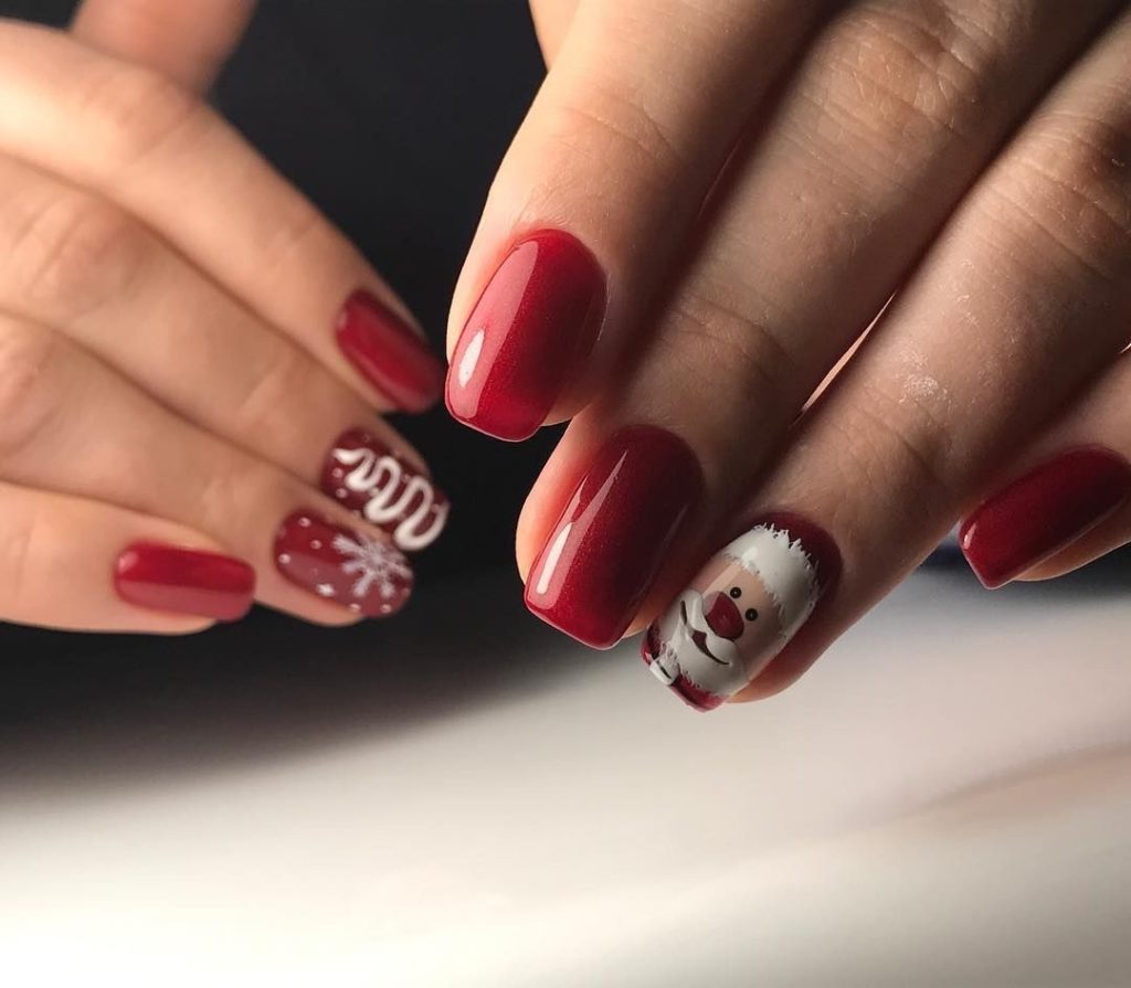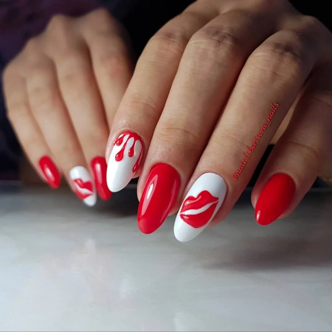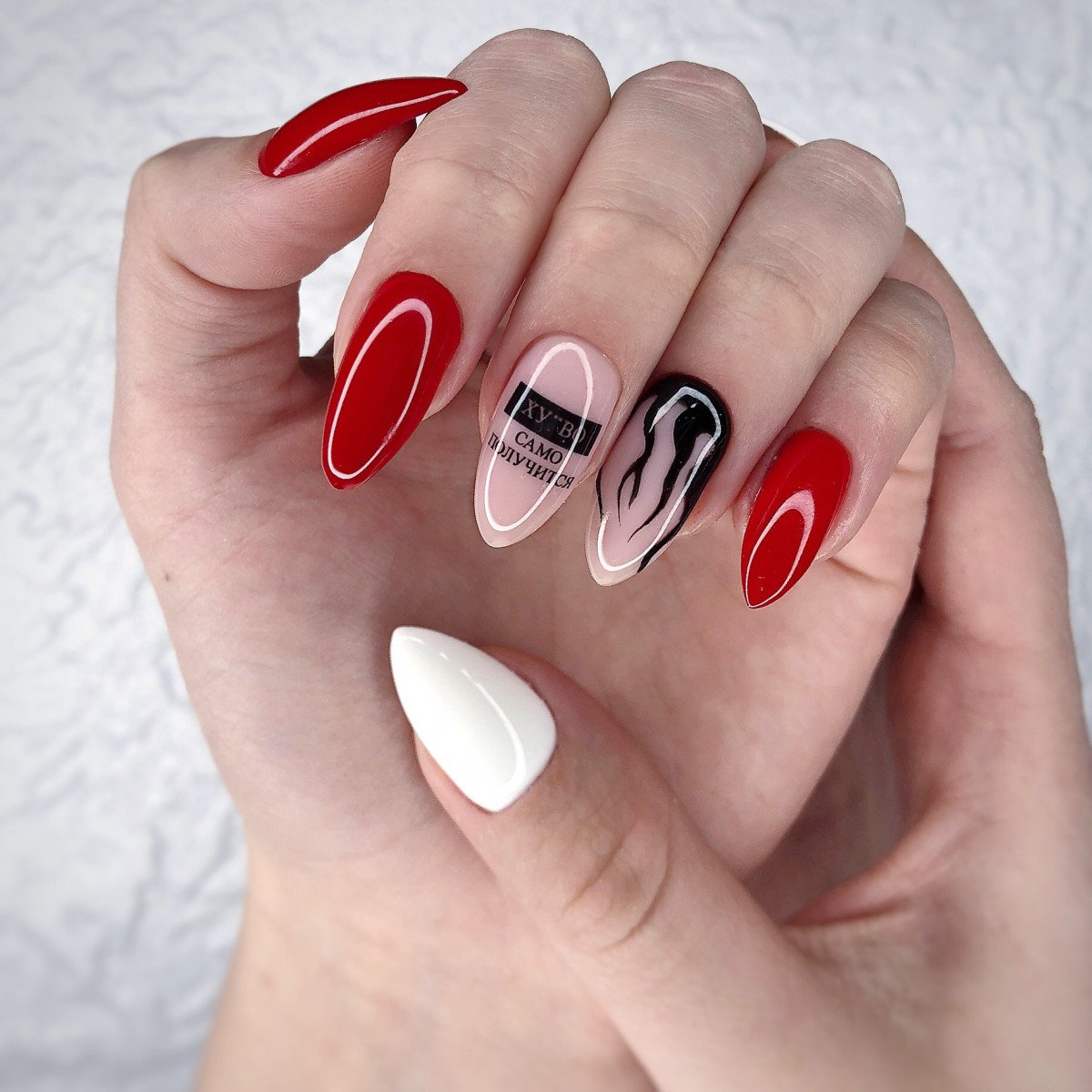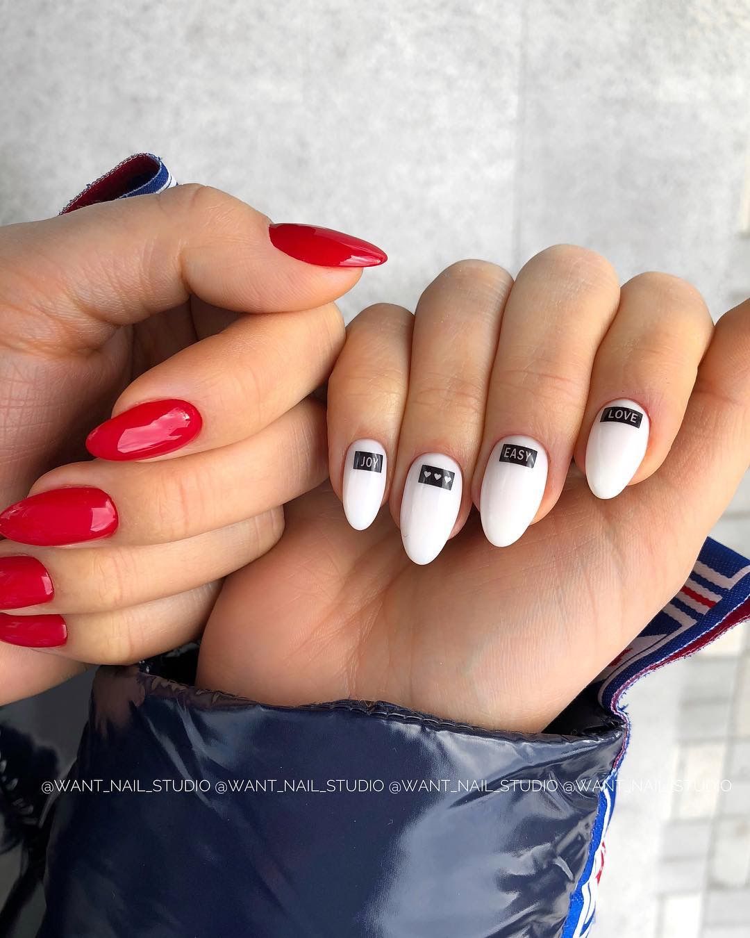 Мы намеренно не включили красный маникюр с надписями в раздел с рисунками, поскольку это отдельный самостоятельный вариант дизайна. Как правило, в этом случае мастер использует сочетание нескольких цветов. Например, красный и белый. На руке оставляют акцентный ноготь белого цвета, где и размещают забавные или серьезные надпись. Кстати, надпись можно создать с помощью наклеек стемпинга или кисточки.