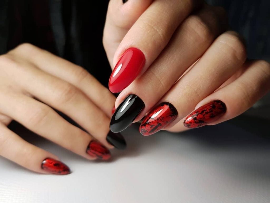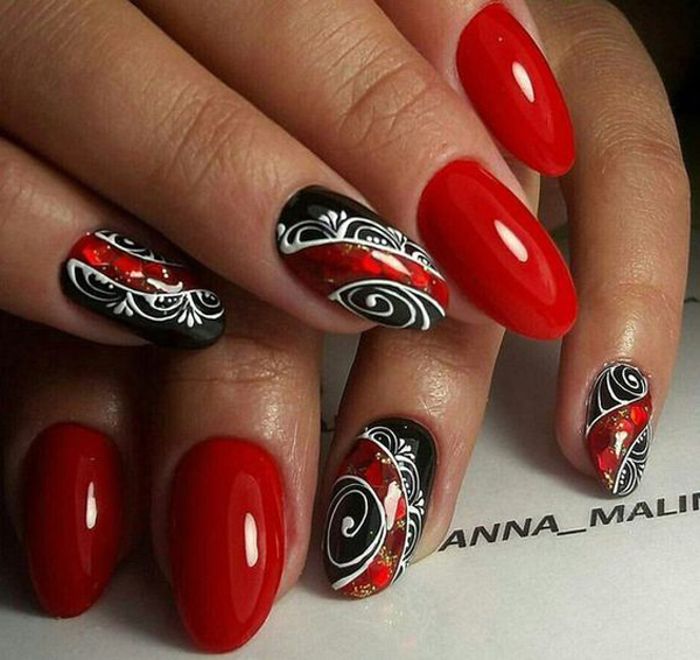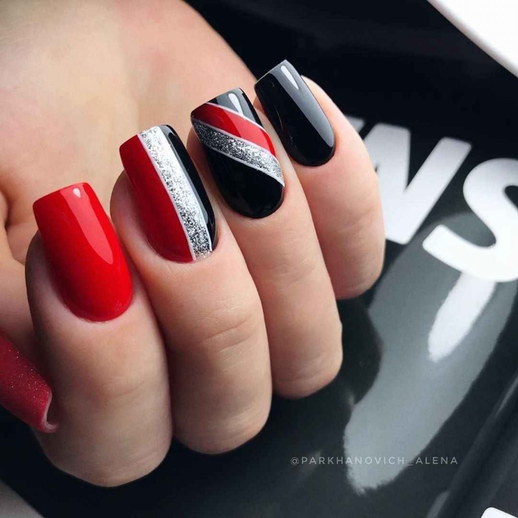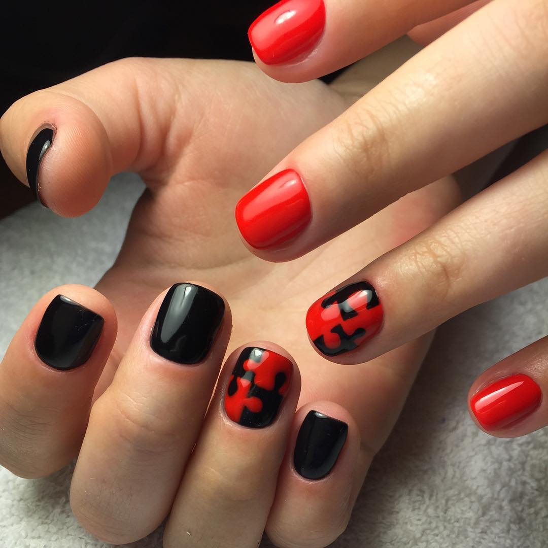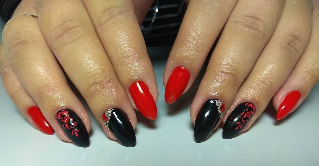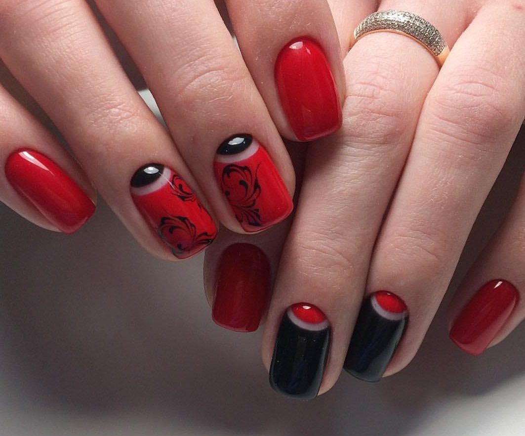 - черный. Такое сочетание — это гламур, страсть и рок. Черно-красный маникюр — это отличный вариант для вечернего маникюра. В дневное время такое сочетание может быть слишком тяжелым, но тоже имеет место быть;