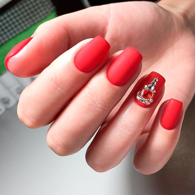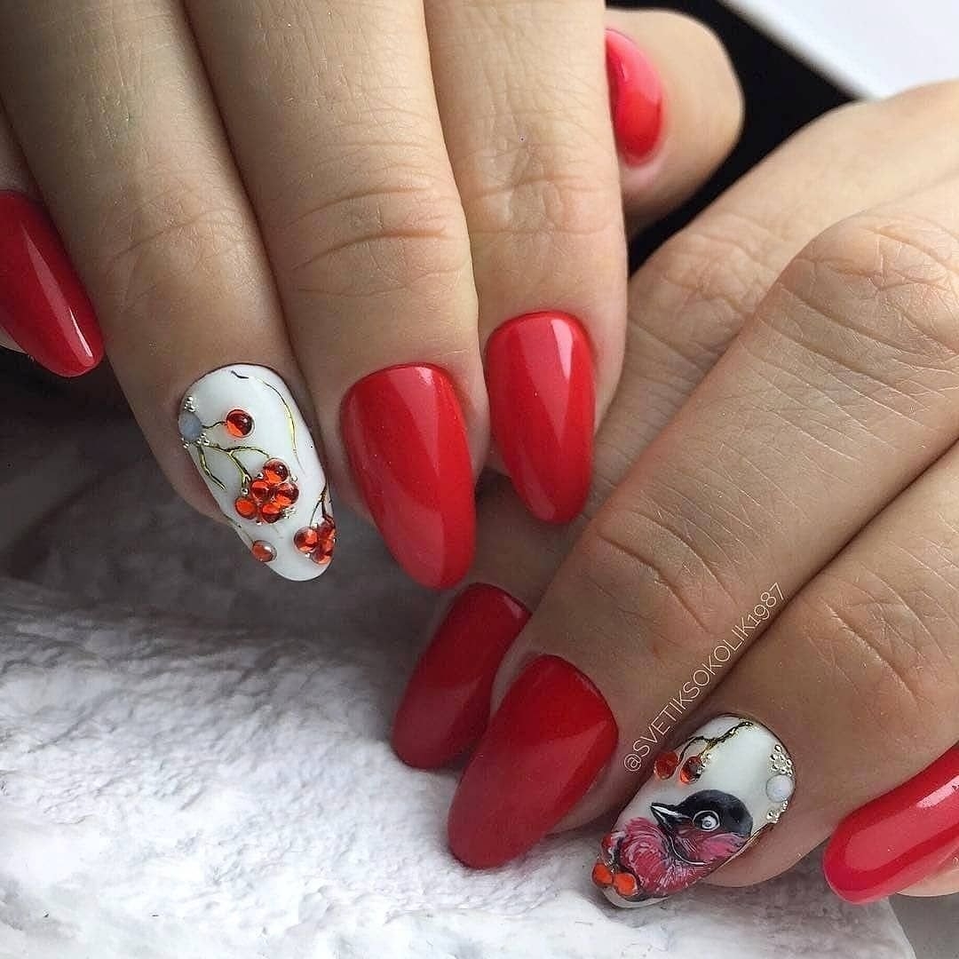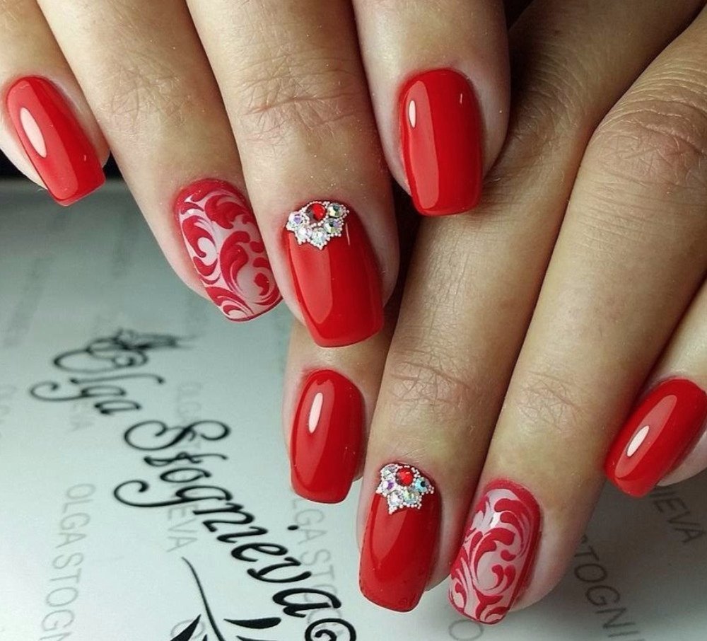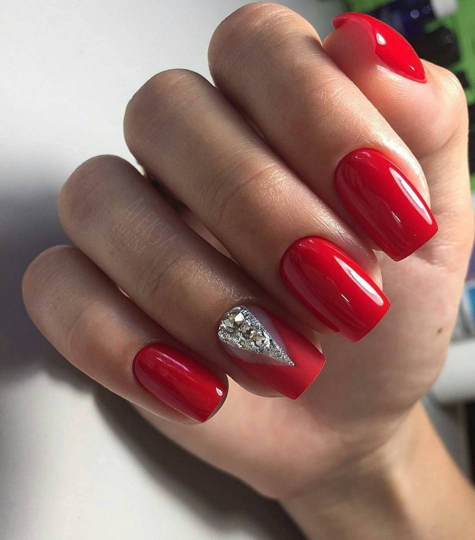 Особенно если дело касается дневного маникюра. Для красного маникюра мы рекомендуем выбрать классические серебристые стразы. И самым оптимальным вариантом мастера называют вариант дизайна с выделением всего одного ноготка с помощью втирки.