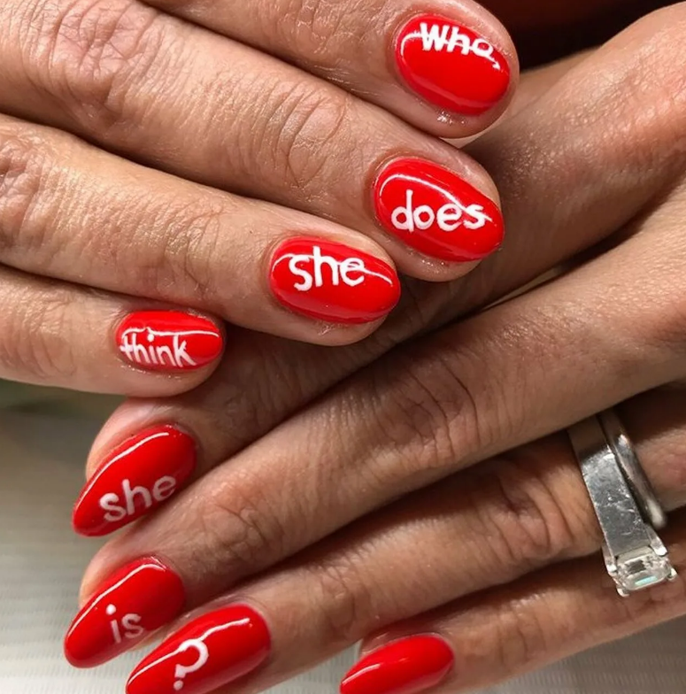 Обратите внимание, надпись может быть забавной, смешной, серьезной или выражать ваше настроение. В интернете можно встретить множество фотографий с красным маникюром и неприличными надписями. Конечно, такой дизайн имеет место быть. Делать его стоит только в том случае, если вы не опасаетесь последствий. Неприличные надписи вкупе с красным маникюром — это некий вызов обществу. Хотя, если ваша цель — эпатаж, стоит выбрать именно такой дизайн.
