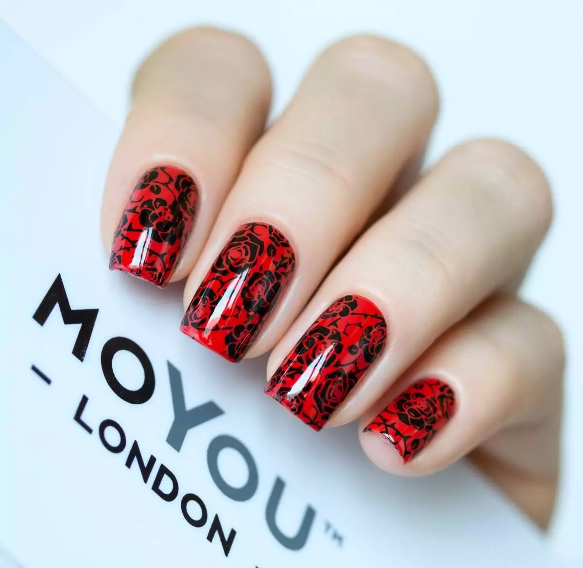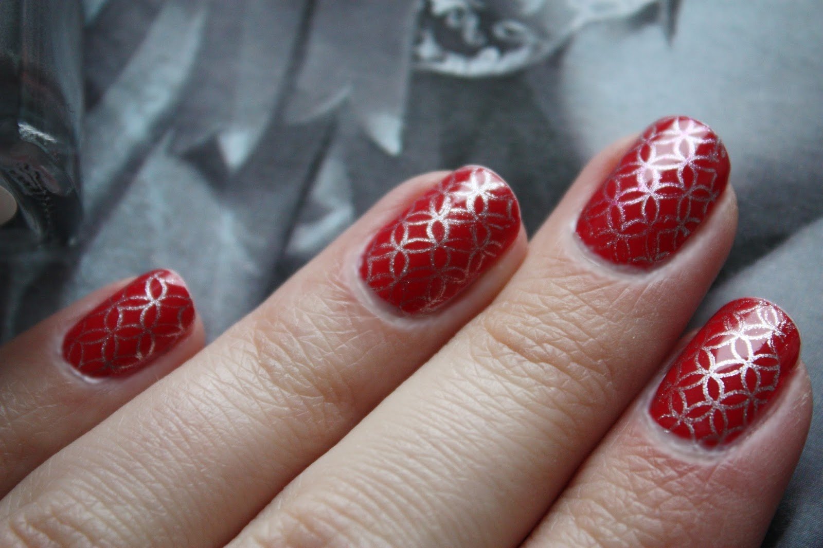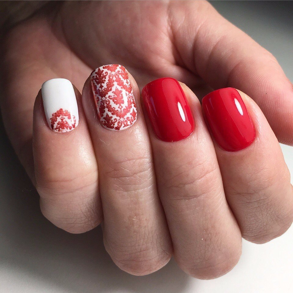 Отлично смотрится стемпинг именно на матовой красной текстуре. Чтобы не перегружать маникюр рисунками, стоит использовать нейтральные оттенки. Например, белый, серебристый, золотой и другие. Красный маникюр со стемпингом — это стильно и сексуально.