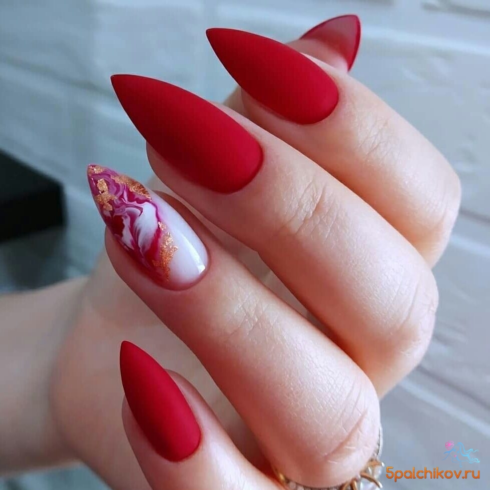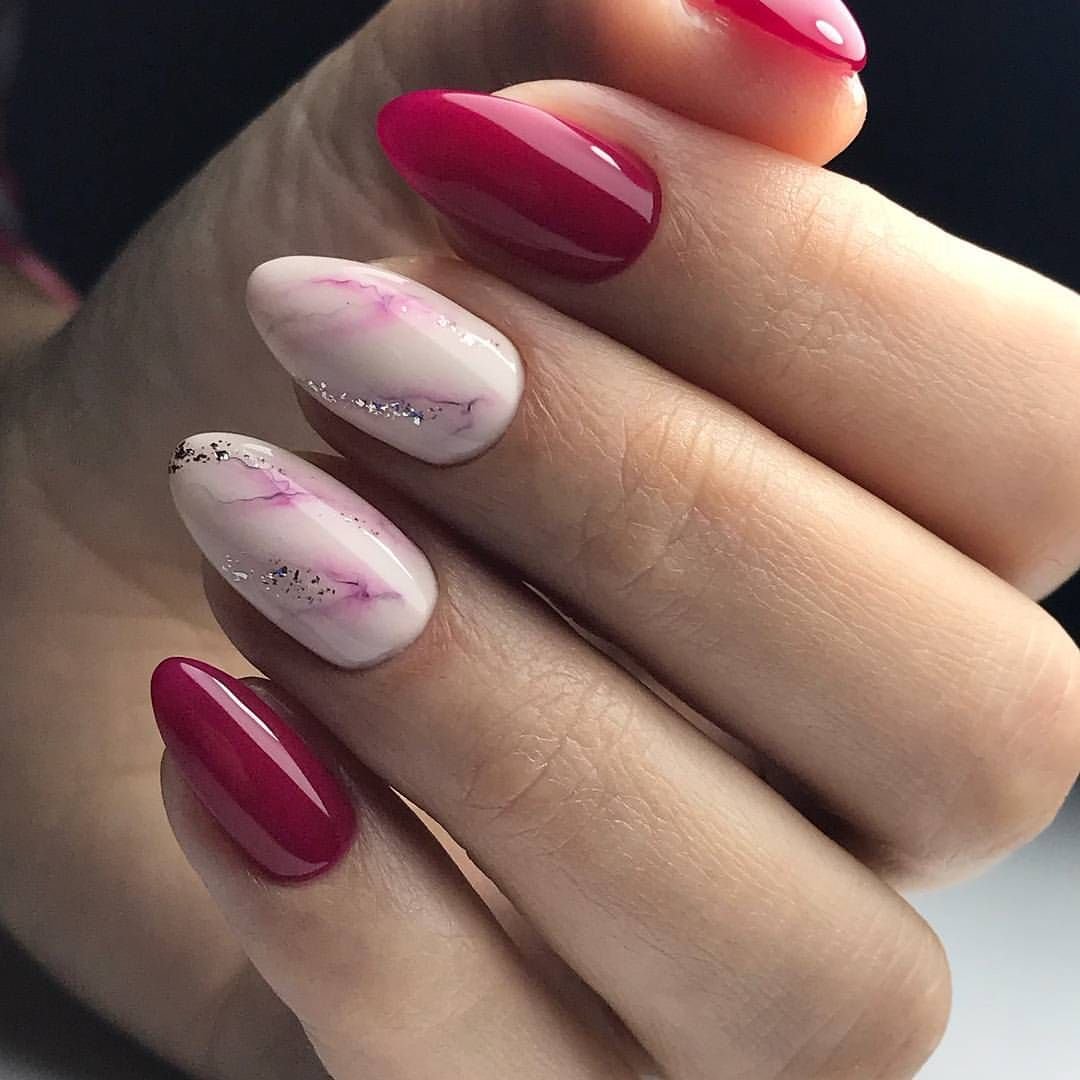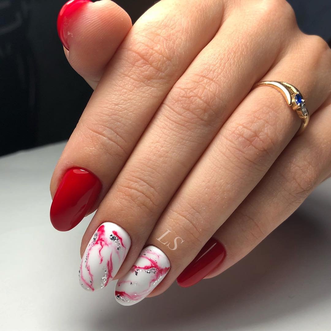 Красный мрамор на ногтях — это необычно и очень стильно. В этом сезоне модно совмещать мраморный дизайн с матовым топом. Кроме того, если вы хотите добавить немного блеска и сделать маникюр максимально натуральным, нарисуйте аккуратные блестящие прожилки. Это можно сделать с помощью блесток, специального лака или фольги. Так у вас ногтях получится создать натуральную текстуру камня.