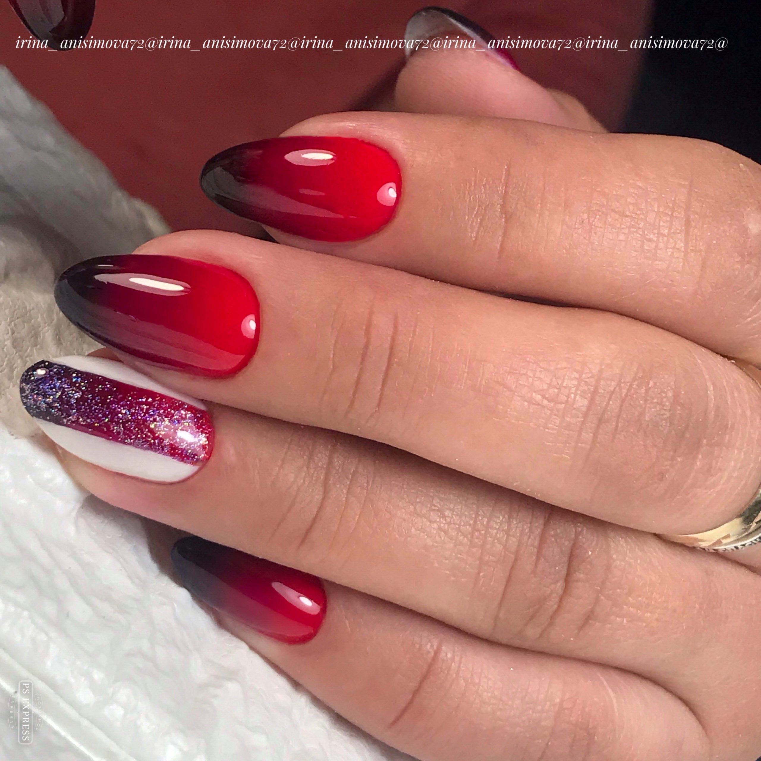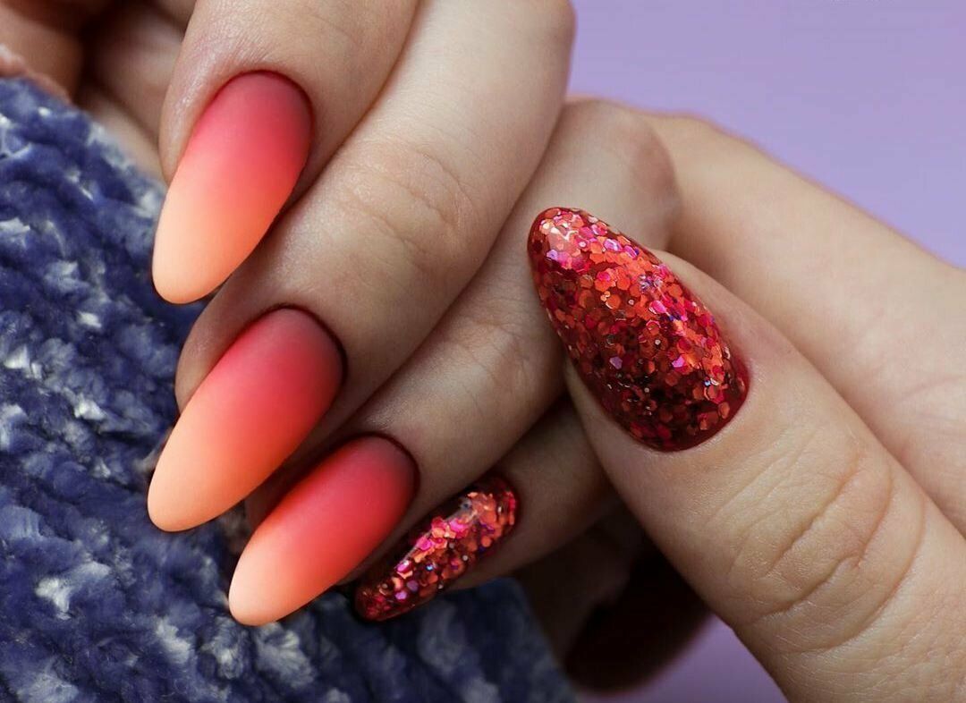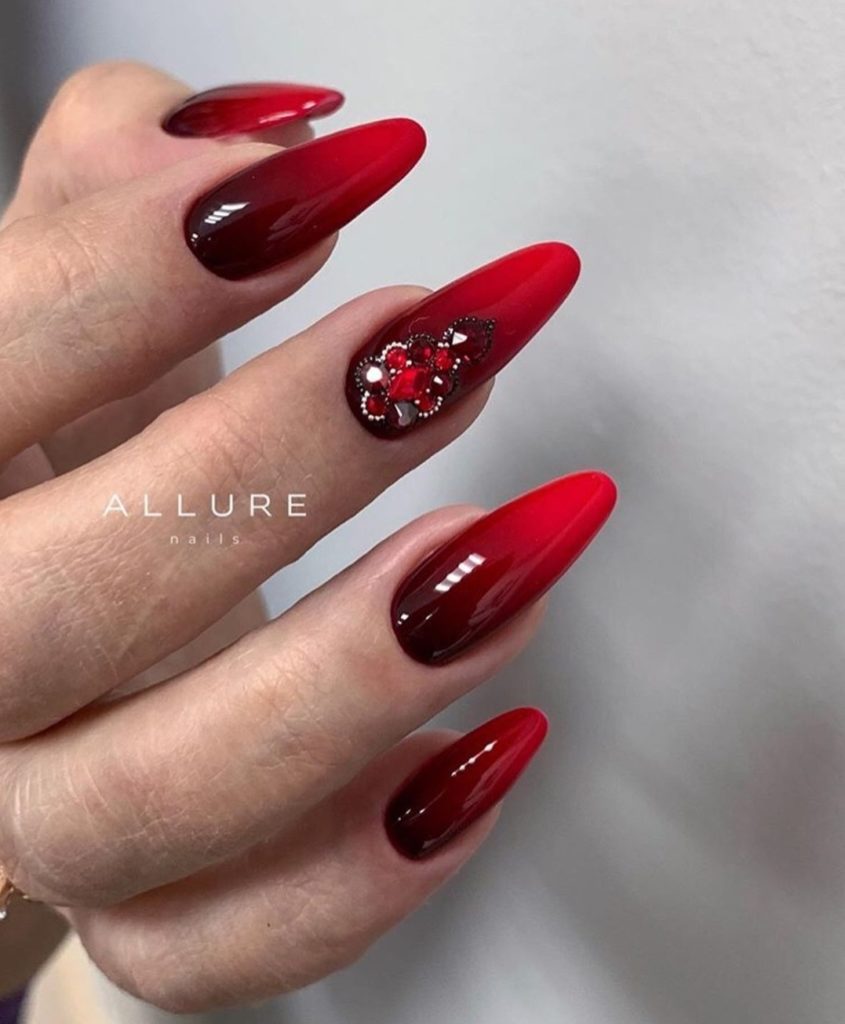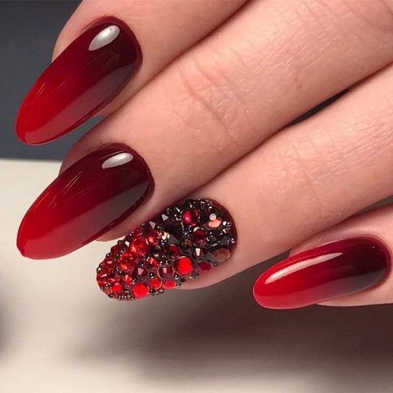 Кстати, омбре отлично сочетается с разными техниками. Например, омбре в красном оттенке со стемпингом, рисунками, стразами и блестками.