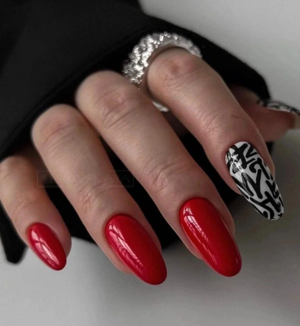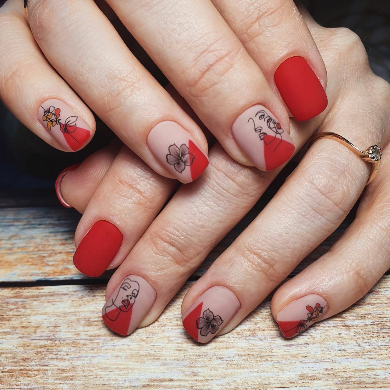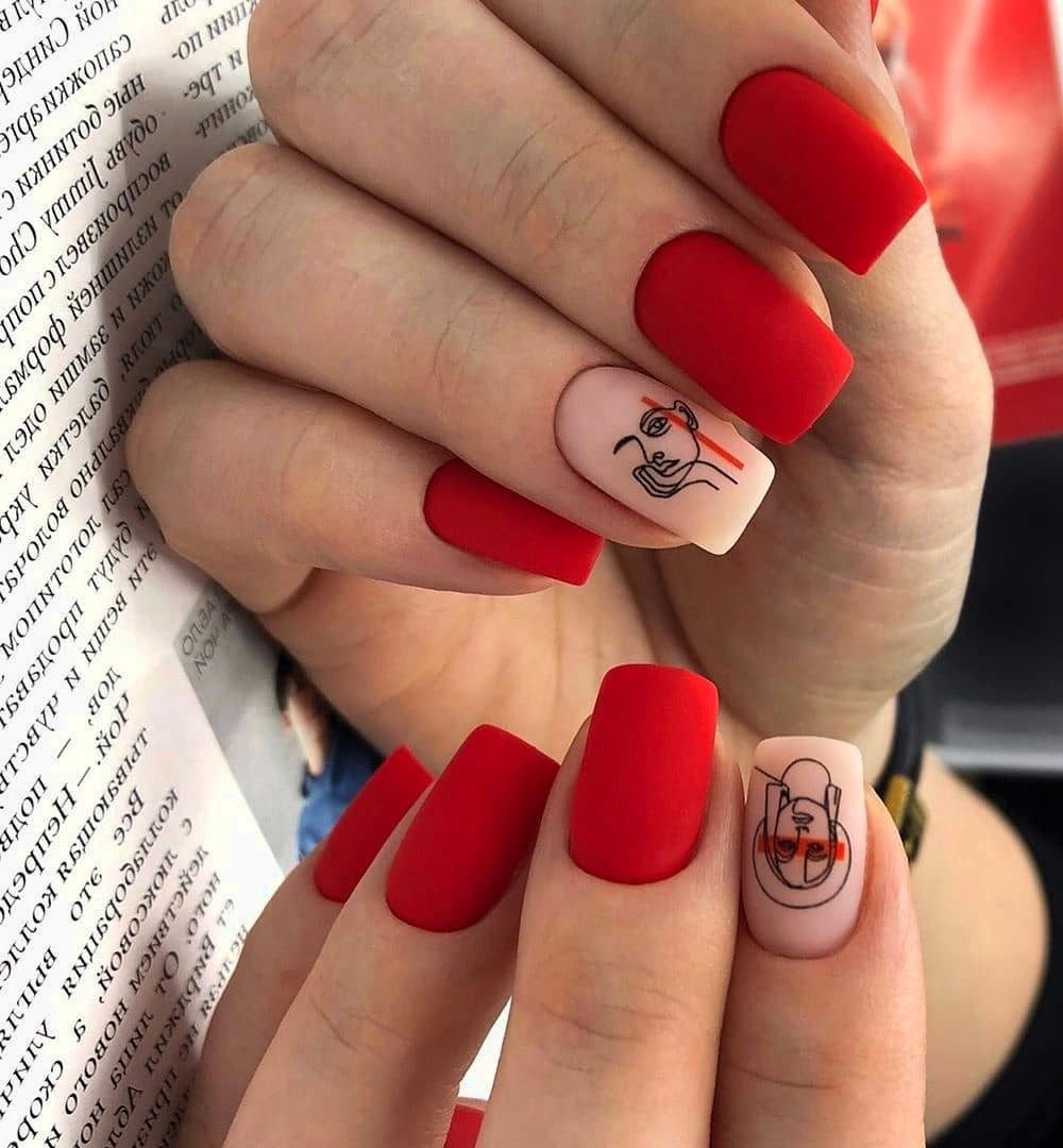Отдельно выделим такой вариант рисунка как абстракция. Это целое направление в дизайне ногтей. И особенно стильно смотрится именно в красном исполнении. В 2026 году особо модными считаются абстрактные рисунки лиц в стиле Пабло Пикассо. Они могут выполняться в технике разные руки, покрываться матовым или глянцевым топом, а также дополняться фольгой или блестками.