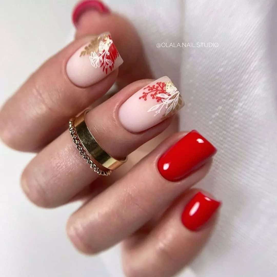 - бежевый. Натуральный оттенок сможет уравновесить активность и яркость красного, сделать маникюр более спокойным. Такое сочетание можно адаптировать для ежедневного ношения. В этом случае мы рекомендуем красный использовать как акцент. В то время как база будет бежевой;
