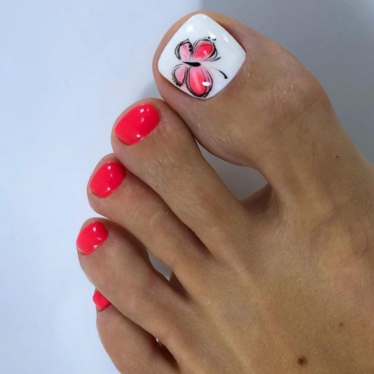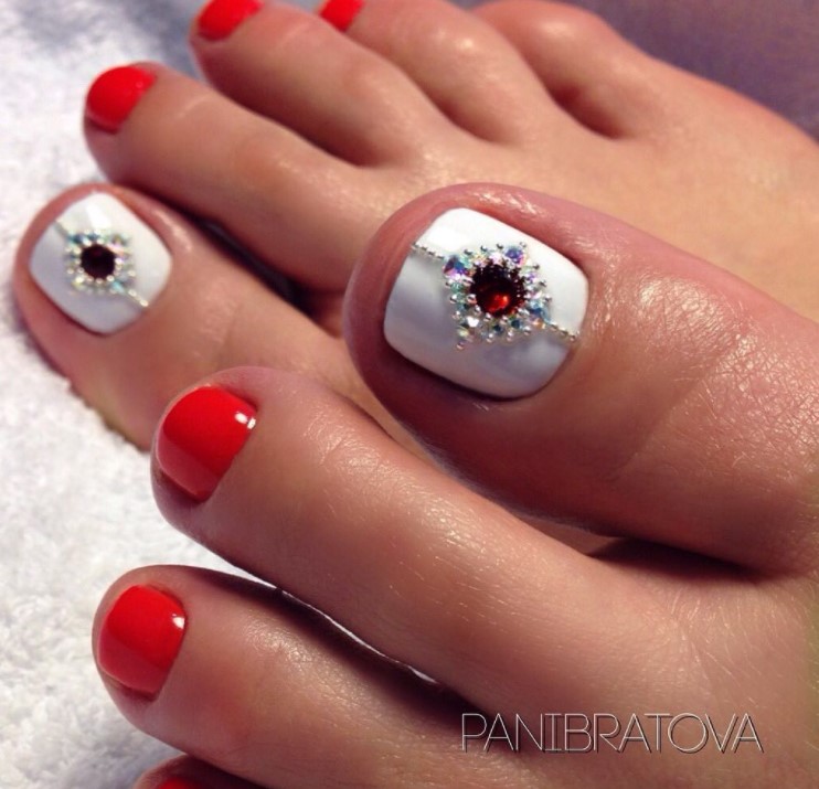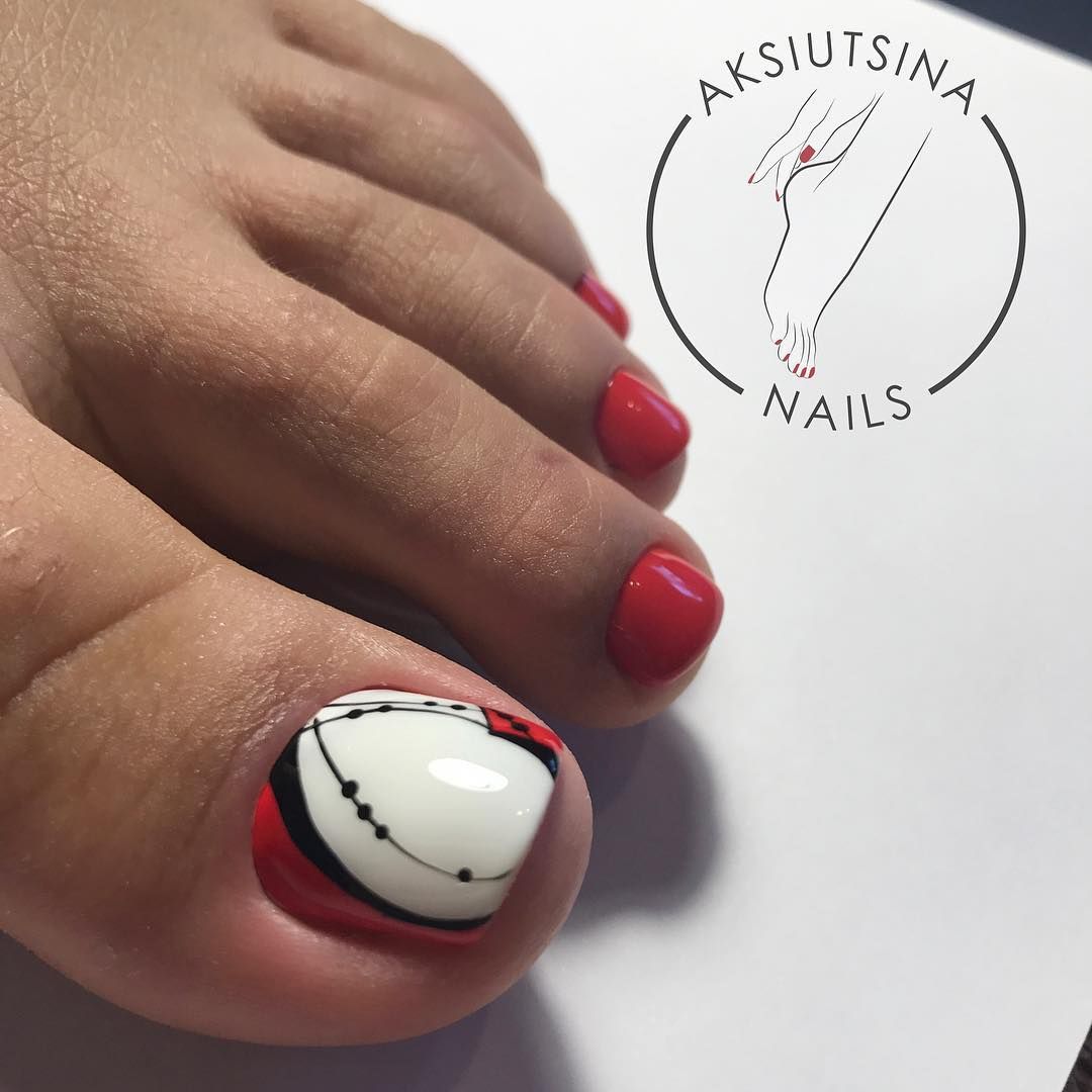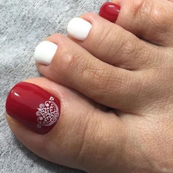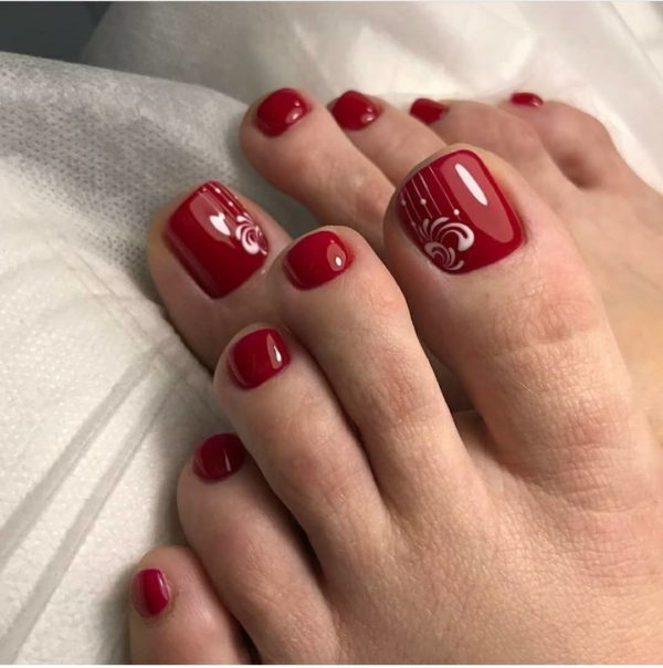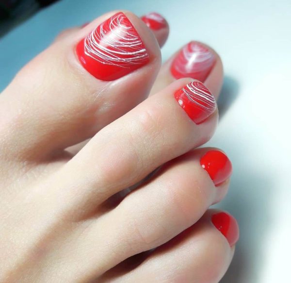 Белый в сочетании я с красным позволит сделать педикюр более воздушным и легким. Эффектно смотрится красная база с легкими точечными белыми узорами. Зимой на такой базе красиво смотрятся белые снежинки, а в летний период можно нарисовать белые цветы.