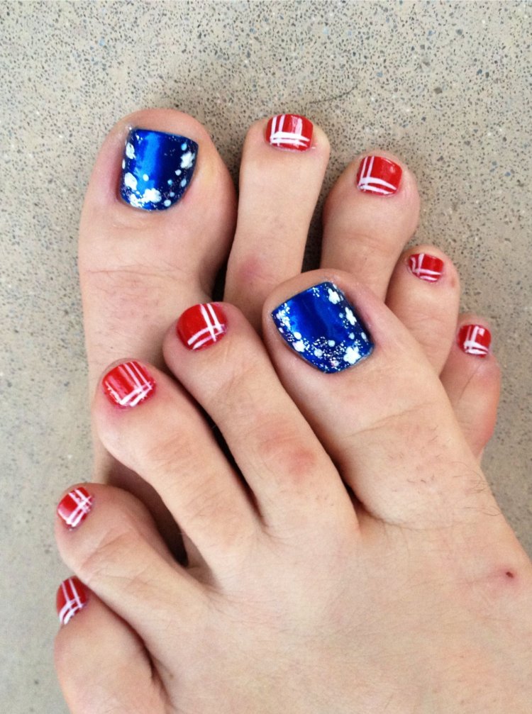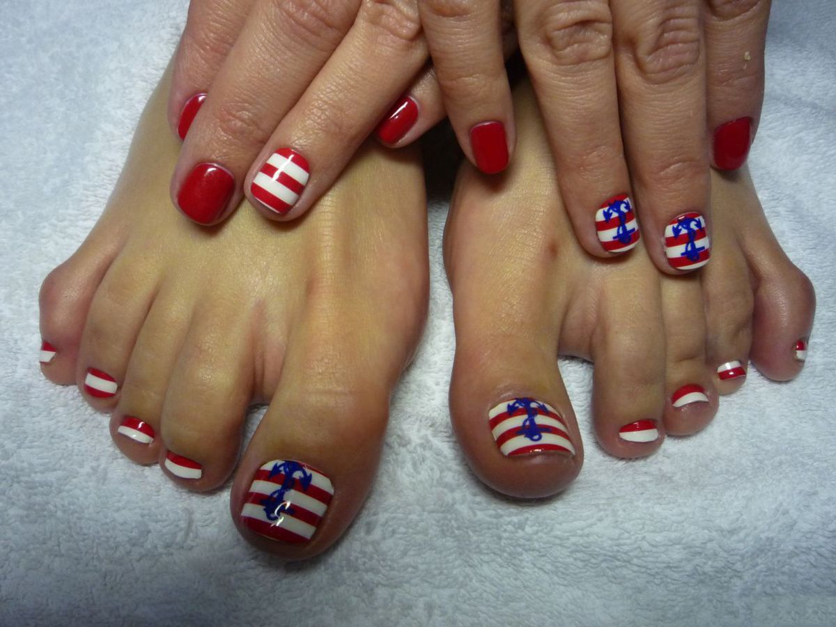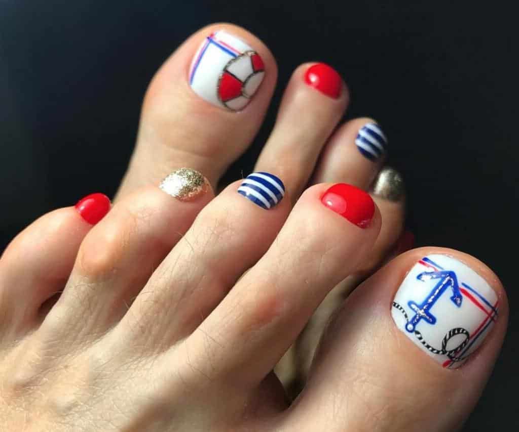 Красный и синий — беспроигрышный вариант для педикюра. Синий уравновесит активность алого или пурпурного. Если разбавить оба оттенка золотым или серебряным декором, можно сделать стильный педикюр в морском стиле.