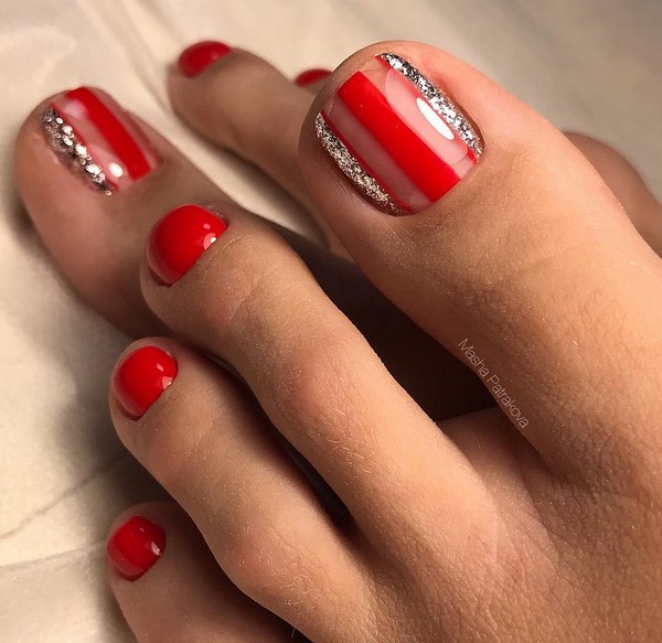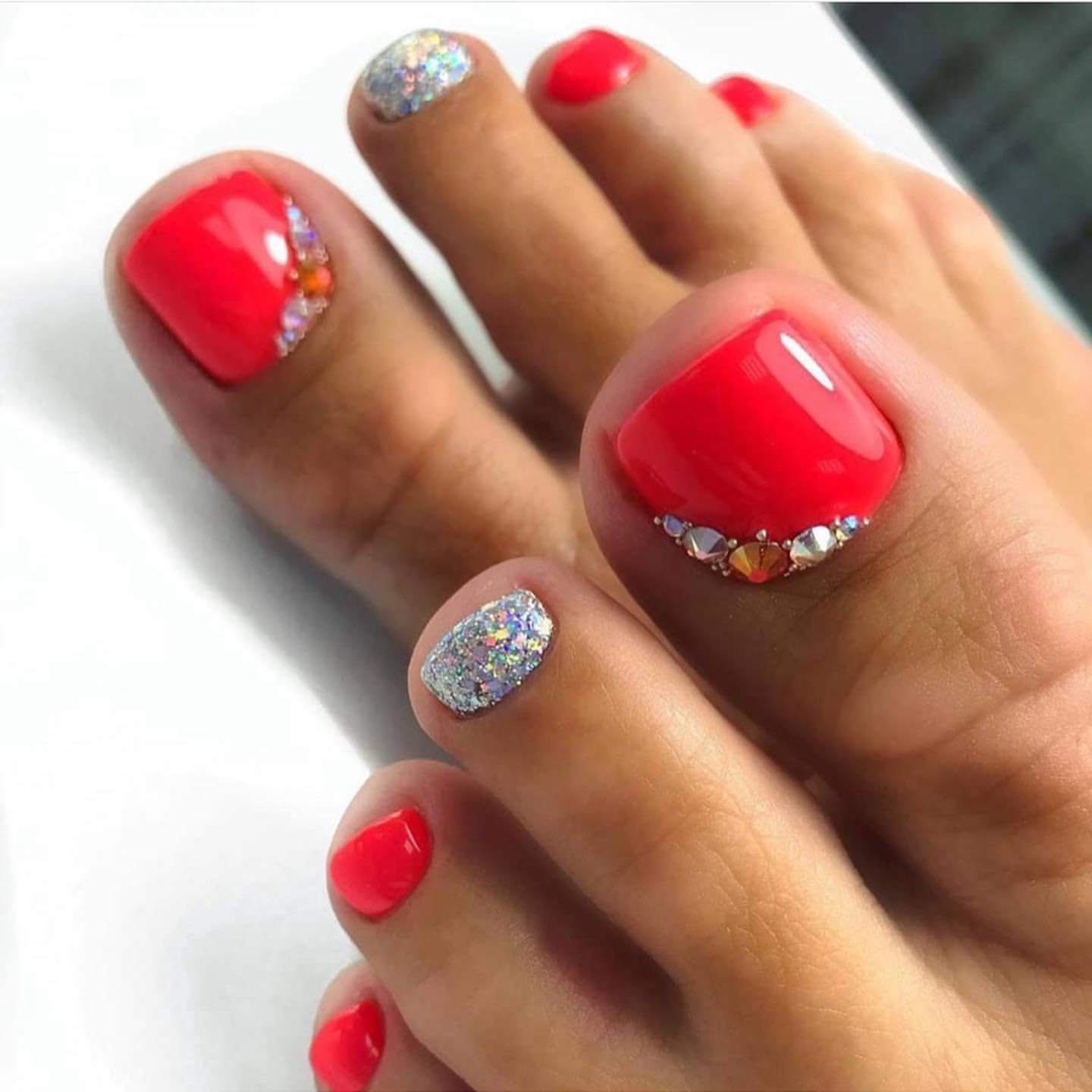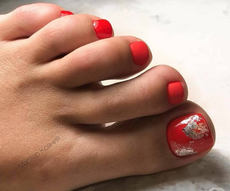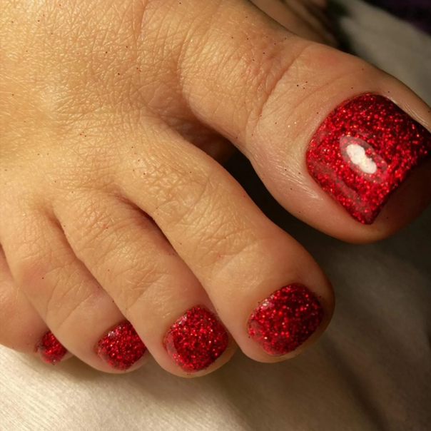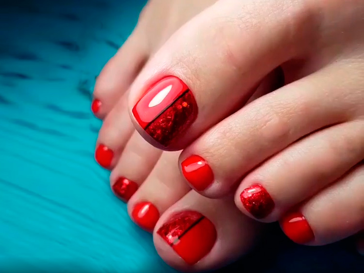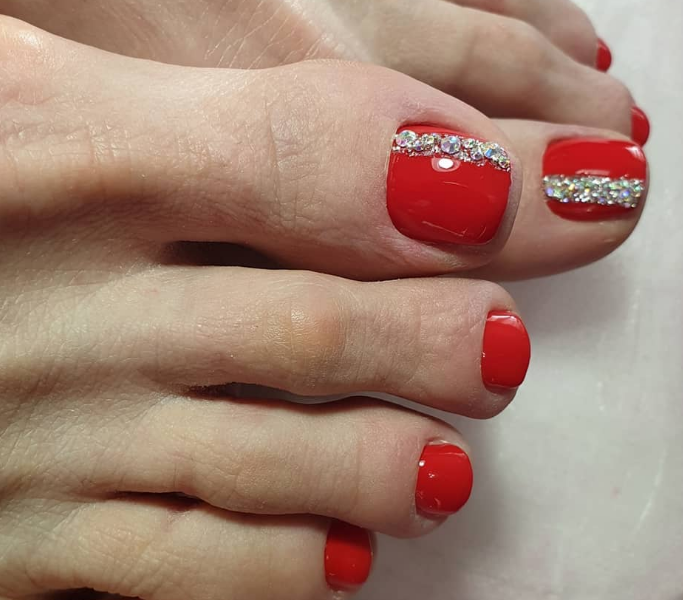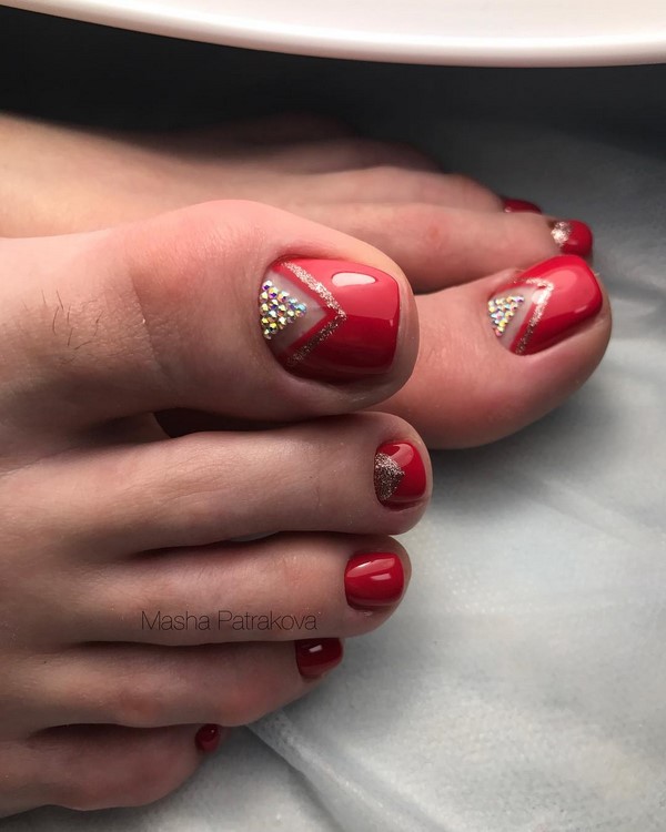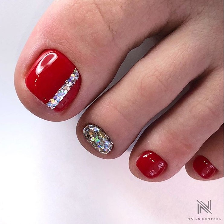 Хотите максимум блеска, оформите все ноготки в красный и добавьте глиттера или рассыпчатых блесток. Это практичный и очень стильный вариант педикюра для любого сезона.