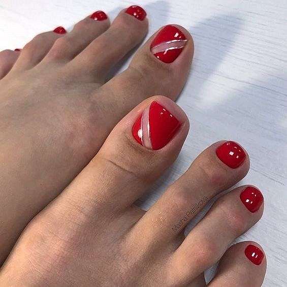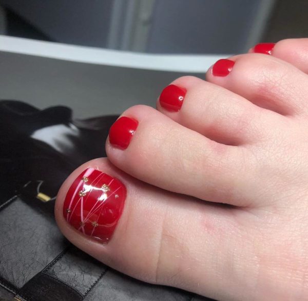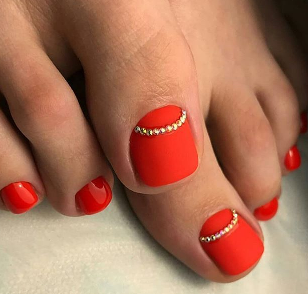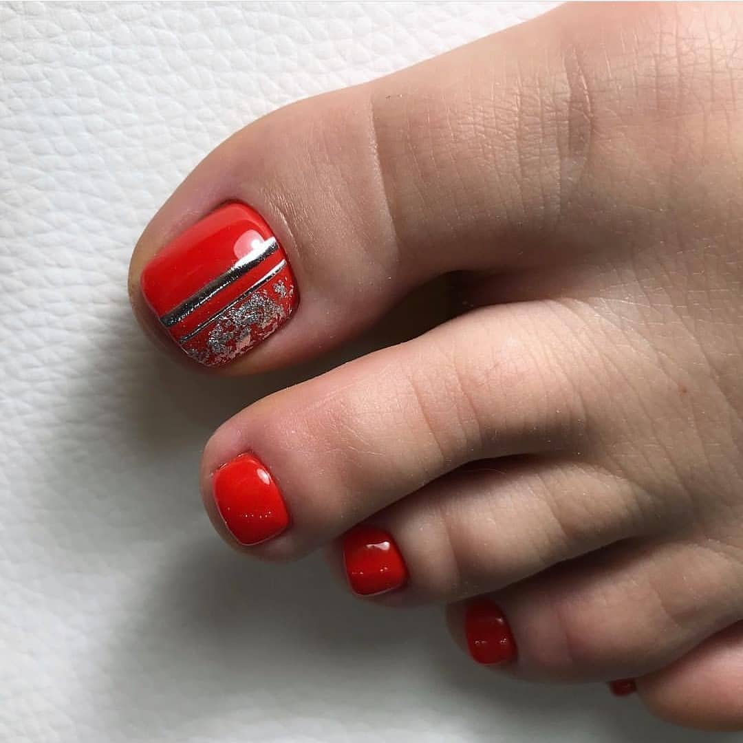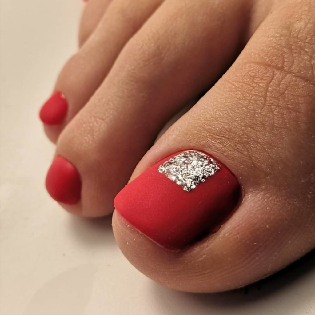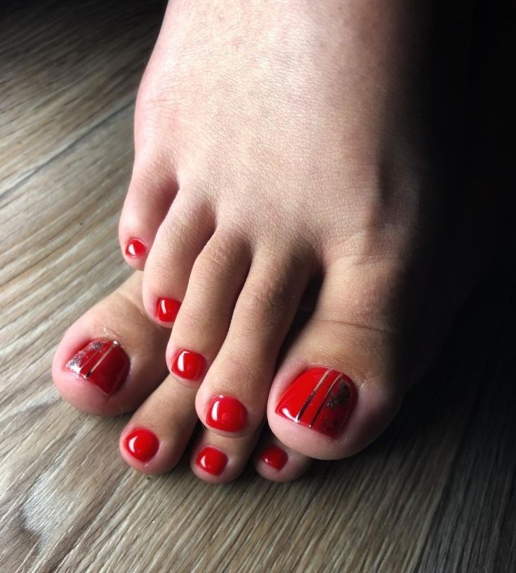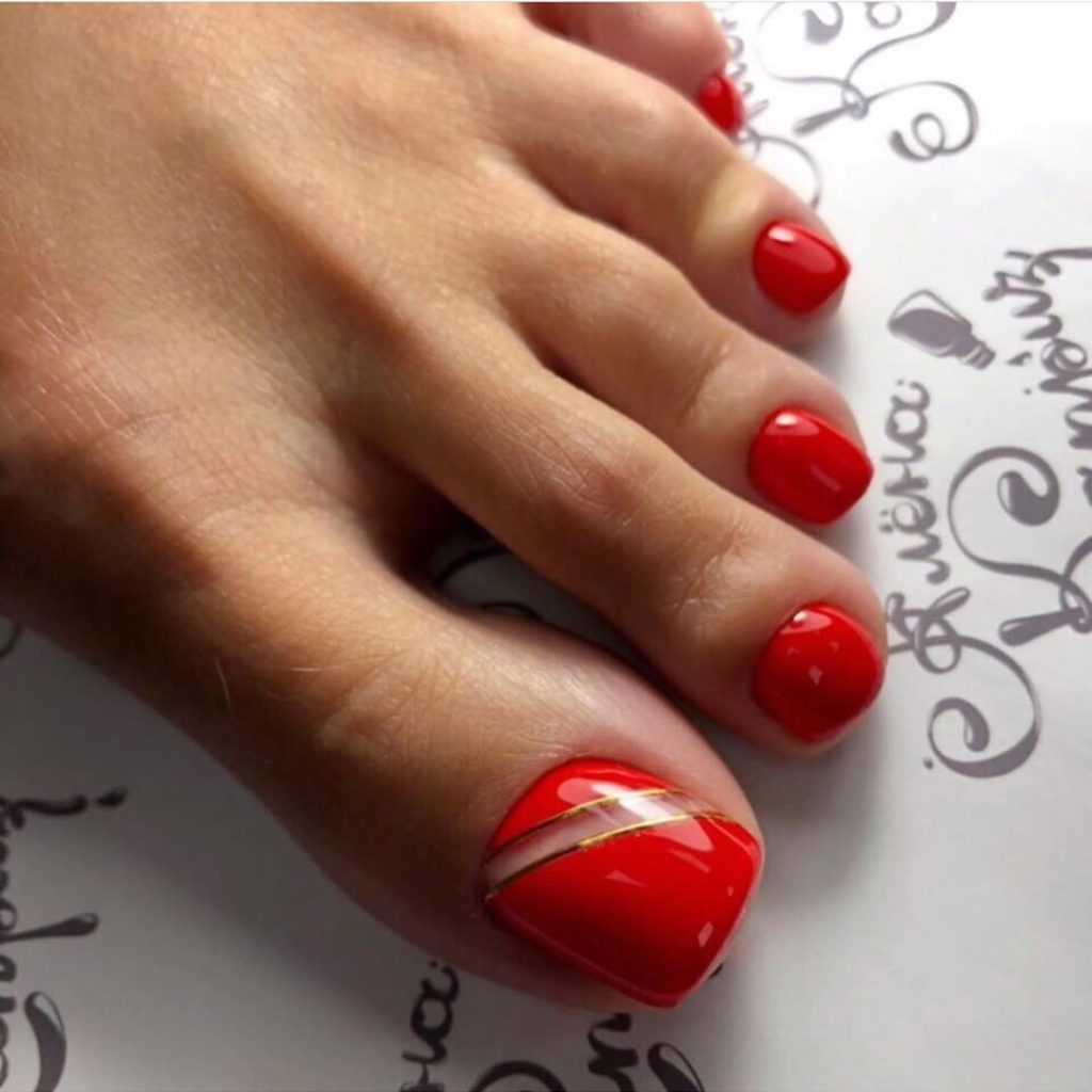 Хотите максимум блеска, оформите все ноготки в красный и добавьте глиттера или рассыпчатых блесток. Это практичный и очень стильный вариант педикюра для любого сезона.
