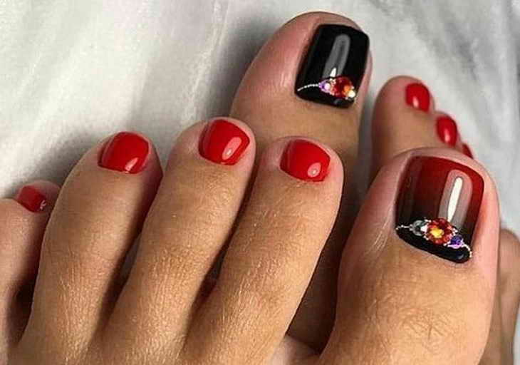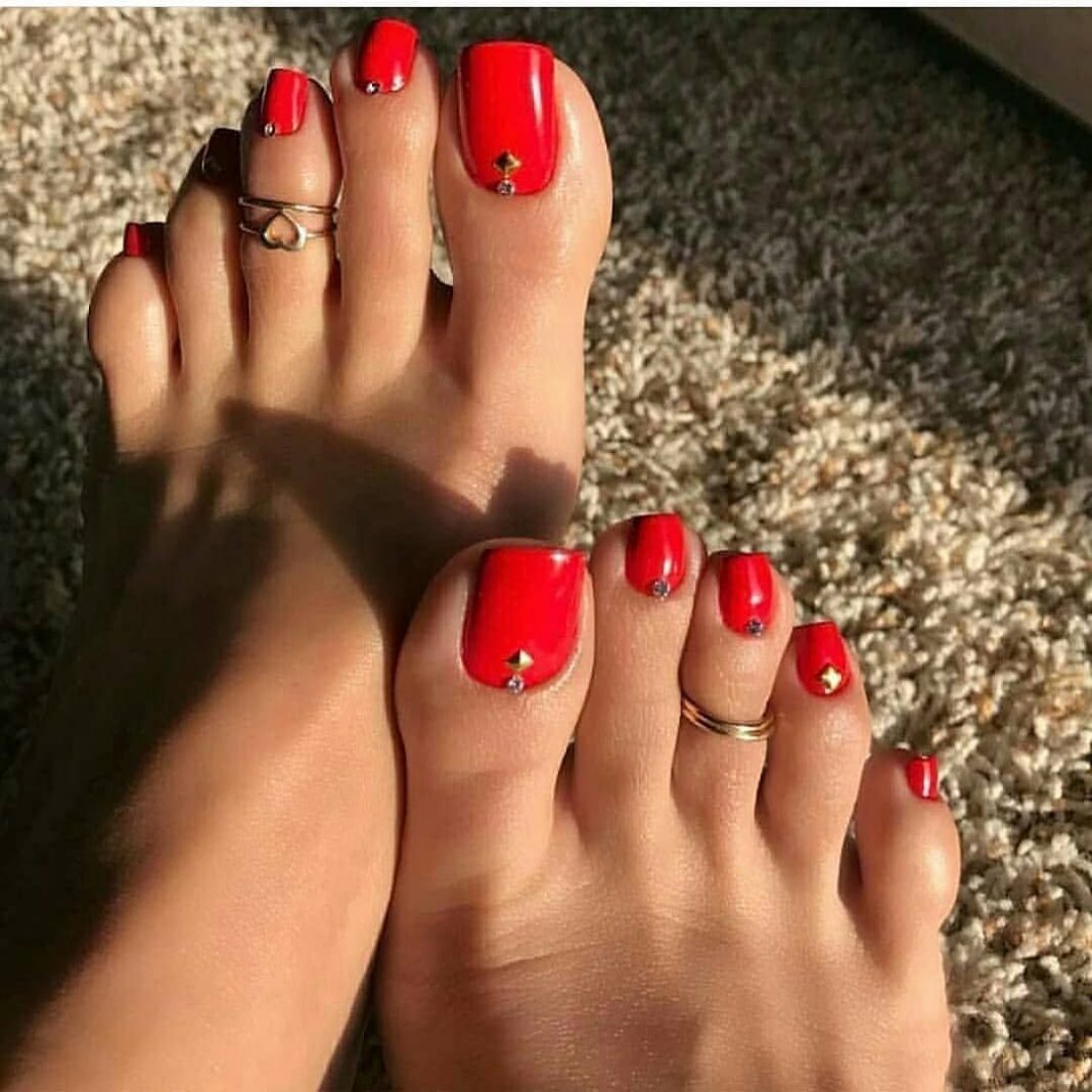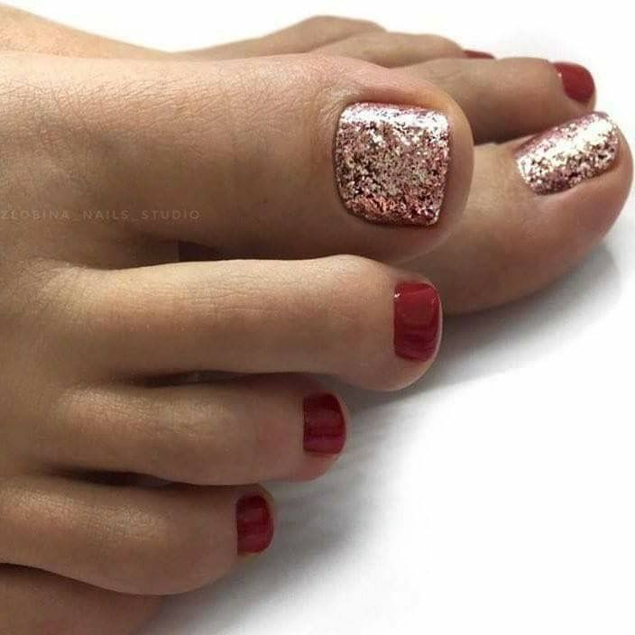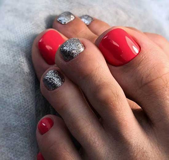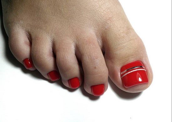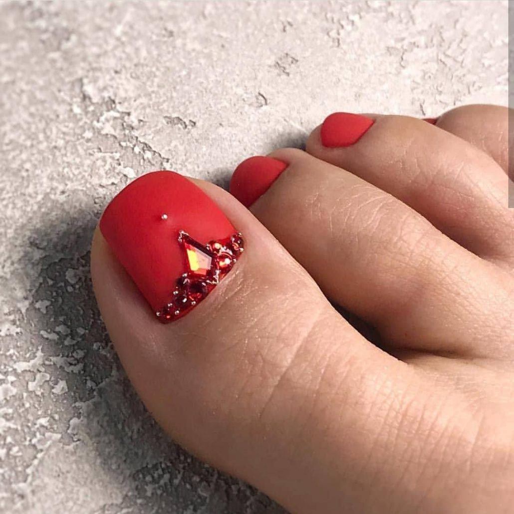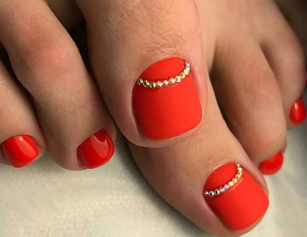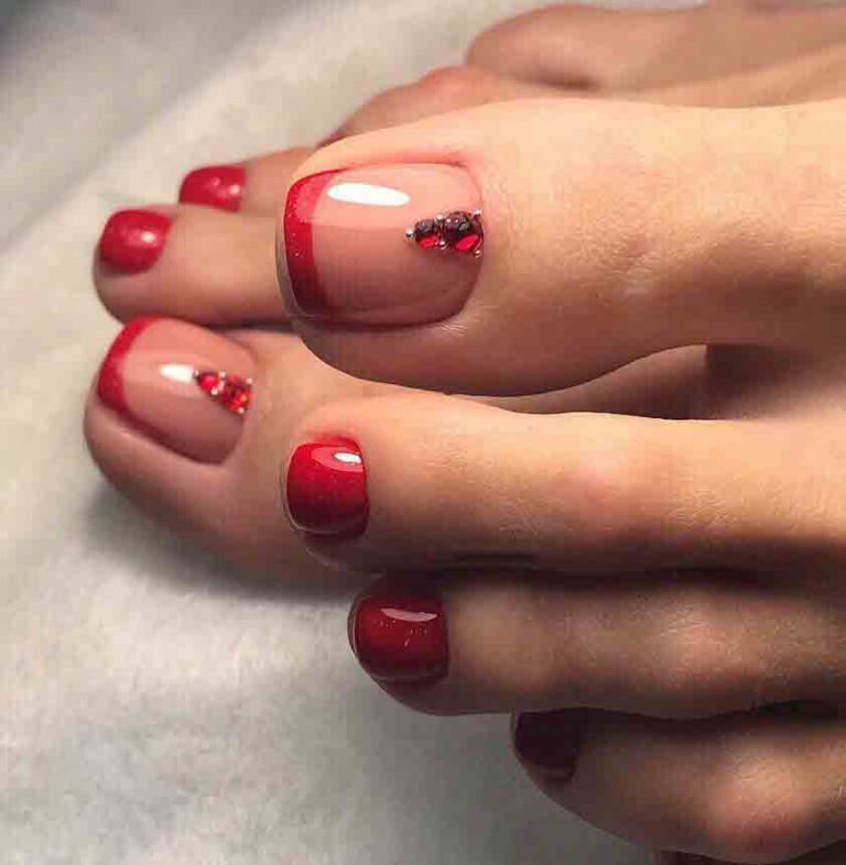 Хотите максимум блеска, оформите все ноготки в красный и добавьте глиттера или рассыпчатых блесток. Это практичный и очень стильный вариант педикюра для любого сезона.