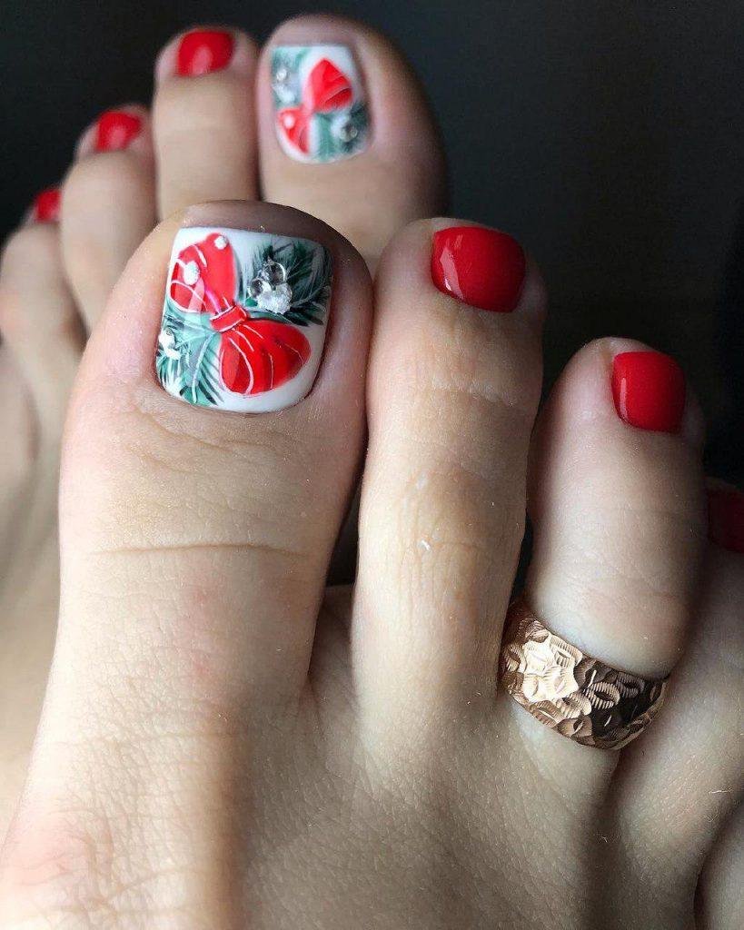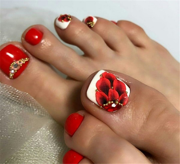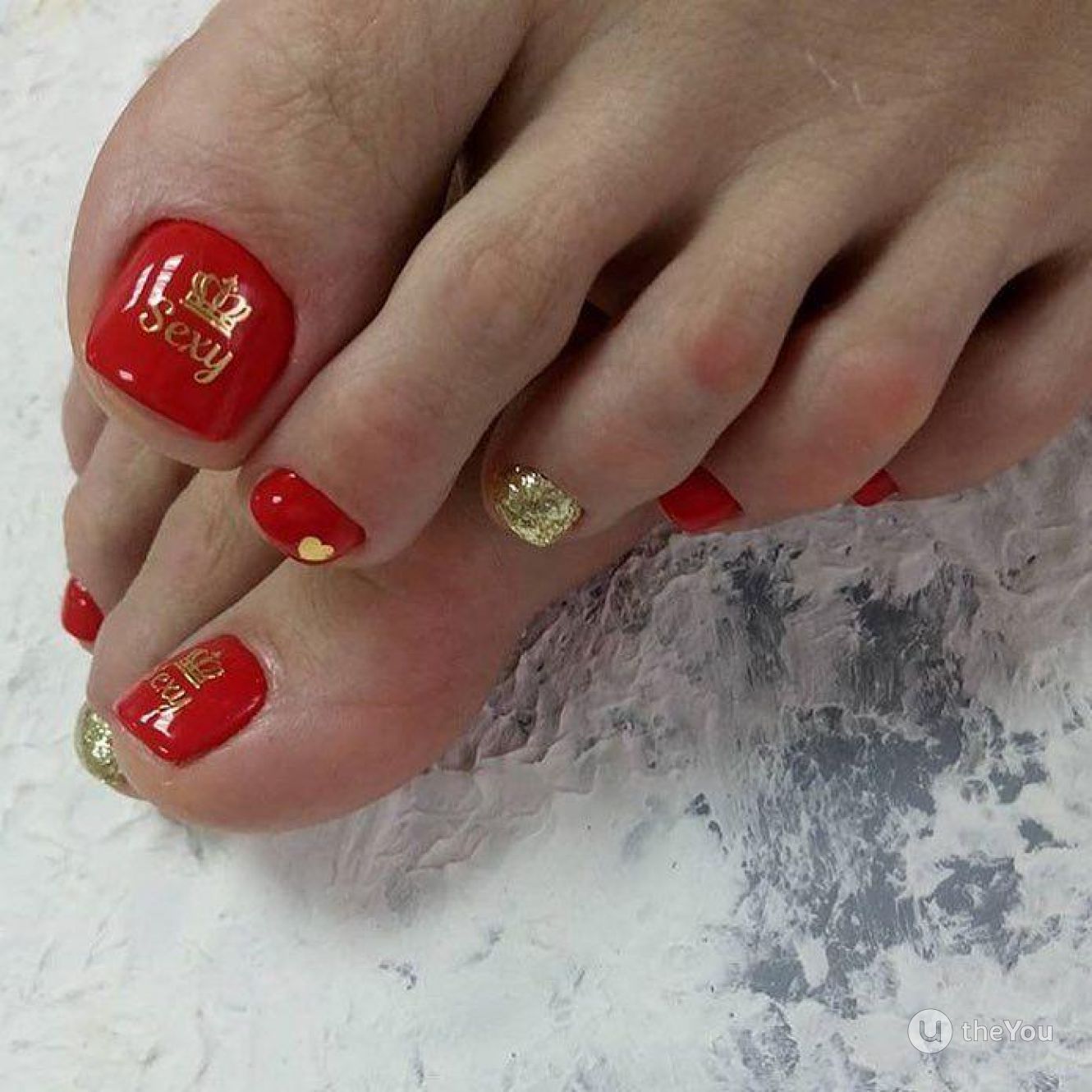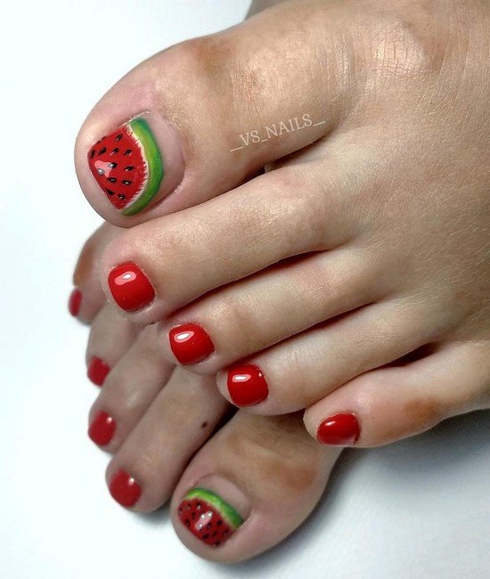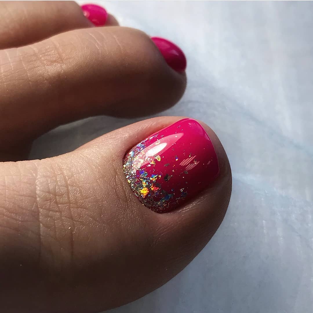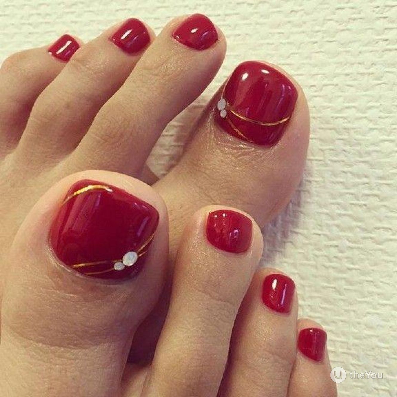 Хотите максимум блеска, оформите все ноготки в красный и добавьте глиттера или рассыпчатых блесток. Это практичный и очень стильный вариант педикюра для любого сезона.
