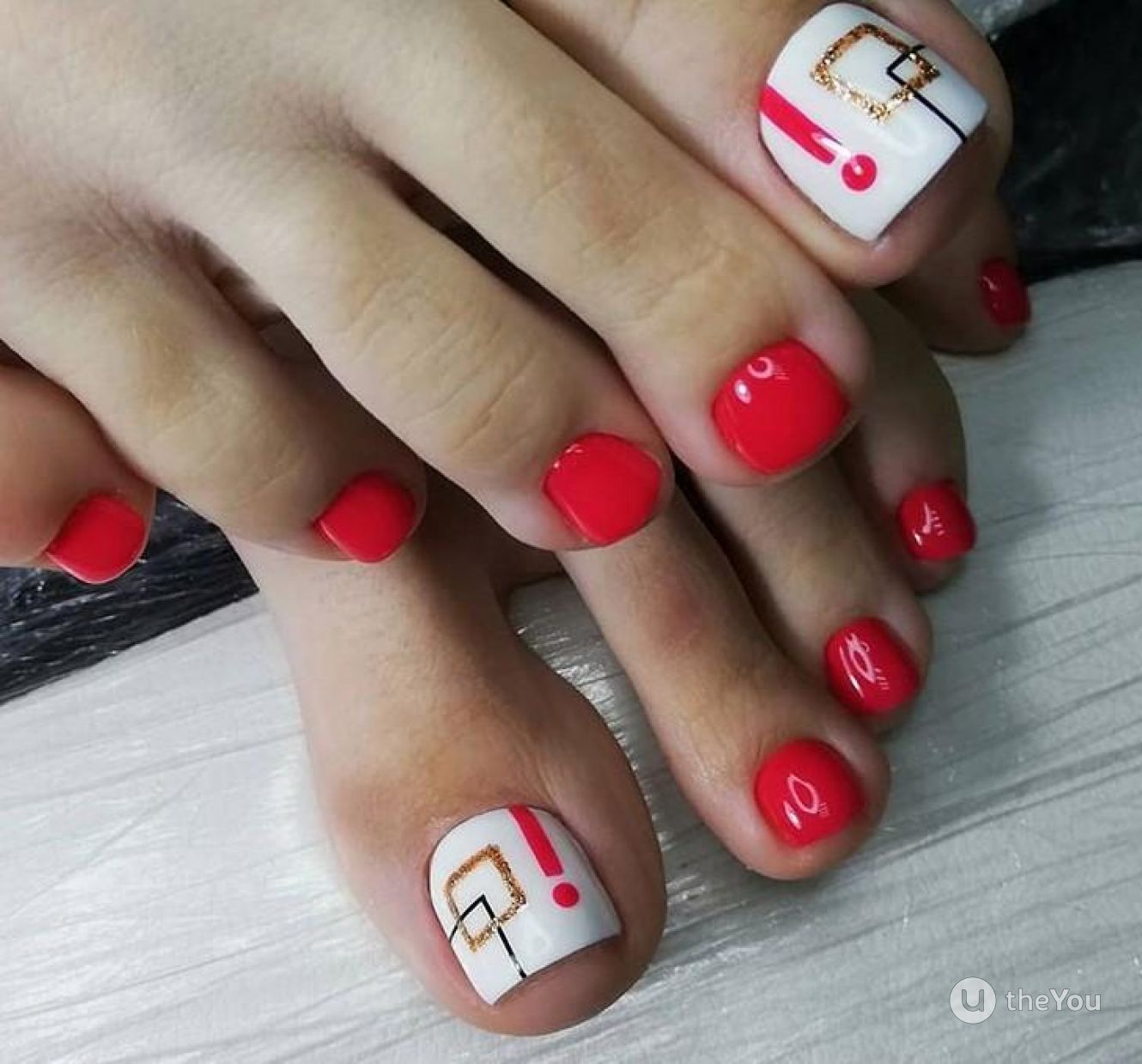 Геометрический рисунок — самый простой способ сделать индивидуальный и необычный педикюр. Линии можно наносить хаотично. Фигуры можно заполнить красным в сочетании с прозрачным лаком или сделать дизайн в стиле колор блок. Линии можно наносить с помощью кисти и контрастного лака или использовать фольгированным полоски с клеевым слоем.