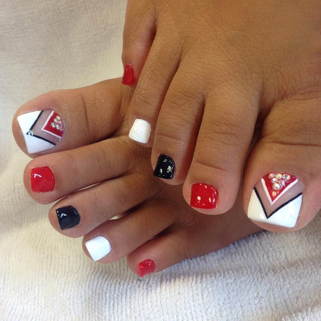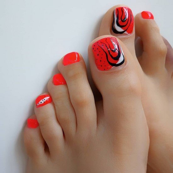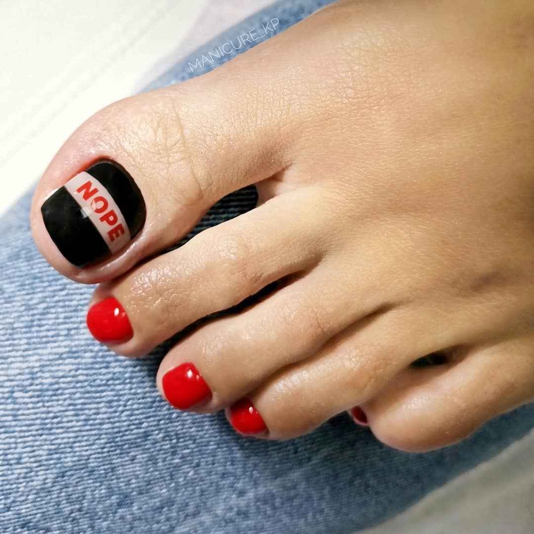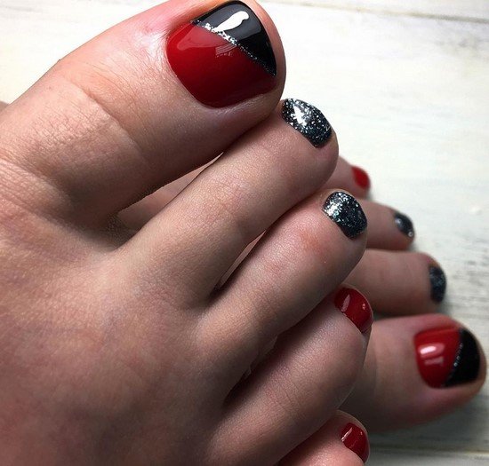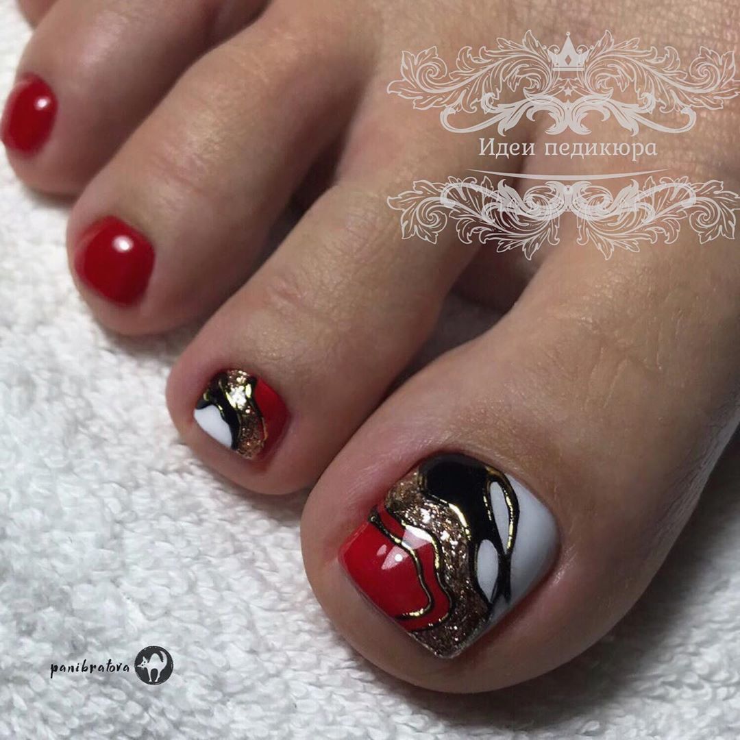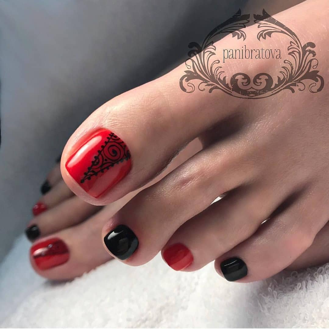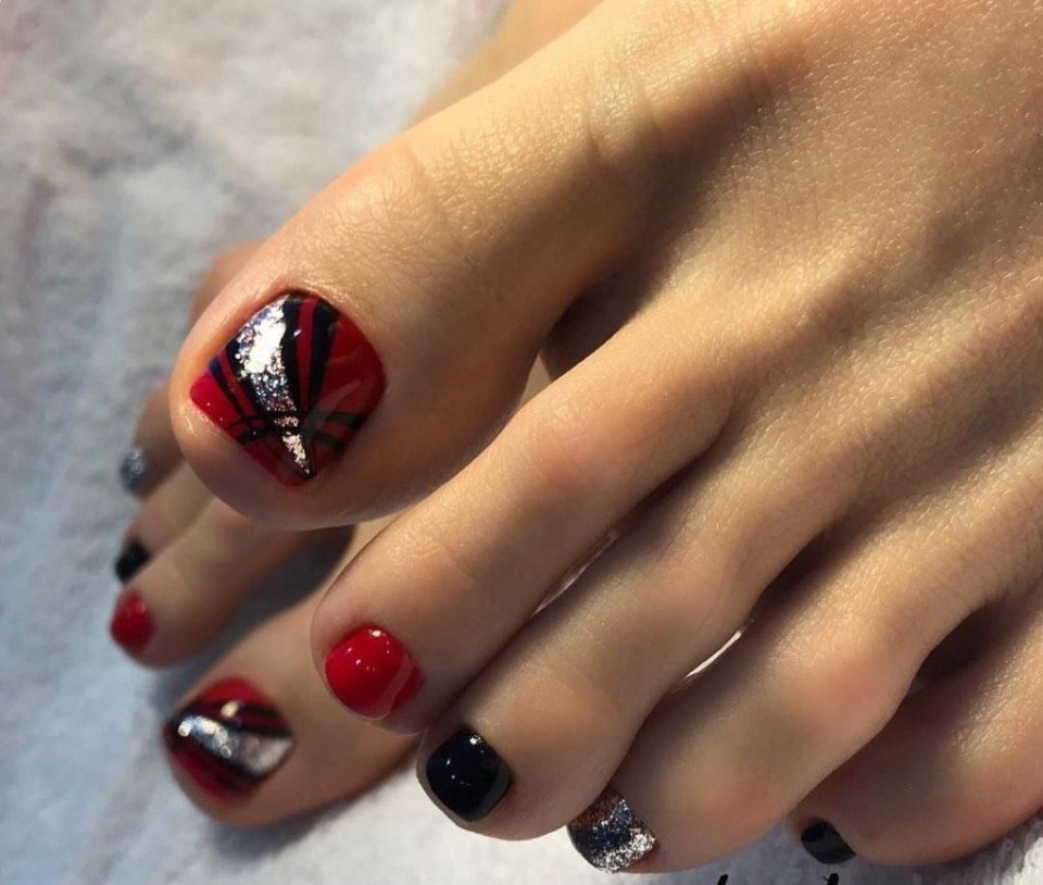 Красный и черный — классическое сочетание. Выбирайте любой из модных вариантов дизайна — геометрия, анималистичный принт, узоры и модная полоска. Кстати, уютный педикюр можно сделать с помощью красно-черной клетки.