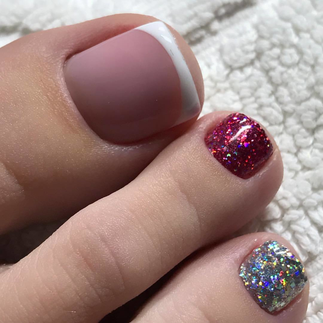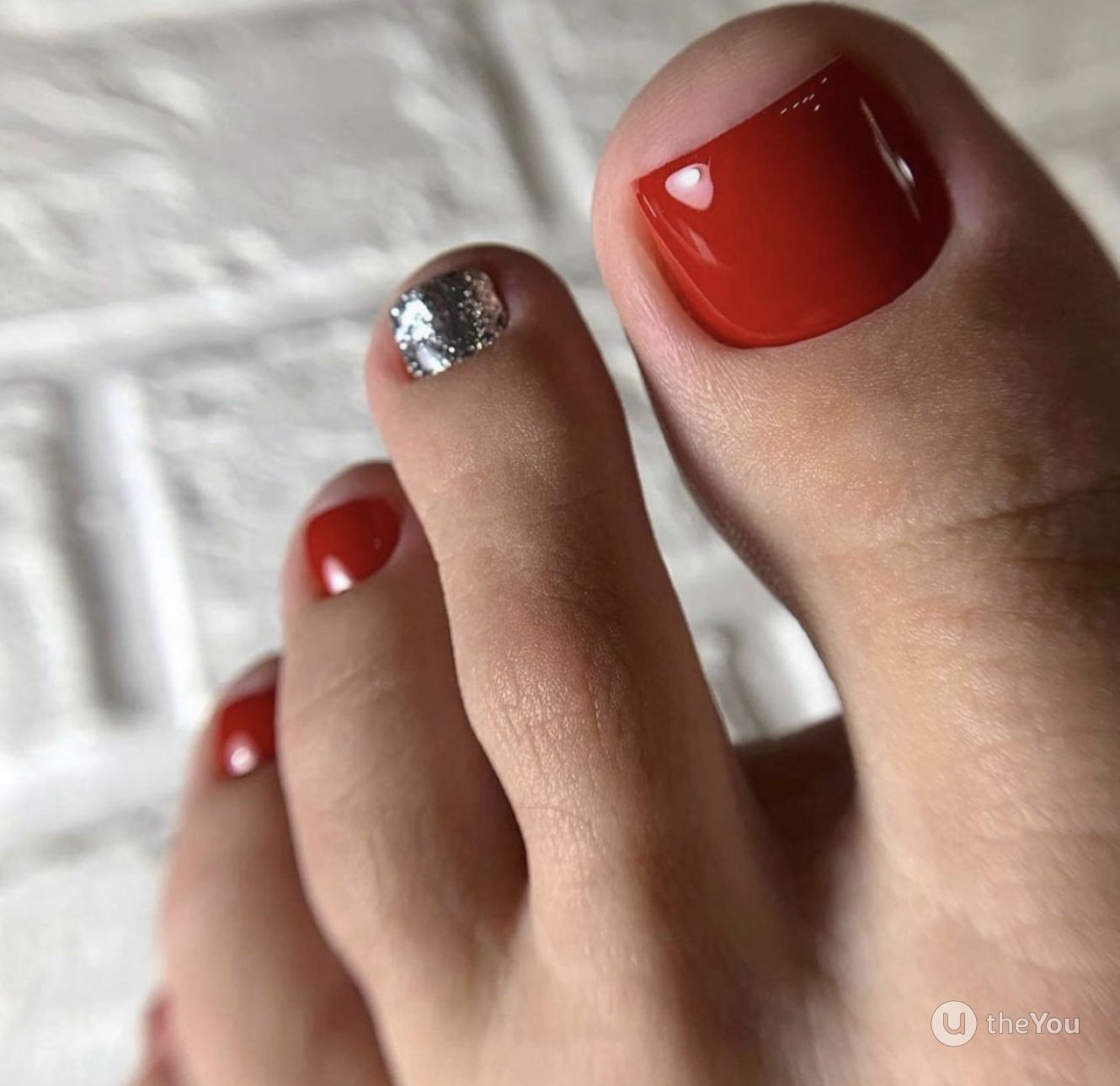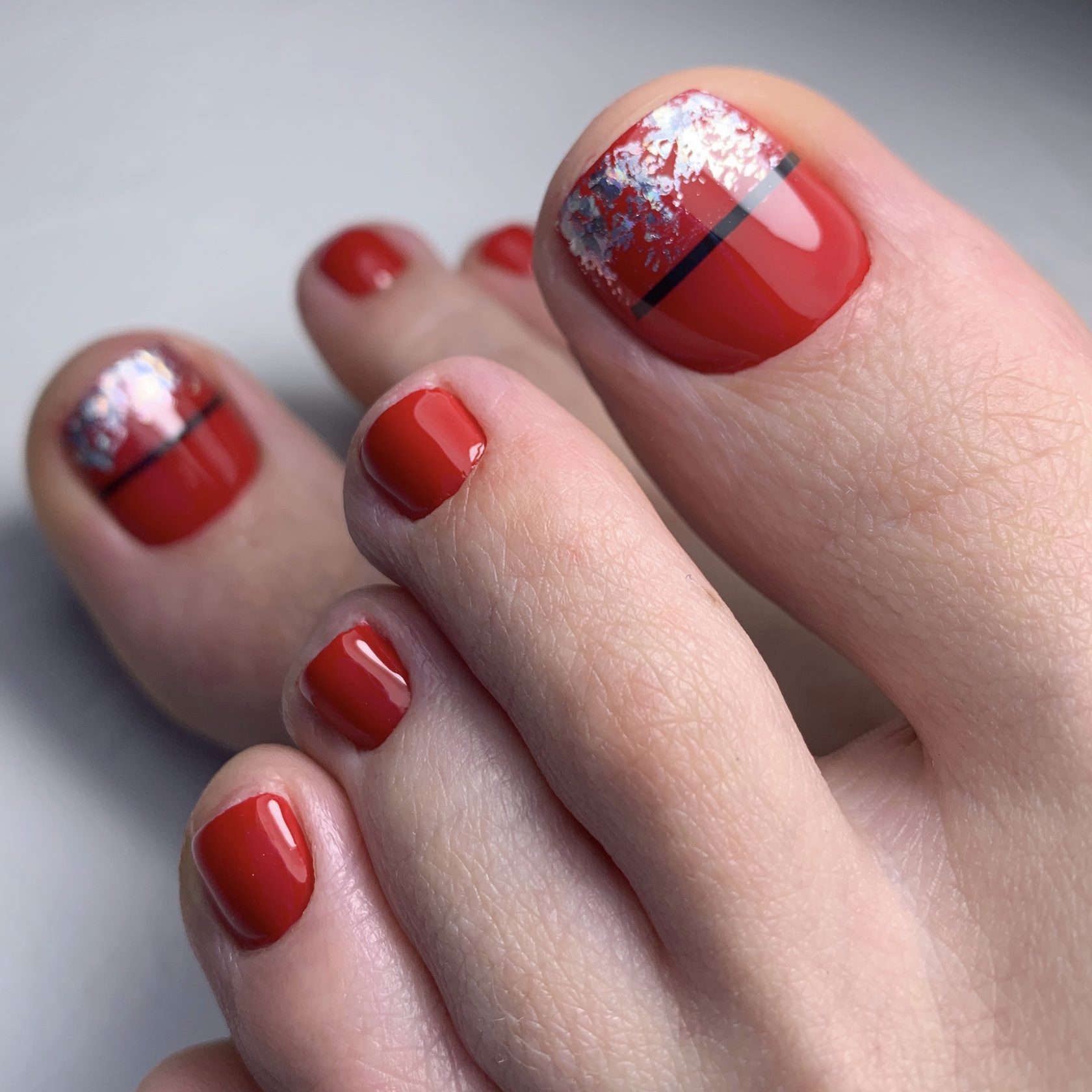 Серебряный отлично сочетается с холодными красными оттенками. Используйте глиттер, фольгу или геометрию в серебряном цвете, чтобы создать стильный праздничный педикюр.