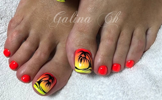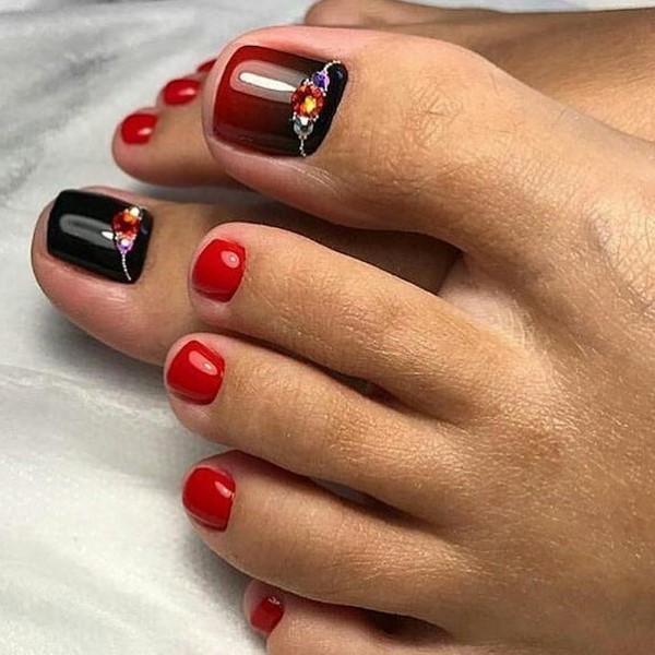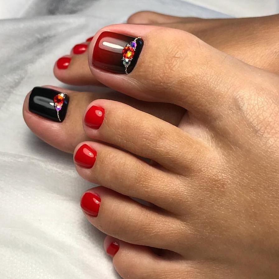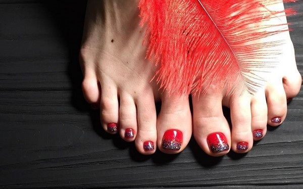 Нежный или страстный педикюр можно сделать с помощью техники плавного перехода цвета — омбре. Вы можете начать практически с черного и довести до алого или сочетать красный с розовым — выбор за вами. Омбре можно расположить как вертикально, так и горизонтально. Еще один вариант — растянуть цвет по ноготкам ноги, делая плавные или довольно явные границы перехода.