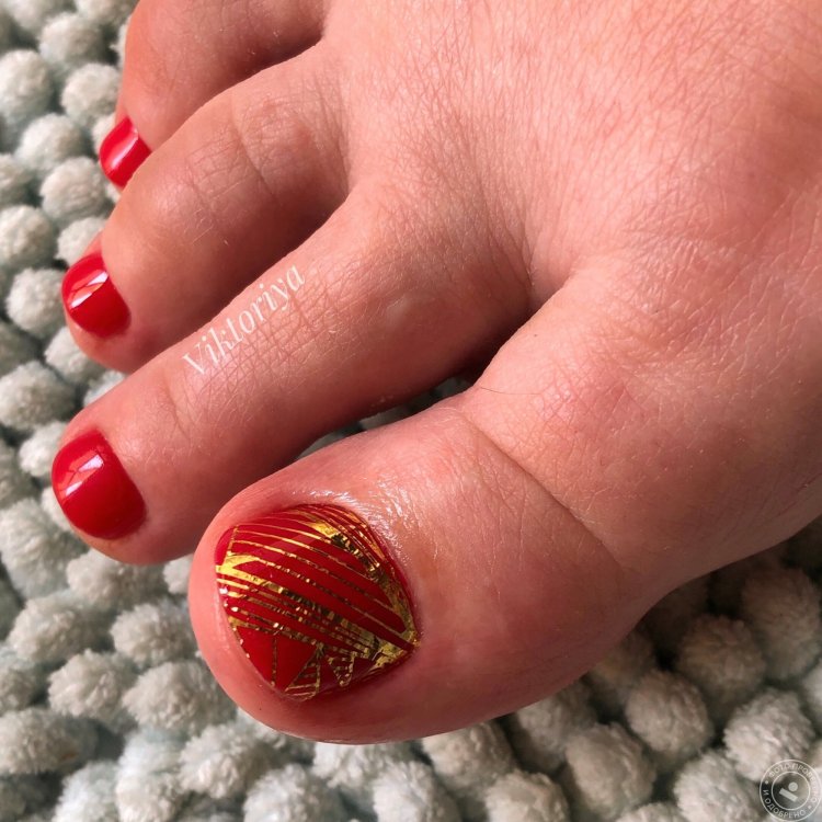 Совет: обратите внимание на фольгированные полоски с клеевым слоем. С их помощью можно сделать педикюр в стиле френч или нанести геометрический рисунок. Только обязательно нанесите закрепляющий топ и тщательно его просушите.