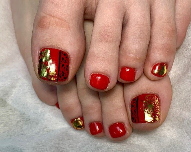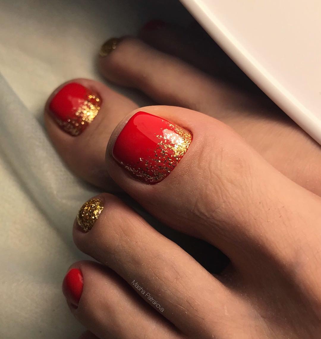 Золото поможет сделать яркий и благородный акцент в педикюре. Например, золотой глиттер — простой и удобный способ создать праздничный красный педикюр.