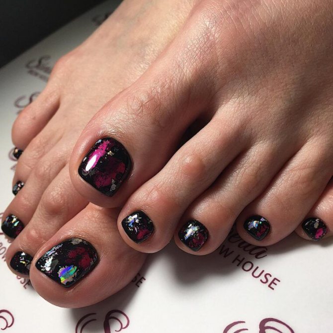 Золотая, серебристая или цветная фольга поможет сделать яркий акцент и не причинит никакого вреда пластине. Сделать такой педикюр можно самостоятельно. Рекомендуем выделять таким образом ноготь большого пальца ноги. Такого акцента будет достаточно.