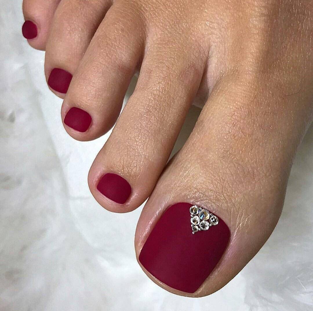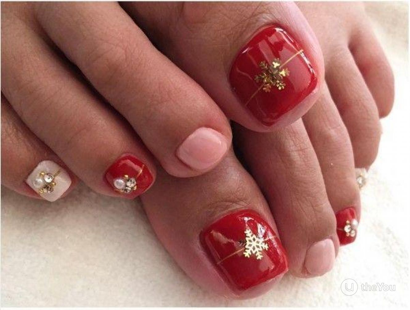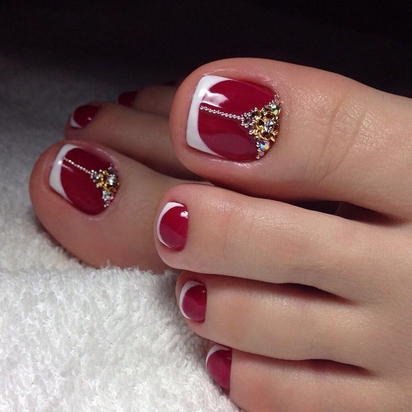 Глянцевый красный лак для педикюра — это обыденно си слишком просто. Блеск и яркость ногтям подарит втирка в красных тонах. Только обязательно сделайте идеальный педикюр, чтобы огрехи пластины не бросались в глаза и не портили впечатление.