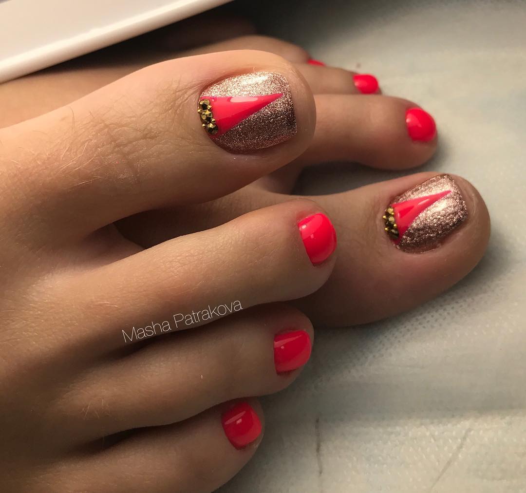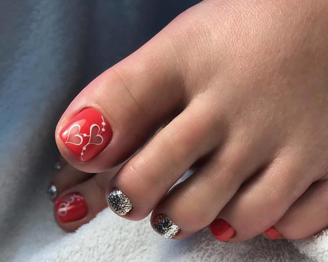 Негатив спейс — техника педикюра, которая позволит сделать глубокий и интересный дизайн. Как правило, негативное пространство располагают только на ногте большого пальца ноги. На остальных сделать это довольно сложно. Чтобы красный педикюр был сногсшибательным, добавьте к этому дизайну немного блесток.