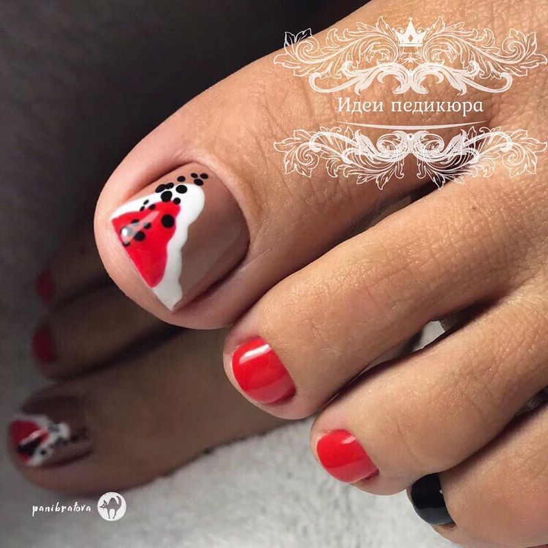 Хотите немного смягчить активный красный в педикюре? Выбирайте ему в дуэт бежевый или нюдовые оттенки. Такой дизайн получится нежным и очень женственным.