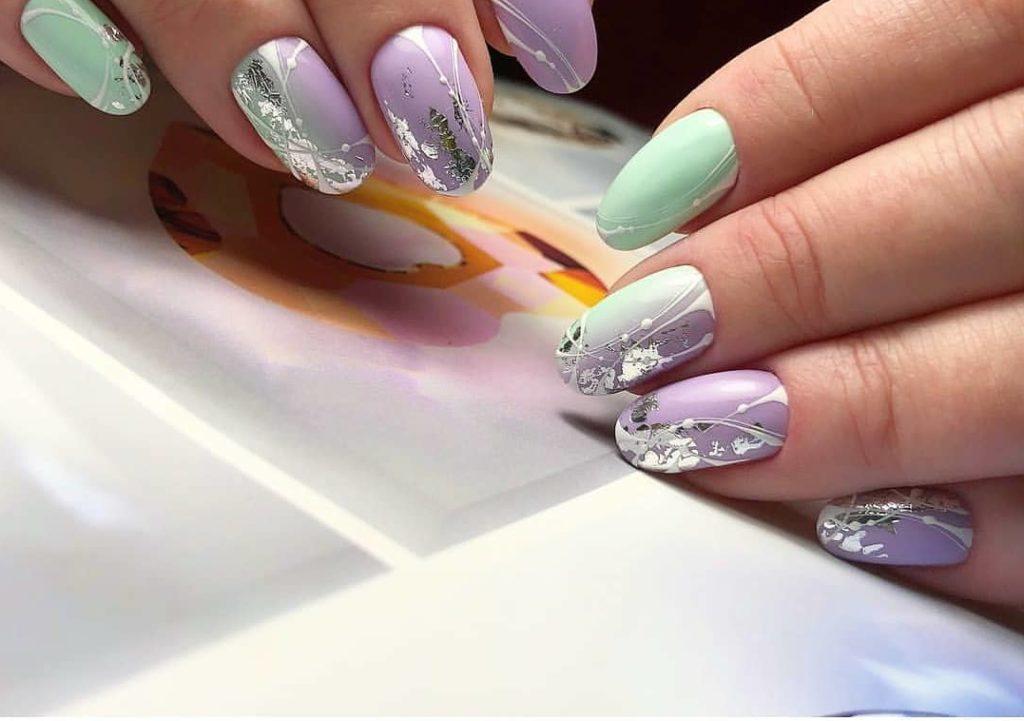Еще один универсальный сосед для лавандового оттенка лака. С ними вы можете создавать красивые дизайны с рисунками, омбре, геометрией и негативным пространством. Отлично смотрится и дизайн разные руки, когда все пальчики окрашены в разные оттенки лака. Если хотите усложнить такой маникюр с лавандовым лаком — добавьте эффект перепелиного яйца.