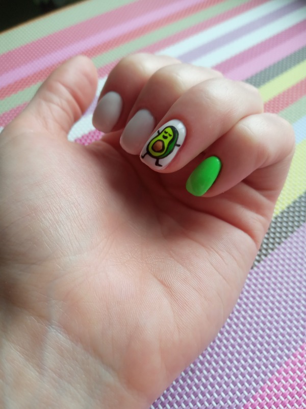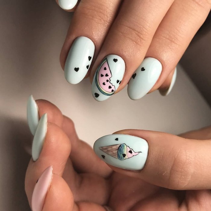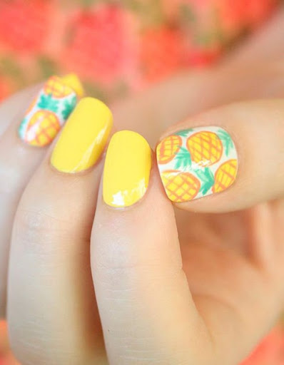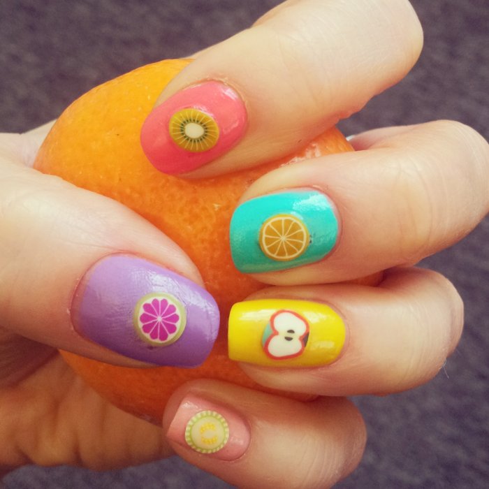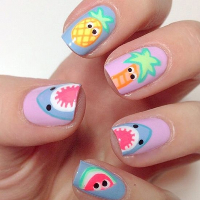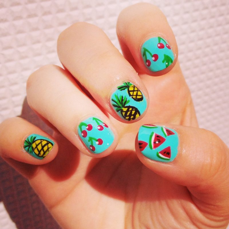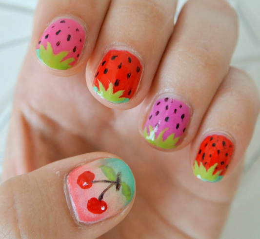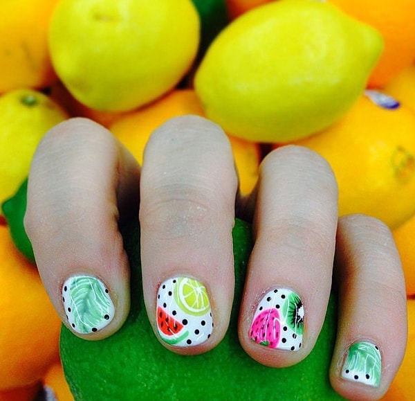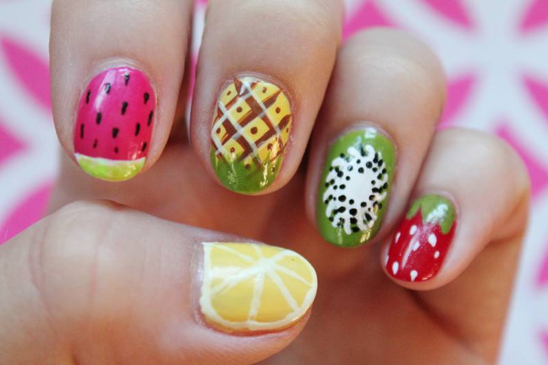 На каждом ноготке может нарисован разный фрукт, или же ассорти на одном.