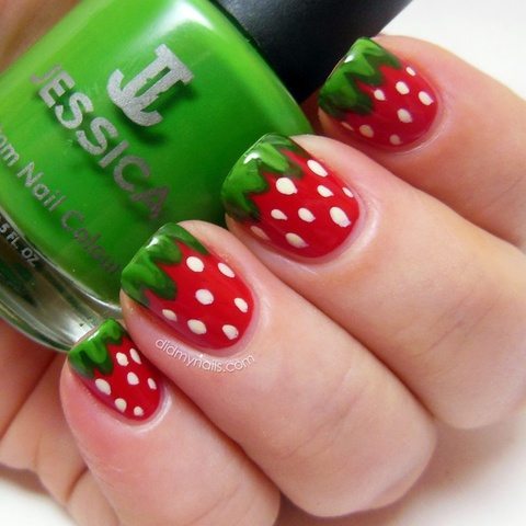 Ногтевые пластины может украшать спелая вишня или множество клубничек. В итоге получается игривый, веселый, детский дизайн. Используются насыщенные цвета.